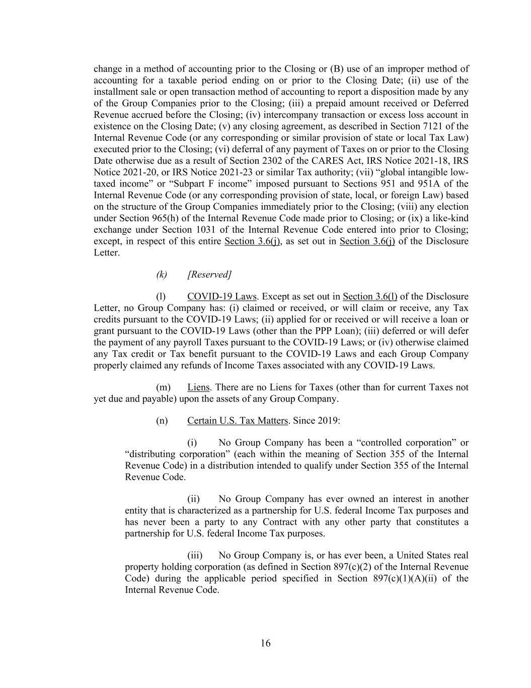 16 change in a method of accounting prior to the Closing or (B) use of an improper method of accounting for a taxable period ending on or prior to the Closing Date; (ii) use of the installment sale or open transaction method of accounting to report a disposition made by any of the Group Companies prior to the Closing; (iii) a prepaid amount received or Deferred Revenue accrued before the Closing; (iv) intercompany transaction or excess loss account in existence on the Closing Date; (v) any closing agreement, as described in Section 7121 of the Internal Revenue Code (or any corresponding or similar provision of state or local Tax Law) executed prior to the Closing; (vi) deferral of any payment of Taxes on or prior to the Closing Date otherwise due as a result of Section 2302 of the CARES Act, IRS Notice 2021-18, IRS Notice 2021-20, or IRS Notice 2021-23 or similar Tax authority; (vii) “global intangible low- taxed income” or “Subpart F income” imposed pursuant to Sections 951 and 951A of the Internal Revenue Code (or any corresponding provision of state, local, or foreign Law) based on the structure of the Group Companies immediately prior to the Closing; (viii) any election under Section 965(h) of the Internal Revenue Code made prior to Closing; or (ix) a like-kind exchange under Section 1031 of the Internal Revenue Code entered into prior to Closing; except, in respect of this entire Section 3.6(j), as set out in Section 3.6(j) of the Disclosure Letter. (k) [Reserved] (l) COVID-19 Laws. Except as set out in Section 3.6(l) of the Disclosure Letter, no Group Company has: (i) claimed or received, or will claim or receive, any Tax credits pursuant to the COVID-19 Laws; (ii) applied for or received or will receive a loan or grant pursuant to the COVID-19 Laws (other than the PPP Loan); (iii) deferred or will defer the payment of any payroll Taxes pursuant to the COVID-19 Laws; or (iv) otherwise claimed any Tax credit or Tax benefit pursuant to the COVID-19 Laws and each Group Company properly claimed any refunds of Income Taxes associated with any COVID-19 Laws. (m) Liens. There are no Liens for Taxes (other than for current Taxes not yet due and payable) upon the assets of any Group Company. (n) Certain U.S. Tax Matters. Since 2019: (i) No Group Company has been a “controlled corporation” or “distributing corporation” (each within the meaning of Section 355 of the Internal Revenue Code) in a distribution intended to qualify under Section 355 of the Internal Revenue Code. (ii) No Group Company has ever owned an interest in another entity that is characterized as a partnership for U.S. federal Income Tax purposes and has never been a party to any Contract with any other party that constitutes a partnership for U.S. federal Income Tax purposes. (iii) No Group Company is, or has ever been, a United States real property holding corporation (as defined in Section 897(c)(2) of the Internal Revenue Code) during the applicable period specified in Section 897(c)(1)(A)(ii) of the Internal Revenue Code.