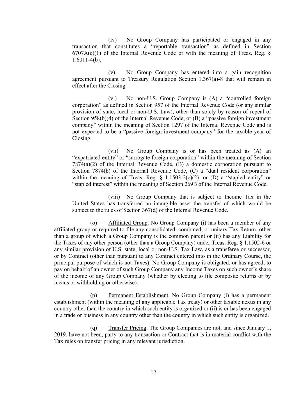 17 (iv) No Group Company has participated or engaged in any transaction that constitutes a “reportable transaction” as defined in Section 6707A(c)(1) of the Internal Revenue Code or with the meaning of Treas. Reg. § 1.6011-4(b). (v) No Group Company has entered into a gain recognition agreement pursuant to Treasury Regulation Section 1.367(a)-8 that will remain in effect after the Closing. (vi) No non-U.S. Group Company is (A) a “controlled foreign corporation” as defined in Section 957 of the Internal Revenue Code (or any similar provision of state, local or non-U.S. Law), other than solely by reason of repeal of Section 958(b)(4) of the Internal Revenue Code, or (B) a “passive foreign investment company” within the meaning of Section 1297 of the Internal Revenue Code and is not expected to be a “passive foreign investment company” for the taxable year of Closing. (vii) No Group Company is or has been treated as (A) an “expatriated entity” or “surrogate foreign corporation” within the meaning of Section 7874(a)(2) of the Internal Revenue Code, (B) a domestic corporation pursuant to Section 7874(b) of the Internal Revenue Code, (C) a “dual resident corporation” within the meaning of Treas. Reg. § 1.1503-2(c)(2), or (D) a “stapled entity” or “stapled interest” within the meaning of Section 269B of the Internal Revenue Code. (viii) No Group Company that is subject to Income Tax in the United States has transferred an intangible asset the transfer of which would be subject to the rules of Section 367(d) of the Internal Revenue Code. (o) Affiliated Group. No Group Company (i) has been a member of any affiliated group or required to file any consolidated, combined, or unitary Tax Return, other than a group of which a Group Company is the common parent or (ii) has any Liability for the Taxes of any other person (other than a Group Company) under Treas. Reg. § 1.1502-6 or any similar provision of U.S. state, local or non-U.S. Tax Law, as a transferee or successor, or by Contract (other than pursuant to any Contract entered into in the Ordinary Course, the principal purpose of which is not Taxes). No Group Company is obligated, or has agreed, to pay on behalf of an owner of such Group Company any Income Taxes on such owner’s share of the income of any Group Company (whether by electing to file composite returns or by means or withholding or otherwise). (p) Permanent Establishment. No Group Company (i) has a permanent establishment (within the meaning of any applicable Tax treaty) or other taxable nexus in any country other than the country in which such entity is organized or (ii) is or has been engaged in a trade or business in any country other than the country in which such entity is organized. (q) Transfer Pricing. The Group Companies are not, and since January 1, 2019, have not been, party to any transaction or Contract that is in material conflict with the Tax rules on transfer pricing in any relevant jurisdiction.