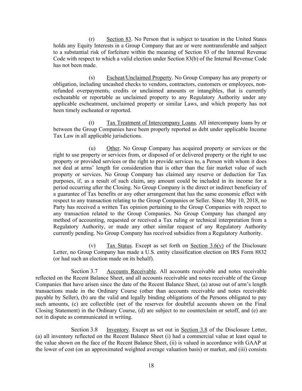 18 (r) Section 83. No Person that is subject to taxation in the United States holds any Equity Interests in a Group Company that are or were nontransferable and subject to a substantial risk of forfeiture within the meaning of Section 83 of the Internal Revenue Code with respect to which a valid election under Section 83(b) of the Internal Revenue Code has not been made. (s) Escheat/Unclaimed Property. No Group Company has any property or obligation, including uncashed checks to vendors, contractors, customers or employees, non- refunded overpayments, credits or unclaimed amounts or intangibles, that is currently escheatable or reportable as unclaimed property to any Regulatory Authority under any applicable escheatment, unclaimed property or similar Laws, and which property has not been timely escheated or reported. (t) Tax Treatment of Intercompany Loans. All intercompany loans by or between the Group Companies have been properly reported as debt under applicable Income Tax Law in all applicable jurisdictions. (u) Other. No Group Company has acquired property or services or the right to use property or services from, or disposed of or delivered property or the right to use property or provided services or the right to provide services to, a Person with whom it does not deal at arms’ length for consideration that is other than the fair market value of such property or services. No Group Company has claimed any reserve or deduction for Tax purposes, if, as a result of such claim, any amount could be included in its income for a period occurring after the Closing. No Group Company is the direct or indirect beneficiary of a guarantee of Tax benefits or any other arrangement that has the same economic effect with respect to any transaction relating to the Group Companies or Seller. Since May 10, 2018, no Party has received a written Tax opinion pertaining to the Group Companies with respect to any transaction related to the Group Companies. No Group Company has changed any method of accounting, requested or received a Tax ruling or technical interpretation from a Regulatory Authority, or made any other similar request of any Regulatory Authority currently pending. No Group Company has received subsidies from a Regulatory Authority. (v) Tax Status. Except as set forth on Section 3.6(v) of the Disclosure Letter, no Group Company has made a U.S. entity classification election on IRS Form 8832 (or had such an election made on its behalf). Section 3.7 Accounts Receivable. All accounts receivable and notes receivable reflected on the Recent Balance Sheet, and all accounts receivable and notes receivable of the Group Companies that have arisen since the date of the Recent Balance Sheet, (a) arose out of arm’s length transactions made in the Ordinary Course (other than accounts receivable and notes receivable payable by Seller), (b) are the valid and legally binding obligations of the Persons obligated to pay such amounts, (c) are collectible (net of the reserves for doubtful accounts shown on the Final Closing Statement) in the Ordinary Course, (d) are subject to no counterclaim or setoff, and (e) are not in dispute as communicated in writing. Section 3.8 Inventory. Except as set out in Section 3.8 of the Disclosure Letter, (a) all inventory reflected on the Recent Balance Sheet (i) had a commercial value at least equal to the value shown on the face of the Recent Balance Sheet, (ii) is valued in accordance with GAAP at the lower of cost (on an approximated weighted average valuation basis) or market, and (iii) consists