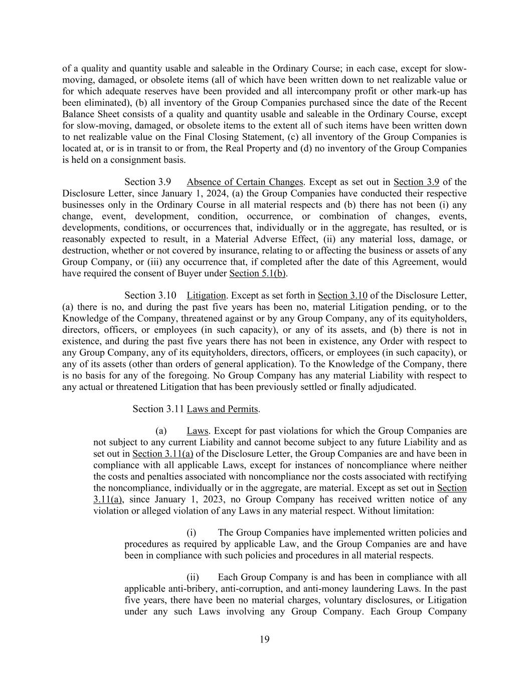 19 of a quality and quantity usable and saleable in the Ordinary Course; in each case, except for slow- moving, damaged, or obsolete items (all of which have been written down to net realizable value or for which adequate reserves have been provided and all intercompany profit or other mark-up has been eliminated), (b) all inventory of the Group Companies purchased since the date of the Recent Balance Sheet consists of a quality and quantity usable and saleable in the Ordinary Course, except for slow-moving, damaged, or obsolete items to the extent all of such items have been written down to net realizable value on the Final Closing Statement, (c) all inventory of the Group Companies is located at, or is in transit to or from, the Real Property and (d) no inventory of the Group Companies is held on a consignment basis. Section 3.9 Absence of Certain Changes. Except as set out in Section 3.9 of the Disclosure Letter, since January 1, 2024, (a) the Group Companies have conducted their respective businesses only in the Ordinary Course in all material respects and (b) there has not been (i) any change, event, development, condition, occurrence, or combination of changes, events, developments, conditions, or occurrences that, individually or in the aggregate, has resulted, or is reasonably expected to result, in a Material Adverse Effect, (ii) any material loss, damage, or destruction, whether or not covered by insurance, relating to or affecting the business or assets of any Group Company, or (iii) any occurrence that, if completed after the date of this Agreement, would have required the consent of Buyer under Section 5.1(b). Section 3.10 Litigation. Except as set forth in Section 3.10 of the Disclosure Letter, (a) there is no, and during the past five years has been no, material Litigation pending, or to the Knowledge of the Company, threatened against or by any Group Company, any of its equityholders, directors, officers, or employees (in such capacity), or any of its assets, and (b) there is not in existence, and during the past five years there has not been in existence, any Order with respect to any Group Company, any of its equityholders, directors, officers, or employees (in such capacity), or any of its assets (other than orders of general application). To the Knowledge of the Company, there is no basis for any of the foregoing. No Group Company has any material Liability with respect to any actual or threatened Litigation that has been previously settled or finally adjudicated. Section 3.11 Laws and Permits. (a) Laws. Except for past violations for which the Group Companies are not subject to any current Liability and cannot become subject to any future Liability and as set out in Section 3.11(a) of the Disclosure Letter, the Group Companies are and have been in compliance with all applicable Laws, except for instances of noncompliance where neither the costs and penalties associated with noncompliance nor the costs associated with rectifying the noncompliance, individually or in the aggregate, are material. Except as set out in Section 3.11(a), since January 1, 2023, no Group Company has received written notice of any violation or alleged violation of any Laws in any material respect. Without limitation: (i) The Group Companies have implemented written policies and procedures as required by applicable Law, and the Group Companies are and have been in compliance with such policies and procedures in all material respects. (ii) Each Group Company is and has been in compliance with all applicable anti-bribery, anti-corruption, and anti-money laundering Laws. In the past five years, there have been no material charges, voluntary disclosures, or Litigation under any such Laws involving any Group Company. Each Group Company