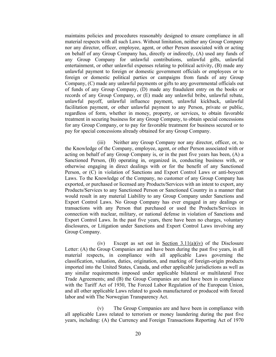 20 maintains policies and procedures reasonably designed to ensure compliance in all material respects with all such Laws. Without limitation, neither any Group Company nor any director, officer, employee, agent, or other Person associated with or acting on behalf of any Group Company has, directly or indirectly, (A) used any funds of any Group Company for unlawful contributions, unlawful gifts, unlawful entertainment, or other unlawful expenses relating to political activity, (B) made any unlawful payment to foreign or domestic government officials or employees or to foreign or domestic political parties or campaigns from funds of any Group Company, (C) made any unlawful payments or gifts to any governmental officials out of funds of any Group Company, (D) made any fraudulent entry on the books or records of any Group Company, or (E) made any unlawful bribe, unlawful rebate, unlawful payoff, unlawful influence payment, unlawful kickback, unlawful facilitation payment, or other unlawful payment to any Person, private or public, regardless of form, whether in money, property, or services, to obtain favorable treatment in securing business for any Group Company, to obtain special concessions for any Group Company, or to pay for favorable treatment for business secured or to pay for special concessions already obtained for any Group Company. (iii) Neither any Group Company nor any director, officer, or, to the Knowledge of the Company, employee, agent, or other Person associated with or acting on behalf of any Group Company is, or in the past five years has been, (A) a Sanctioned Person, (B) operating in, organized in, conducting business with, or otherwise engaging in direct dealings with or for the benefit of any Sanctioned Person, or (C) in violation of Sanctions and Export Control Laws or anti-boycott Laws. To the Knowledge of the Company, no customer of any Group Company has exported, or purchased or licensed any Products/Services with an intent to export, any Products/Services to any Sanctioned Person or Sanctioned Country in a manner that would result in any material Liability to any Group Company under Sanctions and Export Control Laws. No Group Company has ever engaged in any dealings or transactions with any Person that purchased or used the Products/Services in connection with nuclear, military, or national defense in violation of Sanctions and Export Control Laws. In the past five years, there have been no charges, voluntary disclosures, or Litigation under Sanctions and Export Control Laws involving any Group Company. (iv) Except as set out in Section 3.11(a)(iv) of the Disclosure Letter: (A) the Group Companies are and have been during the past five years, in all material respects, in compliance with all applicable Laws governing the classification, valuation, duties, origination, and marking of foreign-origin products imported into the United States, Canada, and other applicable jurisdictions as well as any similar requirements imposed under applicable bilateral or multilateral Free Trade Agreements; and (B) the Group Companies are and have been in compliance with the Tariff Act of 1930, The Forced Labor Regulation of the European Union, and all other applicable Laws related to goods manufactured or produced with forced labor and with The Norwegian Transparency Act. (v) The Group Companies are and have been in compliance with all applicable Laws related to terrorism or money laundering during the past five years, including: (A) the Currency and Foreign Transactions Reporting Act of 1970