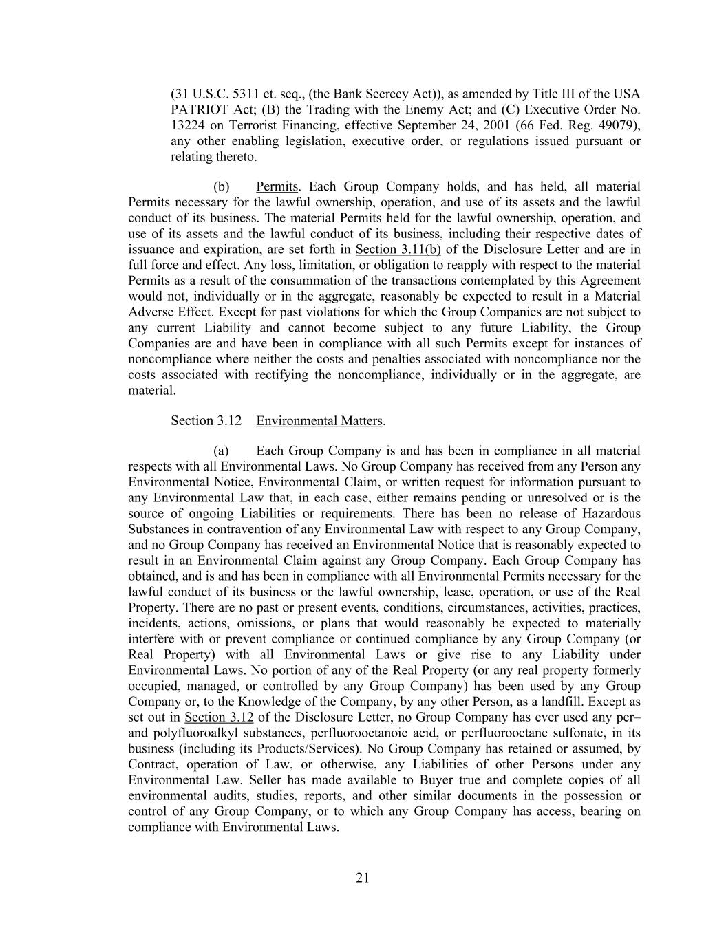 21 (31 U.S.C. 5311 et. seq., (the Bank Secrecy Act)), as amended by Title III of the USA PATRIOT Act; (B) the Trading with the Enemy Act; and (C) Executive Order No. 13224 on Terrorist Financing, effective September 24, 2001 (66 Fed. Reg. 49079), any other enabling legislation, executive order, or regulations issued pursuant or relating thereto. (b) Permits. Each Group Company holds, and has held, all material Permits necessary for the lawful ownership, operation, and use of its assets and the lawful conduct of its business. The material Permits held for the lawful ownership, operation, and use of its assets and the lawful conduct of its business, including their respective dates of issuance and expiration, are set forth in Section 3.11(b) of the Disclosure Letter and are in full force and effect. Any loss, limitation, or obligation to reapply with respect to the material Permits as a result of the consummation of the transactions contemplated by this Agreement would not, individually or in the aggregate, reasonably be expected to result in a Material Adverse Effect. Except for past violations for which the Group Companies are not subject to any current Liability and cannot become subject to any future Liability, the Group Companies are and have been in compliance with all such Permits except for instances of noncompliance where neither the costs and penalties associated with noncompliance nor the costs associated with rectifying the noncompliance, individually or in the aggregate, are material. Section 3.12 Environmental Matters. (a) Each Group Company is and has been in compliance in all material respects with all Environmental Laws. No Group Company has received from any Person any Environmental Notice, Environmental Claim, or written request for information pursuant to any Environmental Law that, in each case, either remains pending or unresolved or is the source of ongoing Liabilities or requirements. There has been no release of Hazardous Substances in contravention of any Environmental Law with respect to any Group Company, and no Group Company has received an Environmental Notice that is reasonably expected to result in an Environmental Claim against any Group Company. Each Group Company has obtained, and is and has been in compliance with all Environmental Permits necessary for the lawful conduct of its business or the lawful ownership, lease, operation, or use of the Real Property. There are no past or present events, conditions, circumstances, activities, practices, incidents, actions, omissions, or plans that would reasonably be expected to materially interfere with or prevent compliance or continued compliance by any Group Company (or Real Property) with all Environmental Laws or give rise to any Liability under Environmental Laws. No portion of any of the Real Property (or any real property formerly occupied, managed, or controlled by any Group Company) has been used by any Group Company or, to the Knowledge of the Company, by any other Person, as a landfill. Except as set out in Section 3.12 of the Disclosure Letter, no Group Company has ever used any per– and polyfluoroalkyl substances, perfluorooctanoic acid, or perfluorooctane sulfonate, in its business (including its Products/Services). No Group Company has retained or assumed, by Contract, operation of Law, or otherwise, any Liabilities of other Persons under any Environmental Law. Seller has made available to Buyer true and complete copies of all environmental audits, studies, reports, and other similar documents in the possession or control of any Group Company, or to which any Group Company has access, bearing on compliance with Environmental Laws.