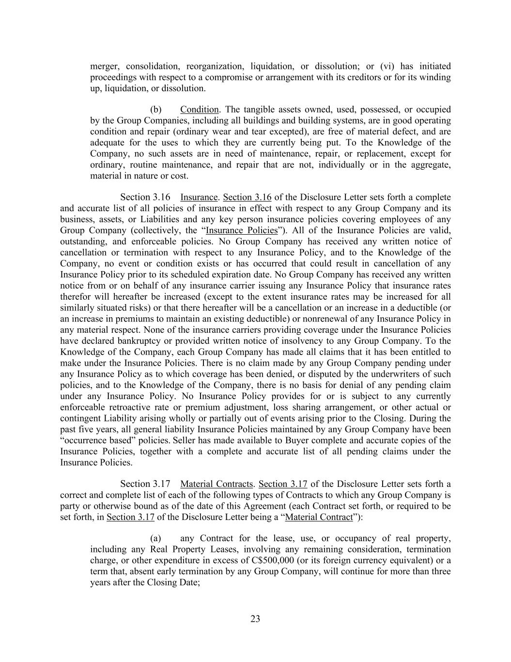 23 merger, consolidation, reorganization, liquidation, or dissolution; or (vi) has initiated proceedings with respect to a compromise or arrangement with its creditors or for its winding up, liquidation, or dissolution. (b) Condition. The tangible assets owned, used, possessed, or occupied by the Group Companies, including all buildings and building systems, are in good operating condition and repair (ordinary wear and tear excepted), are free of material defect, and are adequate for the uses to which they are currently being put. To the Knowledge of the Company, no such assets are in need of maintenance, repair, or replacement, except for ordinary, routine maintenance, and repair that are not, individually or in the aggregate, material in nature or cost. Section 3.16 Insurance. Section 3.16 of the Disclosure Letter sets forth a complete and accurate list of all policies of insurance in effect with respect to any Group Company and its business, assets, or Liabilities and any key person insurance policies covering employees of any Group Company (collectively, the “Insurance Policies”). All of the Insurance Policies are valid, outstanding, and enforceable policies. No Group Company has received any written notice of cancellation or termination with respect to any Insurance Policy, and to the Knowledge of the Company, no event or condition exists or has occurred that could result in cancellation of any Insurance Policy prior to its scheduled expiration date. No Group Company has received any written notice from or on behalf of any insurance carrier issuing any Insurance Policy that insurance rates therefor will hereafter be increased (except to the extent insurance rates may be increased for all similarly situated risks) or that there hereafter will be a cancellation or an increase in a deductible (or an increase in premiums to maintain an existing deductible) or nonrenewal of any Insurance Policy in any material respect. None of the insurance carriers providing coverage under the Insurance Policies have declared bankruptcy or provided written notice of insolvency to any Group Company. To the Knowledge of the Company, each Group Company has made all claims that it has been entitled to make under the Insurance Policies. There is no claim made by any Group Company pending under any Insurance Policy as to which coverage has been denied, or disputed by the underwriters of such policies, and to the Knowledge of the Company, there is no basis for denial of any pending claim under any Insurance Policy. No Insurance Policy provides for or is subject to any currently enforceable retroactive rate or premium adjustment, loss sharing arrangement, or other actual or contingent Liability arising wholly or partially out of events arising prior to the Closing. During the past five years, all general liability Insurance Policies maintained by any Group Company have been “occurrence based” policies. Seller has made available to Buyer complete and accurate copies of the Insurance Policies, together with a complete and accurate list of all pending claims under the Insurance Policies. Section 3.17 Material Contracts. Section 3.17 of the Disclosure Letter sets forth a correct and complete list of each of the following types of Contracts to which any Group Company is party or otherwise bound as of the date of this Agreement (each Contract set forth, or required to be set forth, in Section 3.17 of the Disclosure Letter being a “Material Contract”): (a) any Contract for the lease, use, or occupancy of real property, including any Real Property Leases, involving any remaining consideration, termination charge, or other expenditure in excess of C$500,000 (or its foreign currency equivalent) or a term that, absent early termination by any Group Company, will continue for more than three years after the Closing Date;