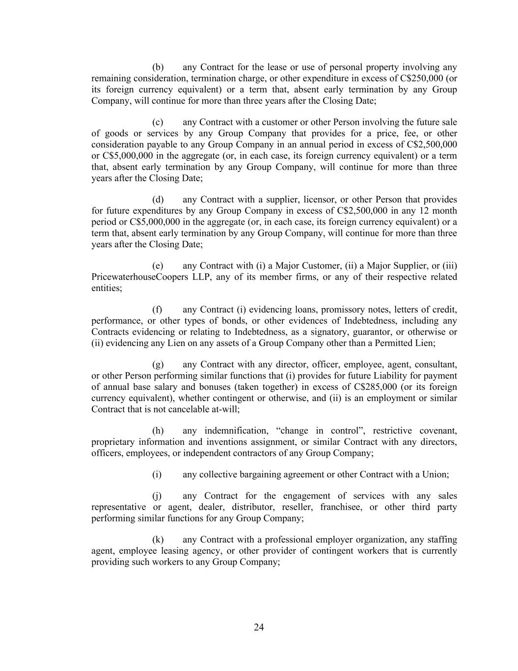 24 (b) any Contract for the lease or use of personal property involving any remaining consideration, termination charge, or other expenditure in excess of C$250,000 (or its foreign currency equivalent) or a term that, absent early termination by any Group Company, will continue for more than three years after the Closing Date; (c) any Contract with a customer or other Person involving the future sale of goods or services by any Group Company that provides for a price, fee, or other consideration payable to any Group Company in an annual period in excess of C$2,500,000 or C$5,000,000 in the aggregate (or, in each case, its foreign currency equivalent) or a term that, absent early termination by any Group Company, will continue for more than three years after the Closing Date; (d) any Contract with a supplier, licensor, or other Person that provides for future expenditures by any Group Company in excess of C$2,500,000 in any 12 month period or C$5,000,000 in the aggregate (or, in each case, its foreign currency equivalent) or a term that, absent early termination by any Group Company, will continue for more than three years after the Closing Date; (e) any Contract with (i) a Major Customer, (ii) a Major Supplier, or (iii) PricewaterhouseCoopers LLP, any of its member firms, or any of their respective related entities; (f) any Contract (i) evidencing loans, promissory notes, letters of credit, performance, or other types of bonds, or other evidences of Indebtedness, including any Contracts evidencing or relating to Indebtedness, as a signatory, guarantor, or otherwise or (ii) evidencing any Lien on any assets of a Group Company other than a Permitted Lien; (g) any Contract with any director, officer, employee, agent, consultant, or other Person performing similar functions that (i) provides for future Liability for payment of annual base salary and bonuses (taken together) in excess of C$285,000 (or its foreign currency equivalent), whether contingent or otherwise, and (ii) is an employment or similar Contract that is not cancelable at-will; (h) any indemnification, “change in control”, restrictive covenant, proprietary information and inventions assignment, or similar Contract with any directors, officers, employees, or independent contractors of any Group Company; (i) any collective bargaining agreement or other Contract with a Union; (j) any Contract for the engagement of services with any sales representative or agent, dealer, distributor, reseller, franchisee, or other third party performing similar functions for any Group Company; (k) any Contract with a professional employer organization, any staffing agent, employee leasing agency, or other provider of contingent workers that is currently providing such workers to any Group Company;