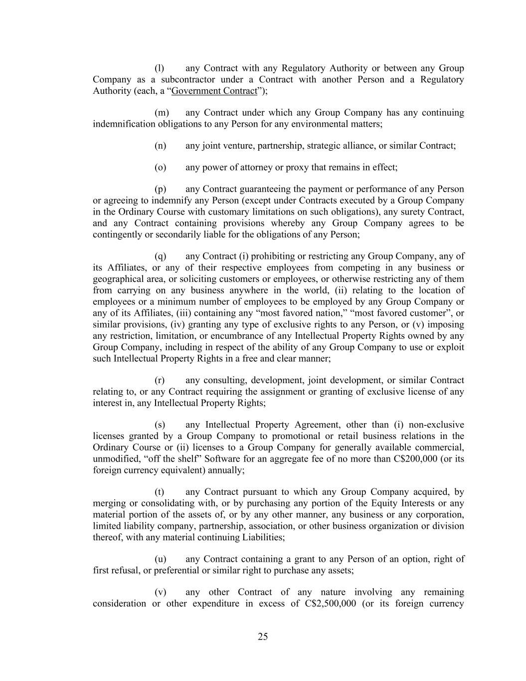 25 (l) any Contract with any Regulatory Authority or between any Group Company as a subcontractor under a Contract with another Person and a Regulatory Authority (each, a “Government Contract”); (m) any Contract under which any Group Company has any continuing indemnification obligations to any Person for any environmental matters; (n) any joint venture, partnership, strategic alliance, or similar Contract; (o) any power of attorney or proxy that remains in effect; (p) any Contract guaranteeing the payment or performance of any Person or agreeing to indemnify any Person (except under Contracts executed by a Group Company in the Ordinary Course with customary limitations on such obligations), any surety Contract, and any Contract containing provisions whereby any Group Company agrees to be contingently or secondarily liable for the obligations of any Person; (q) any Contract (i) prohibiting or restricting any Group Company, any of its Affiliates, or any of their respective employees from competing in any business or geographical area, or soliciting customers or employees, or otherwise restricting any of them from carrying on any business anywhere in the world, (ii) relating to the location of employees or a minimum number of employees to be employed by any Group Company or any of its Affiliates, (iii) containing any “most favored nation,” “most favored customer”, or similar provisions, (iv) granting any type of exclusive rights to any Person, or (v) imposing any restriction, limitation, or encumbrance of any Intellectual Property Rights owned by any Group Company, including in respect of the ability of any Group Company to use or exploit such Intellectual Property Rights in a free and clear manner; (r) any consulting, development, joint development, or similar Contract relating to, or any Contract requiring the assignment or granting of exclusive license of any interest in, any Intellectual Property Rights; (s) any Intellectual Property Agreement, other than (i) non-exclusive licenses granted by a Group Company to promotional or retail business relations in the Ordinary Course or (ii) licenses to a Group Company for generally available commercial, unmodified, “off the shelf” Software for an aggregate fee of no more than C$200,000 (or its foreign currency equivalent) annually; (t) any Contract pursuant to which any Group Company acquired, by merging or consolidating with, or by purchasing any portion of the Equity Interests or any material portion of the assets of, or by any other manner, any business or any corporation, limited liability company, partnership, association, or other business organization or division thereof, with any material continuing Liabilities; (u) any Contract containing a grant to any Person of an option, right of first refusal, or preferential or similar right to purchase any assets; (v) any other Contract of any nature involving any remaining consideration or other expenditure in excess of C$2,500,000 (or its foreign currency