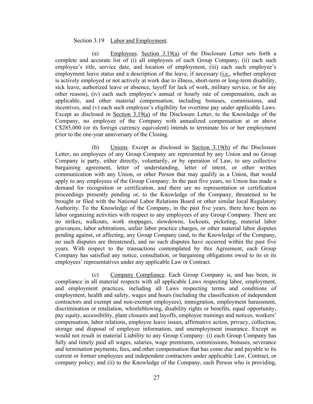 27 Section 3.19 Labor and Employment. (a) Employees. Section 3.19(a) of the Disclosure Letter sets forth a complete and accurate list of (i) all employees of each Group Company, (ii) each such employee’s title, service date, and location of employment, (iii) each such employee’s employment leave status and a description of the leave, if necessary (i.e., whether employee is actively employed or not actively at work due to illness, short-term or long-term disability, sick leave, authorized leave or absence, layoff for lack of work, military service, or for any other reason), (iv) each such employee’s annual or hourly rate of compensation, each as applicable, and other material compensation, including bonuses, commissions, and incentives, and (v) each such employee’s eligibility for overtime pay under applicable Laws. Except as disclosed in Section 3.19(a) of the Disclosure Letter, to the Knowledge of the Company, no employee of the Company with annualized compensation at or above C$285,000 (or its foreign currency equivalent) intends to terminate his or her employment prior to the one-year anniversary of the Closing. (b) Unions. Except as disclosed in Section 3.19(b) of the Disclosure Letter, no employees of any Group Company are represented by any Union and no Group Company is party, either directly, voluntarily, or by operation of Law, to any collective bargaining agreement, letter of understanding, letter of intent, or other written communication with any Union, or other Person that may qualify as a Union, that would apply to any employees of the Group Company. In the past five years, no Union has made a demand for recognition or certification, and there are no representation or certification proceedings presently pending or, to the Knowledge of the Company, threatened to be brought or filed with the National Labor Relations Board or other similar local Regulatory Authority. To the Knowledge of the Company, in the past five years, there have been no labor organizing activities with respect to any employees of any Group Company. There are no strikes, walkouts, work stoppages, slowdowns, lockouts, picketing, material labor grievances, labor arbitrations, unfair labor practice charges, or other material labor disputes pending against, or affecting, any Group Company (and, to the Knowledge of the Company, no such disputes are threatened), and no such disputes have occurred within the past five years. With respect to the transactions contemplated by this Agreement, each Group Company has satisfied any notice, consultation, or bargaining obligations owed to its or its employees’ representatives under any applicable Law or Contract. (c) Company Compliance. Each Group Company is, and has been, in compliance in all material respects with all applicable Laws respecting labor, employment, and employment practices, including all Laws respecting terms and conditions of employment, health and safety, wages and hours (including the classification of independent contractors and exempt and non-exempt employees), immigration, employment harassment, discrimination or retaliation, whistleblowing, disability rights or benefits, equal opportunity, pay equity, accessibility, plant closures and layoffs, employee trainings and notices, workers’ compensation, labor relations, employee leave issues, affirmative action, privacy, collection, storage and disposal of employee information, and unemployment insurance. Except as would not result in material Liability to any Group Company: (i) each Group Company has fully and timely paid all wages, salaries, wage premiums, commissions, bonuses, severance and termination payments, fees, and other compensation that has come due and payable to its current or former employees and independent contractors under applicable Law, Contract, or company policy; and (ii) to the Knowledge of the Company, each Person who is providing,