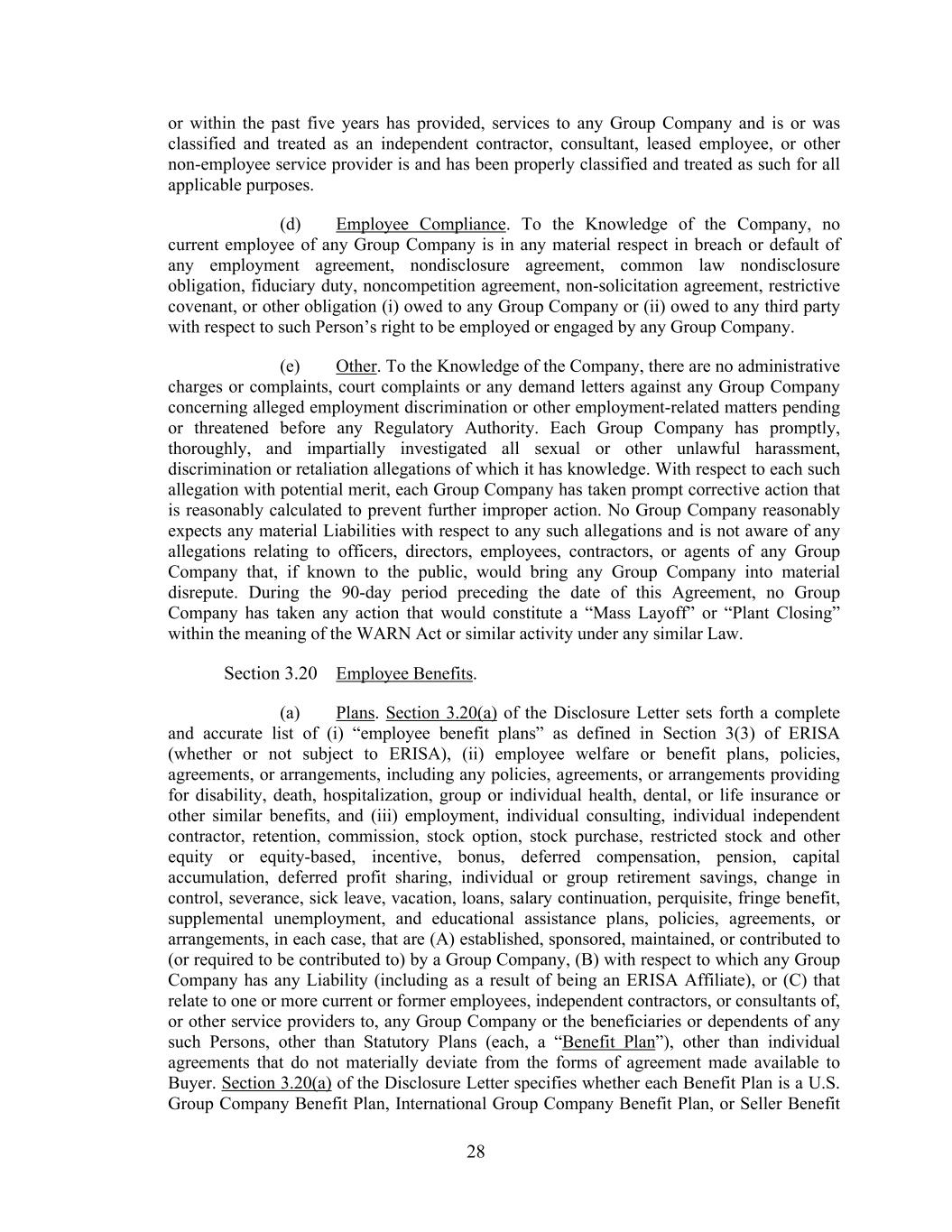 28 or within the past five years has provided, services to any Group Company and is or was classified and treated as an independent contractor, consultant, leased employee, or other non-employee service provider is and has been properly classified and treated as such for all applicable purposes. (d) Employee Compliance. To the Knowledge of the Company, no current employee of any Group Company is in any material respect in breach or default of any employment agreement, nondisclosure agreement, common law nondisclosure obligation, fiduciary duty, noncompetition agreement, non-solicitation agreement, restrictive covenant, or other obligation (i) owed to any Group Company or (ii) owed to any third party with respect to such Person’s right to be employed or engaged by any Group Company. (e) Other. To the Knowledge of the Company, there are no administrative charges or complaints, court complaints or any demand letters against any Group Company concerning alleged employment discrimination or other employment-related matters pending or threatened before any Regulatory Authority. Each Group Company has promptly, thoroughly, and impartially investigated all sexual or other unlawful harassment, discrimination or retaliation allegations of which it has knowledge. With respect to each such allegation with potential merit, each Group Company has taken prompt corrective action that is reasonably calculated to prevent further improper action. No Group Company reasonably expects any material Liabilities with respect to any such allegations and is not aware of any allegations relating to officers, directors, employees, contractors, or agents of any Group Company that, if known to the public, would bring any Group Company into material disrepute. During the 90-day period preceding the date of this Agreement, no Group Company has taken any action that would constitute a “Mass Layoff” or “Plant Closing” within the meaning of the WARN Act or similar activity under any similar Law. Section 3.20 Employee Benefits. (a) Plans. Section 3.20(a) of the Disclosure Letter sets forth a complete and accurate list of (i) “employee benefit plans” as defined in Section 3(3) of ERISA (whether or not subject to ERISA), (ii) employee welfare or benefit plans, policies, agreements, or arrangements, including any policies, agreements, or arrangements providing for disability, death, hospitalization, group or individual health, dental, or life insurance or other similar benefits, and (iii) employment, individual consulting, individual independent contractor, retention, commission, stock option, stock purchase, restricted stock and other equity or equity-based, incentive, bonus, deferred compensation, pension, capital accumulation, deferred profit sharing, individual or group retirement savings, change in control, severance, sick leave, vacation, loans, salary continuation, perquisite, fringe benefit, supplemental unemployment, and educational assistance plans, policies, agreements, or arrangements, in each case, that are (A) established, sponsored, maintained, or contributed to (or required to be contributed to) by a Group Company, (B) with respect to which any Group Company has any Liability (including as a result of being an ERISA Affiliate), or (C) that relate to one or more current or former employees, independent contractors, or consultants of, or other service providers to, any Group Company or the beneficiaries or dependents of any such Persons, other than Statutory Plans (each, a “Benefit Plan”), other than individual agreements that do not materially deviate from the forms of agreement made available to Buyer. Section 3.20(a) of the Disclosure Letter specifies whether each Benefit Plan is a U.S. Group Company Benefit Plan, International Group Company Benefit Plan, or Seller Benefit