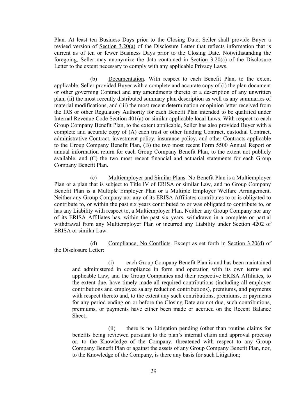 29 Plan. At least ten Business Days prior to the Closing Date, Seller shall provide Buyer a revised version of Section 3.20(a) of the Disclosure Letter that reflects information that is current as of ten or fewer Business Days prior to the Closing Date. Notwithstanding the foregoing, Seller may anonymize the data contained in Section 3.20(a) of the Disclosure Letter to the extent necessary to comply with any applicable Privacy Laws. (b) Documentation. With respect to each Benefit Plan, to the extent applicable, Seller provided Buyer with a complete and accurate copy of (i) the plan document or other governing Contract and any amendments thereto or a description of any unwritten plan, (ii) the most recently distributed summary plan description as well as any summaries of material modifications, and (iii) the most recent determination or opinion letter received from the IRS or other Regulatory Authority for each Benefit Plan intended to be qualified under Internal Revenue Code Section 401(a) or similar applicable local Laws. With respect to each Group Company Benefit Plan, to the extent applicable, Seller has also provided Buyer with a complete and accurate copy of (A) each trust or other funding Contract, custodial Contract, administrative Contract, investment policy, insurance policy, and other Contracts applicable to the Group Company Benefit Plan, (B) the two most recent Form 5500 Annual Report or annual information return for each Group Company Benefit Plan, to the extent not publicly available, and (C) the two most recent financial and actuarial statements for each Group Company Benefit Plan. (c) Multiemployer and Similar Plans. No Benefit Plan is a Multiemployer Plan or a plan that is subject to Title IV of ERISA or similar Law, and no Group Company Benefit Plan is a Multiple Employer Plan or a Multiple Employer Welfare Arrangement. Neither any Group Company nor any of its ERISA Affiliates contributes to or is obligated to contribute to, or within the past six years contributed to or was obligated to contribute to, or has any Liability with respect to, a Multiemployer Plan. Neither any Group Company nor any of its ERISA Affiliates has, within the past six years, withdrawn in a complete or partial withdrawal from any Multiemployer Plan or incurred any Liability under Section 4202 of ERISA or similar Law. (d) Compliance; No Conflicts. Except as set forth in Section 3.20(d) of the Disclosure Letter: (i) each Group Company Benefit Plan is and has been maintained and administered in compliance in form and operation with its own terms and applicable Law, and the Group Companies and their respective ERISA Affiliates, to the extent due, have timely made all required contributions (including all employer contributions and employee salary reduction contributions), premiums, and payments with respect thereto and, to the extent any such contributions, premiums, or payments for any period ending on or before the Closing Date are not due, such contributions, premiums, or payments have either been made or accrued on the Recent Balance Sheet; (ii) there is no Litigation pending (other than routine claims for benefits being reviewed pursuant to the plan’s internal claim and approval process) or, to the Knowledge of the Company, threatened with respect to any Group Company Benefit Plan or against the assets of any Group Company Benefit Plan, nor, to the Knowledge of the Company, is there any basis for such Litigation;