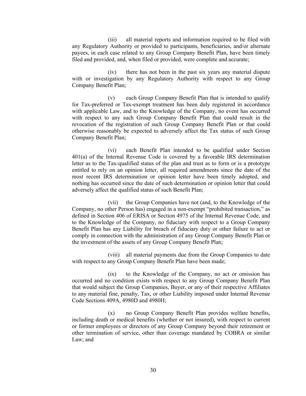 30 (iii) all material reports and information required to be filed with any Regulatory Authority or provided to participants, beneficiaries, and/or alternate payees, in each case related to any Group Company Benefit Plan, have been timely filed and provided, and, when filed or provided, were complete and accurate; (iv) there has not been in the past six years any material dispute with or investigation by any Regulatory Authority with respect to any Group Company Benefit Plan; (v) each Group Company Benefit Plan that is intended to qualify for Tax-preferred or Tax-exempt treatment has been duly registered in accordance with applicable Law, and to the Knowledge of the Company, no event has occurred with respect to any such Group Company Benefit Plan that could result in the revocation of the registration of such Group Company Benefit Plan or that could otherwise reasonably be expected to adversely affect the Tax status of such Group Company Benefit Plan; (vi) each Benefit Plan intended to be qualified under Section 401(a) of the Internal Revenue Code is covered by a favorable IRS determination letter as to the Tax-qualified status of the plan and trust as to form or is a prototype entitled to rely on an opinion letter, all required amendments since the date of the most recent IRS determination or opinion letter have been timely adopted, and nothing has occurred since the date of such determination or opinion letter that could adversely affect the qualified status of such Benefit Plan; (vii) the Group Companies have not (and, to the Knowledge of the Company, no other Person has) engaged in a non-exempt “prohibited transaction,” as defined in Section 406 of ERISA or Section 4975 of the Internal Revenue Code, and to the Knowledge of the Company, no fiduciary with respect to a Group Company Benefit Plan has any Liability for breach of fiduciary duty or other failure to act or comply in connection with the administration of any Group Company Benefit Plan or the investment of the assets of any Group Company Benefit Plan; (viii) all material payments due from the Group Companies to date with respect to any Group Company Benefit Plan have been made; (ix) to the Knowledge of the Company, no act or omission has occurred and no condition exists with respect to any Group Company Benefit Plan that would subject the Group Companies, Buyer, or any of their respective Affiliates to any material fine, penalty, Tax, or other Liability imposed under Internal Revenue Code Sections 409A, 4980D and 4980H; (x) no Group Company Benefit Plan provides welfare benefits, including death or medical benefits (whether or not insured), with respect to current or former employees or directors of any Group Company beyond their retirement or other termination of service, other than coverage mandated by COBRA or similar Law; and
