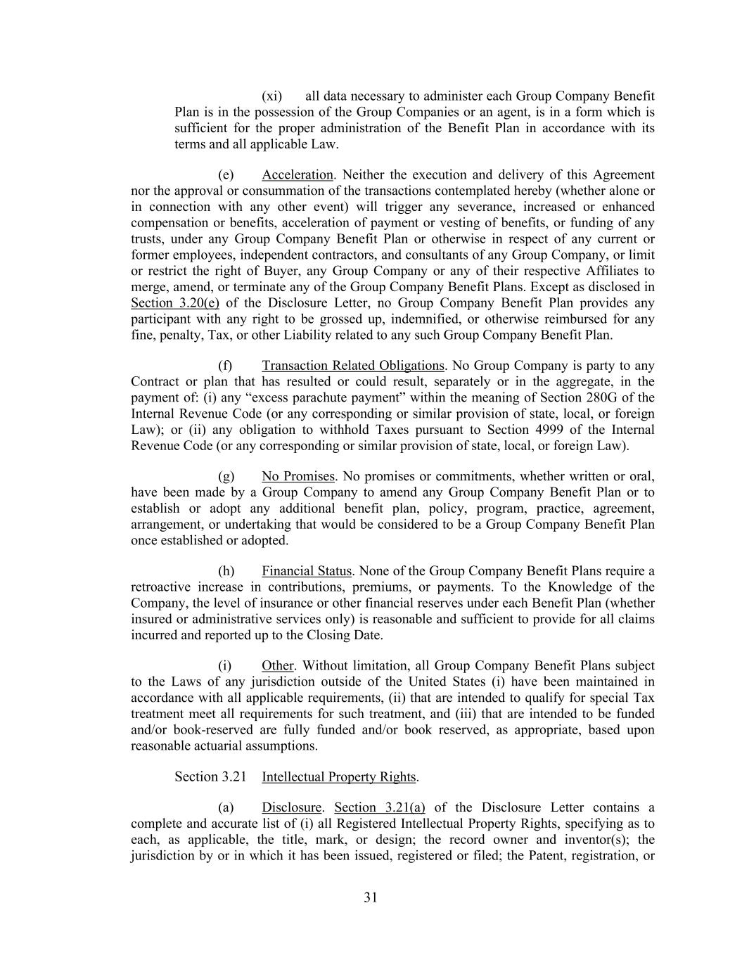 31 (xi) all data necessary to administer each Group Company Benefit Plan is in the possession of the Group Companies or an agent, is in a form which is sufficient for the proper administration of the Benefit Plan in accordance with its terms and all applicable Law. (e) Acceleration. Neither the execution and delivery of this Agreement nor the approval or consummation of the transactions contemplated hereby (whether alone or in connection with any other event) will trigger any severance, increased or enhanced compensation or benefits, acceleration of payment or vesting of benefits, or funding of any trusts, under any Group Company Benefit Plan or otherwise in respect of any current or former employees, independent contractors, and consultants of any Group Company, or limit or restrict the right of Buyer, any Group Company or any of their respective Affiliates to merge, amend, or terminate any of the Group Company Benefit Plans. Except as disclosed in Section 3.20(e) of the Disclosure Letter, no Group Company Benefit Plan provides any participant with any right to be grossed up, indemnified, or otherwise reimbursed for any fine, penalty, Tax, or other Liability related to any such Group Company Benefit Plan. (f) Transaction Related Obligations. No Group Company is party to any Contract or plan that has resulted or could result, separately or in the aggregate, in the payment of: (i) any “excess parachute payment” within the meaning of Section 280G of the Internal Revenue Code (or any corresponding or similar provision of state, local, or foreign Law); or (ii) any obligation to withhold Taxes pursuant to Section 4999 of the Internal Revenue Code (or any corresponding or similar provision of state, local, or foreign Law). (g) No Promises. No promises or commitments, whether written or oral, have been made by a Group Company to amend any Group Company Benefit Plan or to establish or adopt any additional benefit plan, policy, program, practice, agreement, arrangement, or undertaking that would be considered to be a Group Company Benefit Plan once established or adopted. (h) Financial Status. None of the Group Company Benefit Plans require a retroactive increase in contributions, premiums, or payments. To the Knowledge of the Company, the level of insurance or other financial reserves under each Benefit Plan (whether insured or administrative services only) is reasonable and sufficient to provide for all claims incurred and reported up to the Closing Date. (i) Other. Without limitation, all Group Company Benefit Plans subject to the Laws of any jurisdiction outside of the United States (i) have been maintained in accordance with all applicable requirements, (ii) that are intended to qualify for special Tax treatment meet all requirements for such treatment, and (iii) that are intended to be funded and/or book-reserved are fully funded and/or book reserved, as appropriate, based upon reasonable actuarial assumptions. Section 3.21 Intellectual Property Rights. (a) Disclosure. Section 3.21(a) of the Disclosure Letter contains a complete and accurate list of (i) all Registered Intellectual Property Rights, specifying as to each, as applicable, the title, mark, or design; the record owner and inventor(s); the jurisdiction by or in which it has been issued, registered or filed; the Patent, registration, or