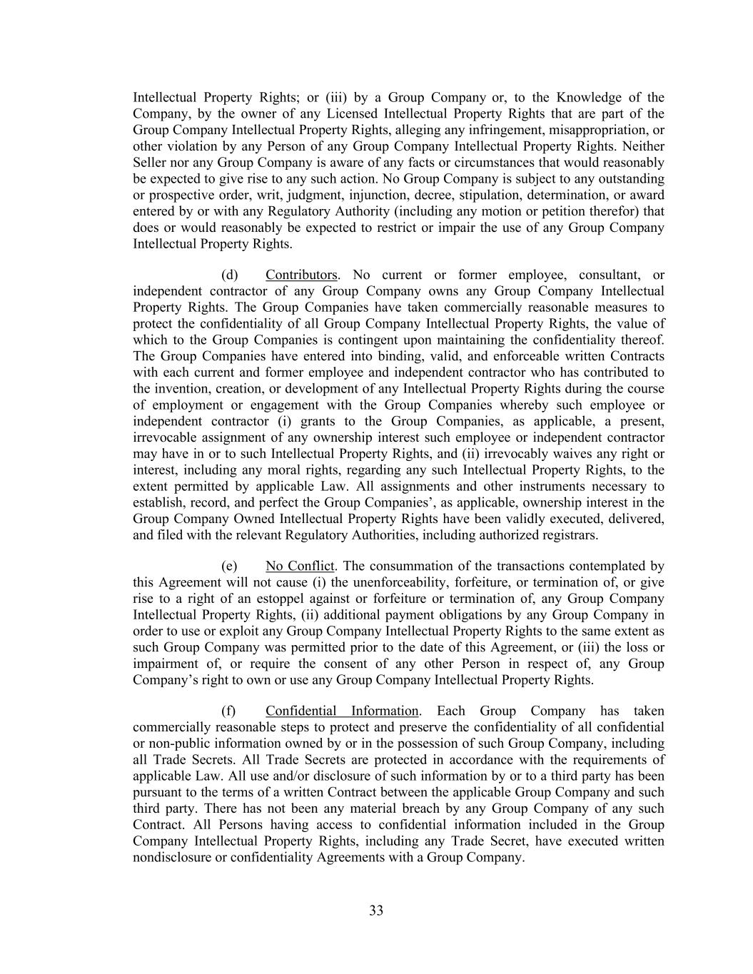 33 Intellectual Property Rights; or (iii) by a Group Company or, to the Knowledge of the Company, by the owner of any Licensed Intellectual Property Rights that are part of the Group Company Intellectual Property Rights, alleging any infringement, misappropriation, or other violation by any Person of any Group Company Intellectual Property Rights. Neither Seller nor any Group Company is aware of any facts or circumstances that would reasonably be expected to give rise to any such action. No Group Company is subject to any outstanding or prospective order, writ, judgment, injunction, decree, stipulation, determination, or award entered by or with any Regulatory Authority (including any motion or petition therefor) that does or would reasonably be expected to restrict or impair the use of any Group Company Intellectual Property Rights. (d) Contributors. No current or former employee, consultant, or independent contractor of any Group Company owns any Group Company Intellectual Property Rights. The Group Companies have taken commercially reasonable measures to protect the confidentiality of all Group Company Intellectual Property Rights, the value of which to the Group Companies is contingent upon maintaining the confidentiality thereof. The Group Companies have entered into binding, valid, and enforceable written Contracts with each current and former employee and independent contractor who has contributed to the invention, creation, or development of any Intellectual Property Rights during the course of employment or engagement with the Group Companies whereby such employee or independent contractor (i) grants to the Group Companies, as applicable, a present, irrevocable assignment of any ownership interest such employee or independent contractor may have in or to such Intellectual Property Rights, and (ii) irrevocably waives any right or interest, including any moral rights, regarding any such Intellectual Property Rights, to the extent permitted by applicable Law. All assignments and other instruments necessary to establish, record, and perfect the Group Companies’, as applicable, ownership interest in the Group Company Owned Intellectual Property Rights have been validly executed, delivered, and filed with the relevant Regulatory Authorities, including authorized registrars. (e) No Conflict. The consummation of the transactions contemplated by this Agreement will not cause (i) the unenforceability, forfeiture, or termination of, or give rise to a right of an estoppel against or forfeiture or termination of, any Group Company Intellectual Property Rights, (ii) additional payment obligations by any Group Company in order to use or exploit any Group Company Intellectual Property Rights to the same extent as such Group Company was permitted prior to the date of this Agreement, or (iii) the loss or impairment of, or require the consent of any other Person in respect of, any Group Company’s right to own or use any Group Company Intellectual Property Rights. (f) Confidential Information. Each Group Company has taken commercially reasonable steps to protect and preserve the confidentiality of all confidential or non-public information owned by or in the possession of such Group Company, including all Trade Secrets. All Trade Secrets are protected in accordance with the requirements of applicable Law. All use and/or disclosure of such information by or to a third party has been pursuant to the terms of a written Contract between the applicable Group Company and such third party. There has not been any material breach by any Group Company of any such Contract. All Persons having access to confidential information included in the Group Company Intellectual Property Rights, including any Trade Secret, have executed written nondisclosure or confidentiality Agreements with a Group Company.