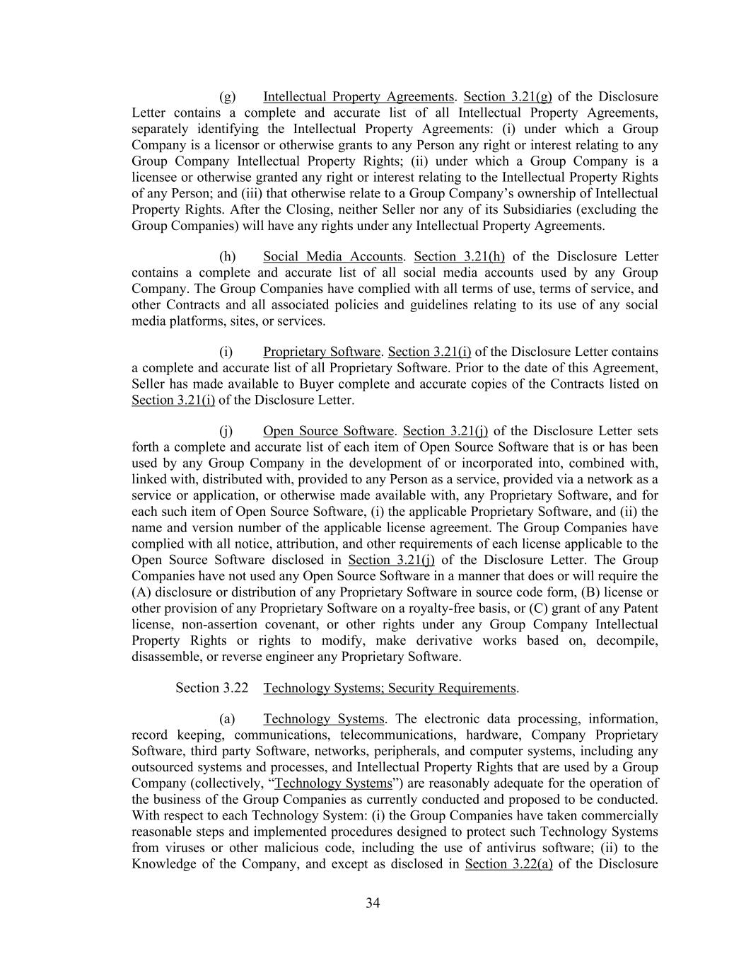 34 (g) Intellectual Property Agreements. Section 3.21(g) of the Disclosure Letter contains a complete and accurate list of all Intellectual Property Agreements, separately identifying the Intellectual Property Agreements: (i) under which a Group Company is a licensor or otherwise grants to any Person any right or interest relating to any Group Company Intellectual Property Rights; (ii) under which a Group Company is a licensee or otherwise granted any right or interest relating to the Intellectual Property Rights of any Person; and (iii) that otherwise relate to a Group Company’s ownership of Intellectual Property Rights. After the Closing, neither Seller nor any of its Subsidiaries (excluding the Group Companies) will have any rights under any Intellectual Property Agreements. (h) Social Media Accounts. Section 3.21(h) of the Disclosure Letter contains a complete and accurate list of all social media accounts used by any Group Company. The Group Companies have complied with all terms of use, terms of service, and other Contracts and all associated policies and guidelines relating to its use of any social media platforms, sites, or services. (i) Proprietary Software. Section 3.21(i) of the Disclosure Letter contains a complete and accurate list of all Proprietary Software. Prior to the date of this Agreement, Seller has made available to Buyer complete and accurate copies of the Contracts listed on Section 3.21(i) of the Disclosure Letter. (j) Open Source Software. Section 3.21(j) of the Disclosure Letter sets forth a complete and accurate list of each item of Open Source Software that is or has been used by any Group Company in the development of or incorporated into, combined with, linked with, distributed with, provided to any Person as a service, provided via a network as a service or application, or otherwise made available with, any Proprietary Software, and for each such item of Open Source Software, (i) the applicable Proprietary Software, and (ii) the name and version number of the applicable license agreement. The Group Companies have complied with all notice, attribution, and other requirements of each license applicable to the Open Source Software disclosed in Section 3.21(j) of the Disclosure Letter. The Group Companies have not used any Open Source Software in a manner that does or will require the (A) disclosure or distribution of any Proprietary Software in source code form, (B) license or other provision of any Proprietary Software on a royalty-free basis, or (C) grant of any Patent license, non-assertion covenant, or other rights under any Group Company Intellectual Property Rights or rights to modify, make derivative works based on, decompile, disassemble, or reverse engineer any Proprietary Software. Section 3.22 Technology Systems; Security Requirements. (a) Technology Systems. The electronic data processing, information, record keeping, communications, telecommunications, hardware, Company Proprietary Software, third party Software, networks, peripherals, and computer systems, including any outsourced systems and processes, and Intellectual Property Rights that are used by a Group Company (collectively, “Technology Systems”) are reasonably adequate for the operation of the business of the Group Companies as currently conducted and proposed to be conducted. With respect to each Technology System: (i) the Group Companies have taken commercially reasonable steps and implemented procedures designed to protect such Technology Systems from viruses or other malicious code, including the use of antivirus software; (ii) to the Knowledge of the Company, and except as disclosed in Section 3.22(a) of the Disclosure