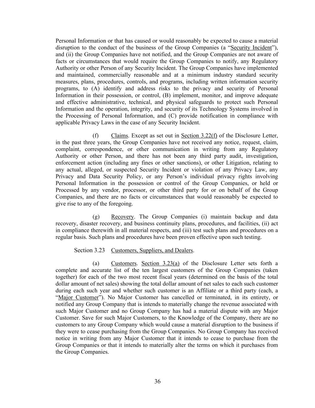 36 Personal Information or that has caused or would reasonably be expected to cause a material disruption to the conduct of the business of the Group Companies (a “Security Incident”), and (ii) the Group Companies have not notified, and the Group Companies are not aware of facts or circumstances that would require the Group Companies to notify, any Regulatory Authority or other Person of any Security Incident. The Group Companies have implemented and maintained, commercially reasonable and at a minimum industry standard security measures, plans, procedures, controls, and programs, including written information security programs, to (A) identify and address risks to the privacy and security of Personal Information in their possession, or control, (B) implement, monitor, and improve adequate and effective administrative, technical, and physical safeguards to protect such Personal Information and the operation, integrity, and security of its Technology Systems involved in the Processing of Personal Information, and (C) provide notification in compliance with applicable Privacy Laws in the case of any Security Incident. (f) Claims. Except as set out in Section 3.22(f) of the Disclosure Letter, in the past three years, the Group Companies have not received any notice, request, claim, complaint, correspondence, or other communication in writing from any Regulatory Authority or other Person, and there has not been any third party audit, investigation, enforcement action (including any fines or other sanctions), or other Litigation, relating to any actual, alleged, or suspected Security Incident or violation of any Privacy Law, any Privacy and Data Security Policy, or any Person’s individual privacy rights involving Personal Information in the possession or control of the Group Companies, or held or Processed by any vendor, processor, or other third party for or on behalf of the Group Companies, and there are no facts or circumstances that would reasonably be expected to give rise to any of the foregoing. (g) Recovery. The Group Companies (i) maintain backup and data recovery, disaster recovery, and business continuity plans, procedures, and facilities, (ii) act in compliance therewith in all material respects, and (iii) test such plans and procedures on a regular basis. Such plans and procedures have been proven effective upon such testing. Section 3.23 Customers, Suppliers, and Dealers. (a) Customers. Section 3.23(a) of the Disclosure Letter sets forth a complete and accurate list of the ten largest customers of the Group Companies (taken together) for each of the two most recent fiscal years (determined on the basis of the total dollar amount of net sales) showing the total dollar amount of net sales to each such customer during each such year and whether such customer is an Affiliate or a third party (each, a “Major Customer”). No Major Customer has cancelled or terminated, in its entirety, or notified any Group Company that is intends to materially change the revenue associated with such Major Customer and no Group Company has had a material dispute with any Major Customer. Save for such Major Customers, to the Knowledge of the Company, there are no customers to any Group Company which would cause a material disruption to the business if they were to cease purchasing from the Group Companies. No Group Company has received notice in writing from any Major Customer that it intends to cease to purchase from the Group Companies or that it intends to materially alter the terms on which it purchases from the Group Companies.