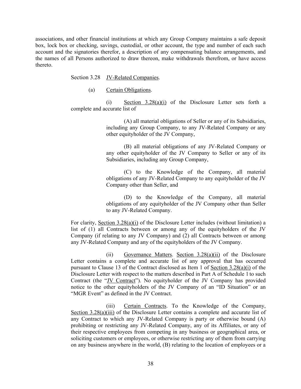 38 associations, and other financial institutions at which any Group Company maintains a safe deposit box, lock box or checking, savings, custodial, or other account, the type and number of each such account and the signatories therefor, a description of any compensating balance arrangements, and the names of all Persons authorized to draw thereon, make withdrawals therefrom, or have access thereto. Section 3.28 JV-Related Companies. (a) Certain Obligations. (i) Section 3.28(a)(i) of the Disclosure Letter sets forth a complete and accurate list of (A) all material obligations of Seller or any of its Subsidiaries, including any Group Company, to any JV-Related Company or any other equityholder of the JV Company, (B) all material obligations of any JV-Related Company or any other equityholder of the JV Company to Seller or any of its Subsidiaries, including any Group Company, (C) to the Knowledge of the Company, all material obligations of any JV-Related Company to any equityholder of the JV Company other than Seller, and (D) to the Knowledge of the Company, all material obligations of any equityholder of the JV Company other than Seller to any JV-Related Company. For clarity, Section 3.28(a)(i) of the Disclosure Letter includes (without limitation) a list of (1) all Contracts between or among any of the equityholders of the JV Company (if relating to any JV Company) and (2) all Contracts between or among any JV-Related Company and any of the equityholders of the JV Company. (ii) Governance Matters. Section 3.28(a)(ii) of the Disclosure Letter contains a complete and accurate list of any approval that has occurred pursuant to Clause 13 of the Contract disclosed as Item 1 of Section 3.28(a)(i) of the Disclosure Letter with respect to the matters described in Part A of Schedule 1 to such Contract (the “JV Contract”). No equityholder of the JV Company has provided notice to the other equityholders of the JV Company of an “ID Situation” or an “MGR Event” as defined in the JV Contract. (iii) Certain Contracts. To the Knowledge of the Company, Section 3.28(a)(iii) of the Disclosure Letter contains a complete and accurate list of any Contract to which any JV-Related Company is party or otherwise bound (A) prohibiting or restricting any JV-Related Company, any of its Affiliates, or any of their respective employees from competing in any business or geographical area, or soliciting customers or employees, or otherwise restricting any of them from carrying on any business anywhere in the world, (B) relating to the location of employees or a