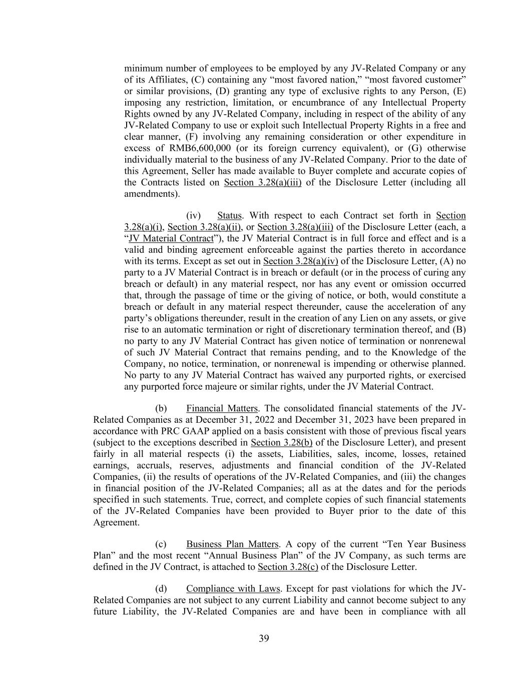39 minimum number of employees to be employed by any JV-Related Company or any of its Affiliates, (C) containing any “most favored nation,” “most favored customer” or similar provisions, (D) granting any type of exclusive rights to any Person, (E) imposing any restriction, limitation, or encumbrance of any Intellectual Property Rights owned by any JV-Related Company, including in respect of the ability of any JV-Related Company to use or exploit such Intellectual Property Rights in a free and clear manner, (F) involving any remaining consideration or other expenditure in excess of RMB6,600,000 (or its foreign currency equivalent), or (G) otherwise individually material to the business of any JV-Related Company. Prior to the date of this Agreement, Seller has made available to Buyer complete and accurate copies of the Contracts listed on Section 3.28(a)(iii) of the Disclosure Letter (including all amendments). (iv) Status. With respect to each Contract set forth in Section 3.28(a)(i), Section 3.28(a)(ii), or Section 3.28(a)(iii) of the Disclosure Letter (each, a “JV Material Contract”), the JV Material Contract is in full force and effect and is a valid and binding agreement enforceable against the parties thereto in accordance with its terms. Except as set out in Section 3.28(a)(iv) of the Disclosure Letter, (A) no party to a JV Material Contract is in breach or default (or in the process of curing any breach or default) in any material respect, nor has any event or omission occurred that, through the passage of time or the giving of notice, or both, would constitute a breach or default in any material respect thereunder, cause the acceleration of any party’s obligations thereunder, result in the creation of any Lien on any assets, or give rise to an automatic termination or right of discretionary termination thereof, and (B) no party to any JV Material Contract has given notice of termination or nonrenewal of such JV Material Contract that remains pending, and to the Knowledge of the Company, no notice, termination, or nonrenewal is impending or otherwise planned. No party to any JV Material Contract has waived any purported rights, or exercised any purported force majeure or similar rights, under the JV Material Contract. (b) Financial Matters. The consolidated financial statements of the JV- Related Companies as at December 31, 2022 and December 31, 2023 have been prepared in accordance with PRC GAAP applied on a basis consistent with those of previous fiscal years (subject to the exceptions described in Section 3.28(b) of the Disclosure Letter), and present fairly in all material respects (i) the assets, Liabilities, sales, income, losses, retained earnings, accruals, reserves, adjustments and financial condition of the JV-Related Companies, (ii) the results of operations of the JV-Related Companies, and (iii) the changes in financial position of the JV-Related Companies; all as at the dates and for the periods specified in such statements. True, correct, and complete copies of such financial statements of the JV-Related Companies have been provided to Buyer prior to the date of this Agreement. (c) Business Plan Matters. A copy of the current “Ten Year Business Plan” and the most recent “Annual Business Plan” of the JV Company, as such terms are defined in the JV Contract, is attached to Section 3.28(c) of the Disclosure Letter. (d) Compliance with Laws. Except for past violations for which the JV- Related Companies are not subject to any current Liability and cannot become subject to any future Liability, the JV-Related Companies are and have been in compliance with all