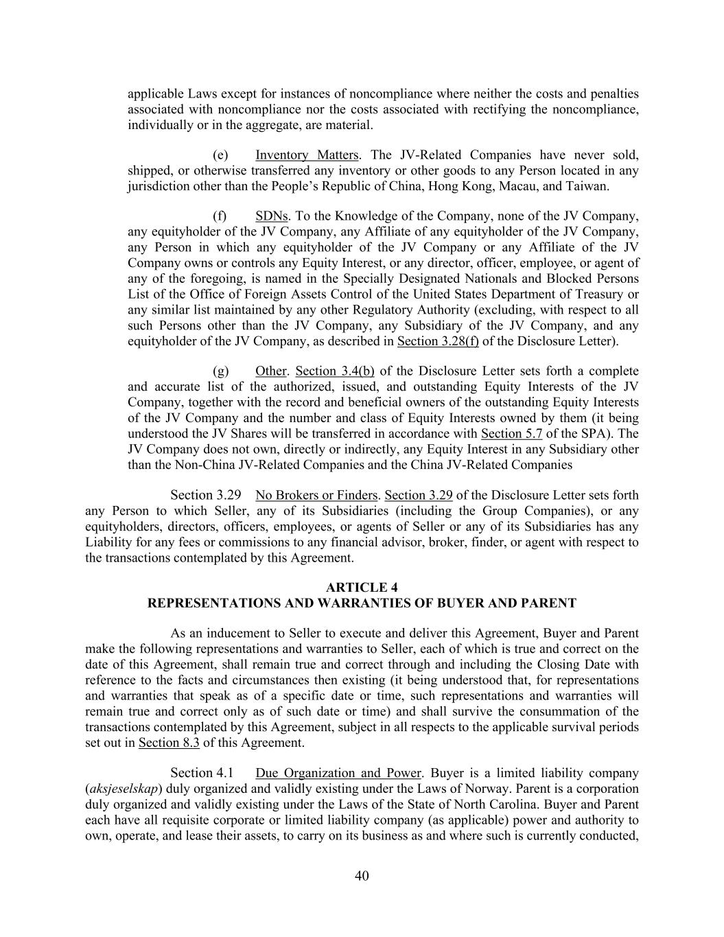 40 applicable Laws except for instances of noncompliance where neither the costs and penalties associated with noncompliance nor the costs associated with rectifying the noncompliance, individually or in the aggregate, are material. (e) Inventory Matters. The JV-Related Companies have never sold, shipped, or otherwise transferred any inventory or other goods to any Person located in any jurisdiction other than the People’s Republic of China, Hong Kong, Macau, and Taiwan. (f) SDNs. To the Knowledge of the Company, none of the JV Company, any equityholder of the JV Company, any Affiliate of any equityholder of the JV Company, any Person in which any equityholder of the JV Company or any Affiliate of the JV Company owns or controls any Equity Interest, or any director, officer, employee, or agent of any of the foregoing, is named in the Specially Designated Nationals and Blocked Persons List of the Office of Foreign Assets Control of the United States Department of Treasury or any similar list maintained by any other Regulatory Authority (excluding, with respect to all such Persons other than the JV Company, any Subsidiary of the JV Company, and any equityholder of the JV Company, as described in Section 3.28(f) of the Disclosure Letter). (g) Other. Section 3.4(b) of the Disclosure Letter sets forth a complete and accurate list of the authorized, issued, and outstanding Equity Interests of the JV Company, together with the record and beneficial owners of the outstanding Equity Interests of the JV Company and the number and class of Equity Interests owned by them (it being understood the JV Shares will be transferred in accordance with Section 5.7 of the SPA). The JV Company does not own, directly or indirectly, any Equity Interest in any Subsidiary other than the Non-China JV-Related Companies and the China JV-Related Companies Section 3.29 No Brokers or Finders. Section 3.29 of the Disclosure Letter sets forth any Person to which Seller, any of its Subsidiaries (including the Group Companies), or any equityholders, directors, officers, employees, or agents of Seller or any of its Subsidiaries has any Liability for any fees or commissions to any financial advisor, broker, finder, or agent with respect to the transactions contemplated by this Agreement. ARTICLE 4 REPRESENTATIONS AND WARRANTIES OF BUYER AND PARENT As an inducement to Seller to execute and deliver this Agreement, Buyer and Parent make the following representations and warranties to Seller, each of which is true and correct on the date of this Agreement, shall remain true and correct through and including the Closing Date with reference to the facts and circumstances then existing (it being understood that, for representations and warranties that speak as of a specific date or time, such representations and warranties will remain true and correct only as of such date or time) and shall survive the consummation of the transactions contemplated by this Agreement, subject in all respects to the applicable survival periods set out in Section 8.3 of this Agreement. Section 4.1 Due Organization and Power. Buyer is a limited liability company (aksjeselskap) duly organized and validly existing under the Laws of Norway. Parent is a corporation duly organized and validly existing under the Laws of the State of North Carolina. Buyer and Parent each have all requisite corporate or limited liability company (as applicable) power and authority to own, operate, and lease their assets, to carry on its business as and where such is currently conducted,