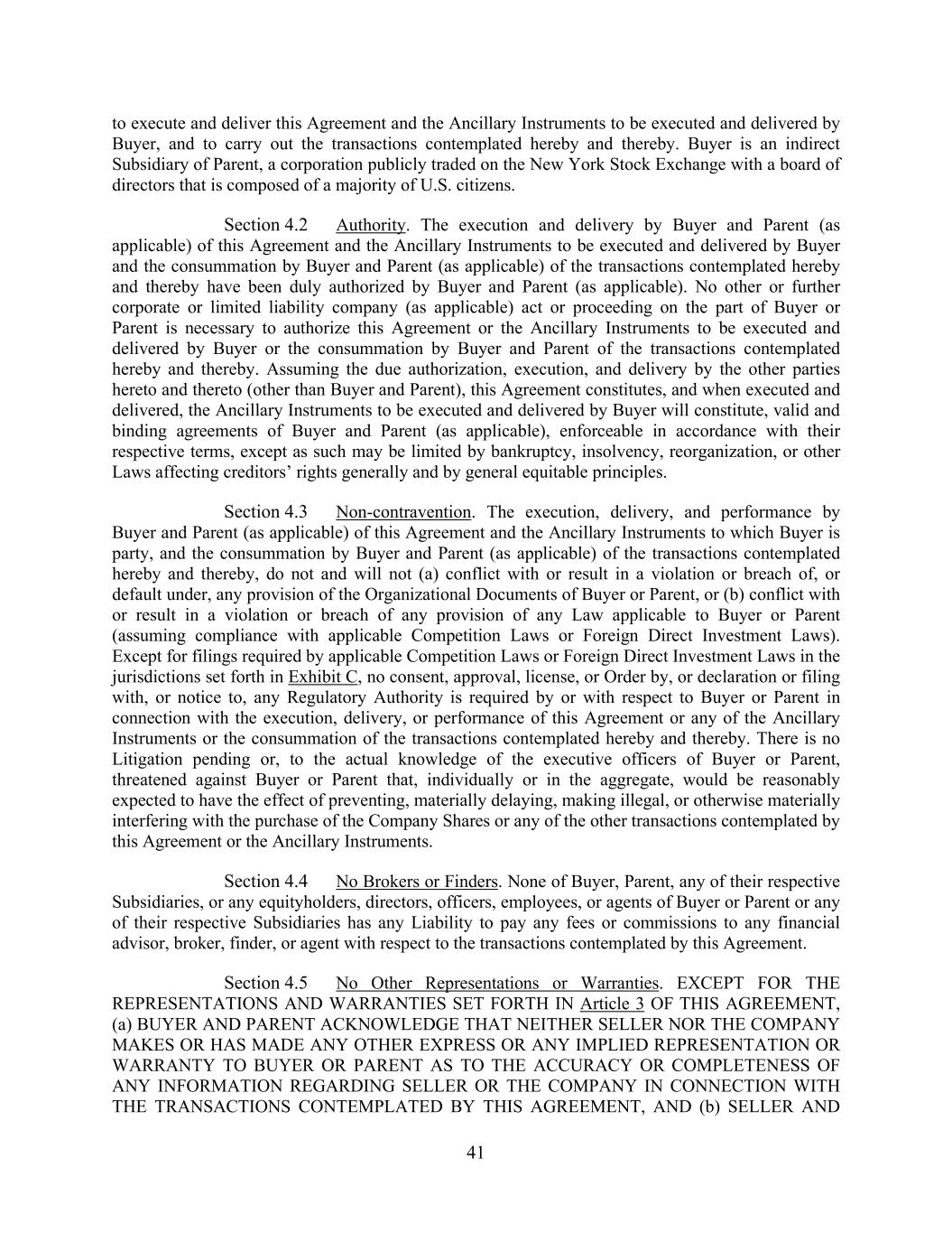 41 to execute and deliver this Agreement and the Ancillary Instruments to be executed and delivered by Buyer, and to carry out the transactions contemplated hereby and thereby. Buyer is an indirect Subsidiary of Parent, a corporation publicly traded on the New York Stock Exchange with a board of directors that is composed of a majority of U.S. citizens. Section 4.2 Authority. The execution and delivery by Buyer and Parent (as applicable) of this Agreement and the Ancillary Instruments to be executed and delivered by Buyer and the consummation by Buyer and Parent (as applicable) of the transactions contemplated hereby and thereby have been duly authorized by Buyer and Parent (as applicable). No other or further corporate or limited liability company (as applicable) act or proceeding on the part of Buyer or Parent is necessary to authorize this Agreement or the Ancillary Instruments to be executed and delivered by Buyer or the consummation by Buyer and Parent of the transactions contemplated hereby and thereby. Assuming the due authorization, execution, and delivery by the other parties hereto and thereto (other than Buyer and Parent), this Agreement constitutes, and when executed and delivered, the Ancillary Instruments to be executed and delivered by Buyer will constitute, valid and binding agreements of Buyer and Parent (as applicable), enforceable in accordance with their respective terms, except as such may be limited by bankruptcy, insolvency, reorganization, or other Laws affecting creditors’ rights generally and by general equitable principles. Section 4.3 Non-contravention. The execution, delivery, and performance by Buyer and Parent (as applicable) of this Agreement and the Ancillary Instruments to which Buyer is party, and the consummation by Buyer and Parent (as applicable) of the transactions contemplated hereby and thereby, do not and will not (a) conflict with or result in a violation or breach of, or default under, any provision of the Organizational Documents of Buyer or Parent, or (b) conflict with or result in a violation or breach of any provision of any Law applicable to Buyer or Parent (assuming compliance with applicable Competition Laws or Foreign Direct Investment Laws). Except for filings required by applicable Competition Laws or Foreign Direct Investment Laws in the jurisdictions set forth in Exhibit C, no consent, approval, license, or Order by, or declaration or filing with, or notice to, any Regulatory Authority is required by or with respect to Buyer or Parent in connection with the execution, delivery, or performance of this Agreement or any of the Ancillary Instruments or the consummation of the transactions contemplated hereby and thereby. There is no Litigation pending or, to the actual knowledge of the executive officers of Buyer or Parent, threatened against Buyer or Parent that, individually or in the aggregate, would be reasonably expected to have the effect of preventing, materially delaying, making illegal, or otherwise materially interfering with the purchase of the Company Shares or any of the other transactions contemplated by this Agreement or the Ancillary Instruments. Section 4.4 No Brokers or Finders. None of Buyer, Parent, any of their respective Subsidiaries, or any equityholders, directors, officers, employees, or agents of Buyer or Parent or any of their respective Subsidiaries has any Liability to pay any fees or commissions to any financial advisor, broker, finder, or agent with respect to the transactions contemplated by this Agreement. Section 4.5 No Other Representations or Warranties. EXCEPT FOR THE REPRESENTATIONS AND WARRANTIES SET FORTH IN Article 3 OF THIS AGREEMENT, (a) BUYER AND PARENT ACKNOWLEDGE THAT NEITHER SELLER NOR THE COMPANY MAKES OR HAS MADE ANY OTHER EXPRESS OR ANY IMPLIED REPRESENTATION OR WARRANTY TO BUYER OR PARENT AS TO THE ACCURACY OR COMPLETENESS OF ANY INFORMATION REGARDING SELLER OR THE COMPANY IN CONNECTION WITH THE TRANSACTIONS CONTEMPLATED BY THIS AGREEMENT, AND (b) SELLER AND