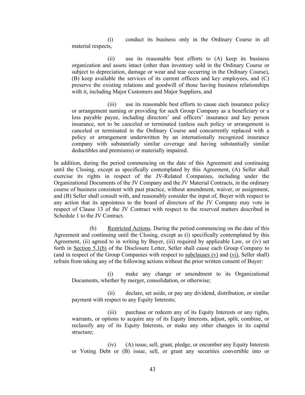 43 (i) conduct its business only in the Ordinary Course in all material respects, (ii) use its reasonable best efforts to (A) keep its business organization and assets intact (other than inventory sold in the Ordinary Course or subject to depreciation, damage or wear and tear occurring in the Ordinary Course), (B) keep available the services of its current officers and key employees, and (C) preserve the existing relations and goodwill of those having business relationships with it, including Major Customers and Major Suppliers, and (iii) use its reasonable best efforts to cause each insurance policy or arrangement naming or providing for such Group Company as a beneficiary or a loss payable payee, including directors’ and officers’ insurance and key person insurance, not to be canceled or terminated (unless such policy or arrangement is canceled or terminated in the Ordinary Course and concurrently replaced with a policy or arrangement underwritten by an internationally recognized insurance company with substantially similar coverage and having substantially similar deductibles and premiums) or materially impaired. In addition, during the period commencing on the date of this Agreement and continuing until the Closing, except as specifically contemplated by this Agreement, (A) Seller shall exercise its rights in respect of the JV-Related Companies, including under the Organizational Documents of the JV Company and the JV Material Contracts, in the ordinary course of business consistent with past practice, without amendment, waiver, or assignment, and (B) Seller shall consult with, and reasonably consider the input of, Buyer with respect to any action that its appointees to the board of directors of the JV Company may vote in respect of Clause 13 of the JV Contract with respect to the reserved matters described in Schedule 1 to the JV Contract. (b) Restricted Actions. During the period commencing on the date of this Agreement and continuing until the Closing, except as (i) specifically contemplated by this Agreement, (ii) agreed to in writing by Buyer, (iii) required by applicable Law, or (iv) set forth in Section 5.1(b) of the Disclosure Letter, Seller shall cause each Group Company to (and in respect of the Group Companies with respect to subclauses (v) and (vi), Seller shall) refrain from taking any of the following actions without the prior written consent of Buyer: (i) make any change or amendment to its Organizational Documents, whether by merger, consolidation, or otherwise; (ii) declare, set aside, or pay any dividend, distribution, or similar payment with respect to any Equity Interests; (iii) purchase or redeem any of its Equity Interests or any rights, warrants, or options to acquire any of its Equity Interests, adjust, split, combine, or reclassify any of its Equity Interests, or make any other changes in its capital structure; (iv) (A) issue, sell, grant, pledge, or encumber any Equity Interests or Voting Debt or (B) issue, sell, or grant any securities convertible into or