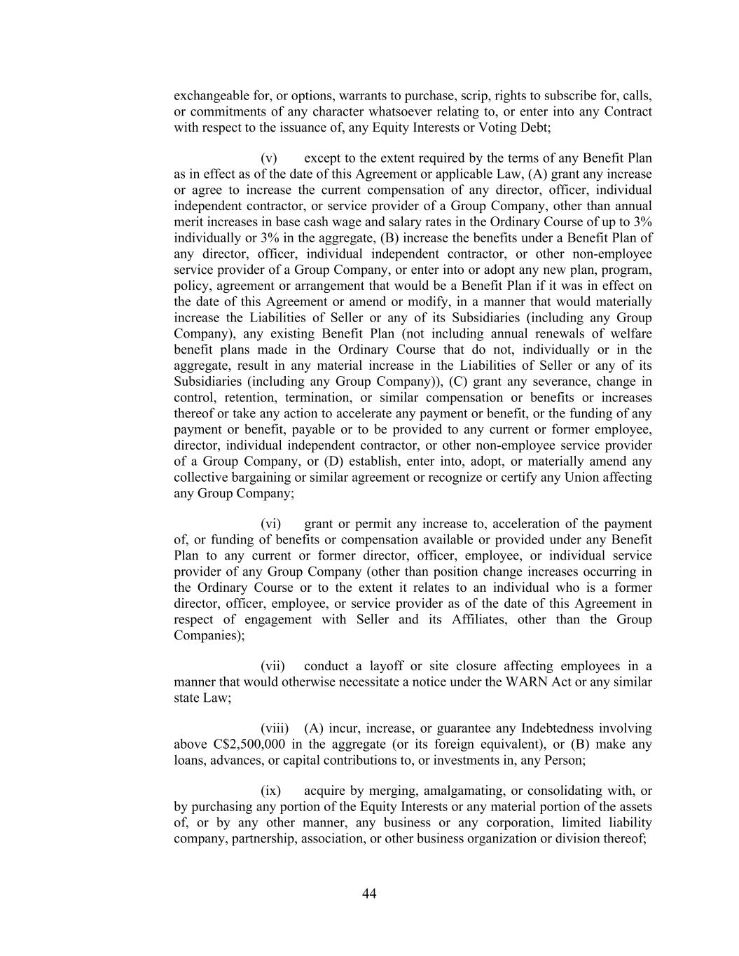44 exchangeable for, or options, warrants to purchase, scrip, rights to subscribe for, calls, or commitments of any character whatsoever relating to, or enter into any Contract with respect to the issuance of, any Equity Interests or Voting Debt; (v) except to the extent required by the terms of any Benefit Plan as in effect as of the date of this Agreement or applicable Law, (A) grant any increase or agree to increase the current compensation of any director, officer, individual independent contractor, or service provider of a Group Company, other than annual merit increases in base cash wage and salary rates in the Ordinary Course of up to 3% individually or 3% in the aggregate, (B) increase the benefits under a Benefit Plan of any director, officer, individual independent contractor, or other non-employee service provider of a Group Company, or enter into or adopt any new plan, program, policy, agreement or arrangement that would be a Benefit Plan if it was in effect on the date of this Agreement or amend or modify, in a manner that would materially increase the Liabilities of Seller or any of its Subsidiaries (including any Group Company), any existing Benefit Plan (not including annual renewals of welfare benefit plans made in the Ordinary Course that do not, individually or in the aggregate, result in any material increase in the Liabilities of Seller or any of its Subsidiaries (including any Group Company)), (C) grant any severance, change in control, retention, termination, or similar compensation or benefits or increases thereof or take any action to accelerate any payment or benefit, or the funding of any payment or benefit, payable or to be provided to any current or former employee, director, individual independent contractor, or other non-employee service provider of a Group Company, or (D) establish, enter into, adopt, or materially amend any collective bargaining or similar agreement or recognize or certify any Union affecting any Group Company; (vi) grant or permit any increase to, acceleration of the payment of, or funding of benefits or compensation available or provided under any Benefit Plan to any current or former director, officer, employee, or individual service provider of any Group Company (other than position change increases occurring in the Ordinary Course or to the extent it relates to an individual who is a former director, officer, employee, or service provider as of the date of this Agreement in respect of engagement with Seller and its Affiliates, other than the Group Companies); (vii) conduct a layoff or site closure affecting employees in a manner that would otherwise necessitate a notice under the WARN Act or any similar state Law; (viii) (A) incur, increase, or guarantee any Indebtedness involving above C$2,500,000 in the aggregate (or its foreign equivalent), or (B) make any loans, advances, or capital contributions to, or investments in, any Person; (ix) acquire by merging, amalgamating, or consolidating with, or by purchasing any portion of the Equity Interests or any material portion of the assets of, or by any other manner, any business or any corporation, limited liability company, partnership, association, or other business organization or division thereof;
