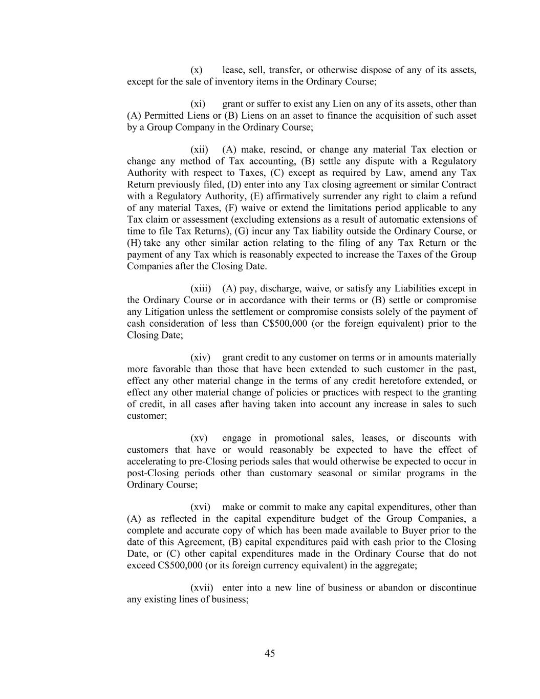 45 (x) lease, sell, transfer, or otherwise dispose of any of its assets, except for the sale of inventory items in the Ordinary Course; (xi) grant or suffer to exist any Lien on any of its assets, other than (A) Permitted Liens or (B) Liens on an asset to finance the acquisition of such asset by a Group Company in the Ordinary Course; (xii) (A) make, rescind, or change any material Tax election or change any method of Tax accounting, (B) settle any dispute with a Regulatory Authority with respect to Taxes, (C) except as required by Law, amend any Tax Return previously filed, (D) enter into any Tax closing agreement or similar Contract with a Regulatory Authority, (E) affirmatively surrender any right to claim a refund of any material Taxes, (F) waive or extend the limitations period applicable to any Tax claim or assessment (excluding extensions as a result of automatic extensions of time to file Tax Returns), (G) incur any Tax liability outside the Ordinary Course, or (H) take any other similar action relating to the filing of any Tax Return or the payment of any Tax which is reasonably expected to increase the Taxes of the Group Companies after the Closing Date. (xiii) (A) pay, discharge, waive, or satisfy any Liabilities except in the Ordinary Course or in accordance with their terms or (B) settle or compromise any Litigation unless the settlement or compromise consists solely of the payment of cash consideration of less than C$500,000 (or the foreign equivalent) prior to the Closing Date; (xiv) grant credit to any customer on terms or in amounts materially more favorable than those that have been extended to such customer in the past, effect any other material change in the terms of any credit heretofore extended, or effect any other material change of policies or practices with respect to the granting of credit, in all cases after having taken into account any increase in sales to such customer; (xv) engage in promotional sales, leases, or discounts with customers that have or would reasonably be expected to have the effect of accelerating to pre-Closing periods sales that would otherwise be expected to occur in post-Closing periods other than customary seasonal or similar programs in the Ordinary Course; (xvi) make or commit to make any capital expenditures, other than (A) as reflected in the capital expenditure budget of the Group Companies, a complete and accurate copy of which has been made available to Buyer prior to the date of this Agreement, (B) capital expenditures paid with cash prior to the Closing Date, or (C) other capital expenditures made in the Ordinary Course that do not exceed C$500,000 (or its foreign currency equivalent) in the aggregate; (xvii) enter into a new line of business or abandon or discontinue any existing lines of business;