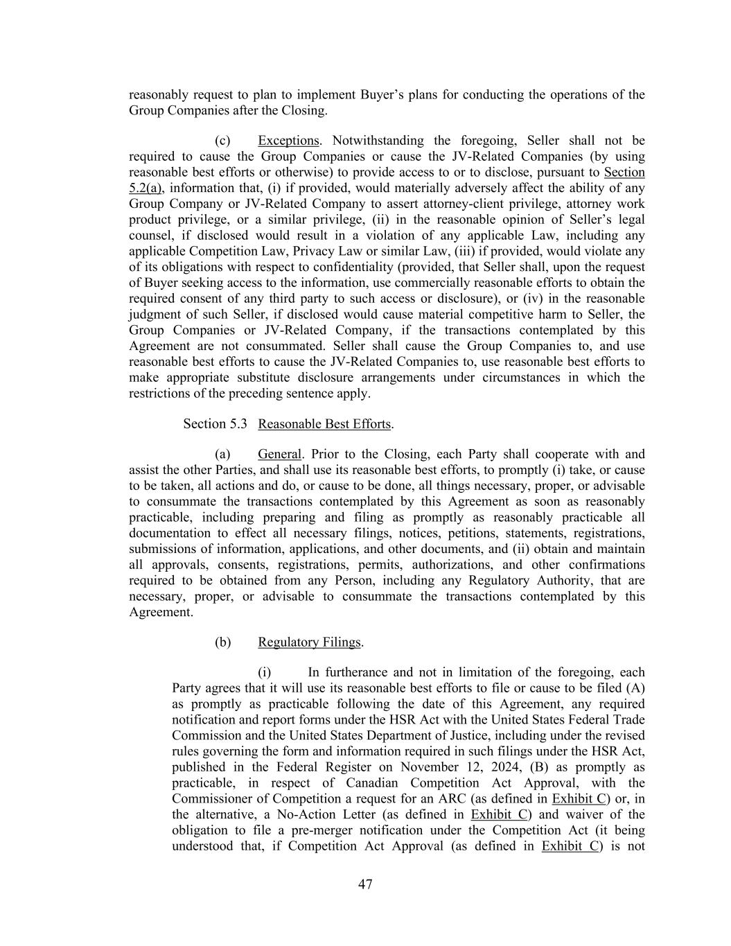 47 reasonably request to plan to implement Buyer’s plans for conducting the operations of the Group Companies after the Closing. (c) Exceptions. Notwithstanding the foregoing, Seller shall not be required to cause the Group Companies or cause the JV-Related Companies (by using reasonable best efforts or otherwise) to provide access to or to disclose, pursuant to Section 5.2(a), information that, (i) if provided, would materially adversely affect the ability of any Group Company or JV-Related Company to assert attorney-client privilege, attorney work product privilege, or a similar privilege, (ii) in the reasonable opinion of Seller’s legal counsel, if disclosed would result in a violation of any applicable Law, including any applicable Competition Law, Privacy Law or similar Law, (iii) if provided, would violate any of its obligations with respect to confidentiality (provided, that Seller shall, upon the request of Buyer seeking access to the information, use commercially reasonable efforts to obtain the required consent of any third party to such access or disclosure), or (iv) in the reasonable judgment of such Seller, if disclosed would cause material competitive harm to Seller, the Group Companies or JV-Related Company, if the transactions contemplated by this Agreement are not consummated. Seller shall cause the Group Companies to, and use reasonable best efforts to cause the JV-Related Companies to, use reasonable best efforts to make appropriate substitute disclosure arrangements under circumstances in which the restrictions of the preceding sentence apply. Section 5.3 Reasonable Best Efforts. (a) General. Prior to the Closing, each Party shall cooperate with and assist the other Parties, and shall use its reasonable best efforts, to promptly (i) take, or cause to be taken, all actions and do, or cause to be done, all things necessary, proper, or advisable to consummate the transactions contemplated by this Agreement as soon as reasonably practicable, including preparing and filing as promptly as reasonably practicable all documentation to effect all necessary filings, notices, petitions, statements, registrations, submissions of information, applications, and other documents, and (ii) obtain and maintain all approvals, consents, registrations, permits, authorizations, and other confirmations required to be obtained from any Person, including any Regulatory Authority, that are necessary, proper, or advisable to consummate the transactions contemplated by this Agreement. (b) Regulatory Filings. (i) In furtherance and not in limitation of the foregoing, each Party agrees that it will use its reasonable best efforts to file or cause to be filed (A) as promptly as practicable following the date of this Agreement, any required notification and report forms under the HSR Act with the United States Federal Trade Commission and the United States Department of Justice, including under the revised rules governing the form and information required in such filings under the HSR Act, published in the Federal Register on November 12, 2024, (B) as promptly as practicable, in respect of Canadian Competition Act Approval, with the Commissioner of Competition a request for an ARC (as defined in Exhibit C) or, in the alternative, a No-Action Letter (as defined in Exhibit C) and waiver of the obligation to file a pre-merger notification under the Competition Act (it being understood that, if Competition Act Approval (as defined in Exhibit C) is not