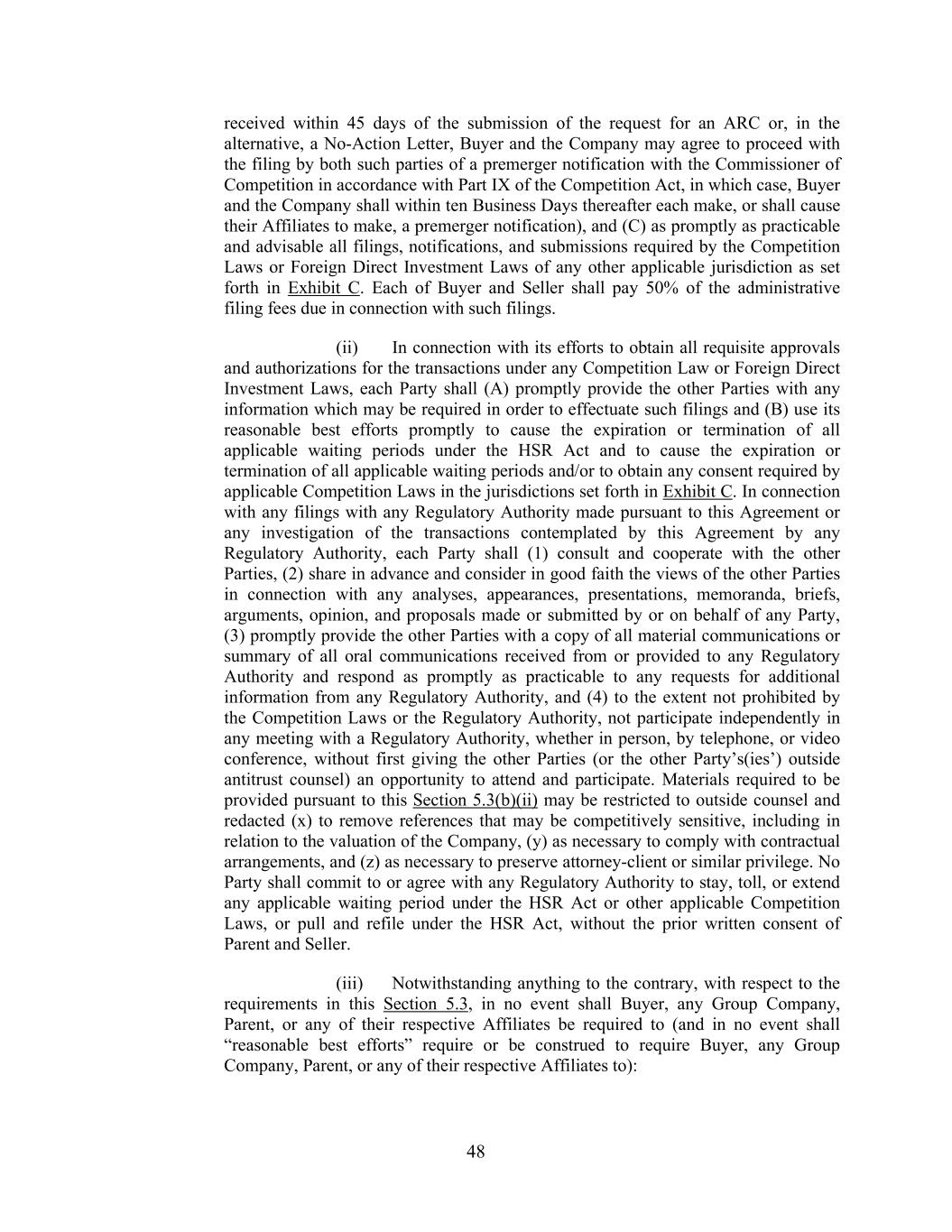 48 received within 45 days of the submission of the request for an ARC or, in the alternative, a No-Action Letter, Buyer and the Company may agree to proceed with the filing by both such parties of a premerger notification with the Commissioner of Competition in accordance with Part IX of the Competition Act, in which case, Buyer and the Company shall within ten Business Days thereafter each make, or shall cause their Affiliates to make, a premerger notification), and (C) as promptly as practicable and advisable all filings, notifications, and submissions required by the Competition Laws or Foreign Direct Investment Laws of any other applicable jurisdiction as set forth in Exhibit C. Each of Buyer and Seller shall pay 50% of the administrative filing fees due in connection with such filings. (ii) In connection with its efforts to obtain all requisite approvals and authorizations for the transactions under any Competition Law or Foreign Direct Investment Laws, each Party shall (A) promptly provide the other Parties with any information which may be required in order to effectuate such filings and (B) use its reasonable best efforts promptly to cause the expiration or termination of all applicable waiting periods under the HSR Act and to cause the expiration or termination of all applicable waiting periods and/or to obtain any consent required by applicable Competition Laws in the jurisdictions set forth in Exhibit C. In connection with any filings with any Regulatory Authority made pursuant to this Agreement or any investigation of the transactions contemplated by this Agreement by any Regulatory Authority, each Party shall (1) consult and cooperate with the other Parties, (2) share in advance and consider in good faith the views of the other Parties in connection with any analyses, appearances, presentations, memoranda, briefs, arguments, opinion, and proposals made or submitted by or on behalf of any Party, (3) promptly provide the other Parties with a copy of all material communications or summary of all oral communications received from or provided to any Regulatory Authority and respond as promptly as practicable to any requests for additional information from any Regulatory Authority, and (4) to the extent not prohibited by the Competition Laws or the Regulatory Authority, not participate independently in any meeting with a Regulatory Authority, whether in person, by telephone, or video conference, without first giving the other Parties (or the other Party’s(ies’) outside antitrust counsel) an opportunity to attend and participate. Materials required to be provided pursuant to this Section 5.3(b)(ii) may be restricted to outside counsel and redacted (x) to remove references that may be competitively sensitive, including in relation to the valuation of the Company, (y) as necessary to comply with contractual arrangements, and (z) as necessary to preserve attorney-client or similar privilege. No Party shall commit to or agree with any Regulatory Authority to stay, toll, or extend any applicable waiting period under the HSR Act or other applicable Competition Laws, or pull and refile under the HSR Act, without the prior written consent of Parent and Seller. (iii) Notwithstanding anything to the contrary, with respect to the requirements in this Section 5.3, in no event shall Buyer, any Group Company, Parent, or any of their respective Affiliates be required to (and in no event shall “reasonable best efforts” require or be construed to require Buyer, any Group Company, Parent, or any of their respective Affiliates to):