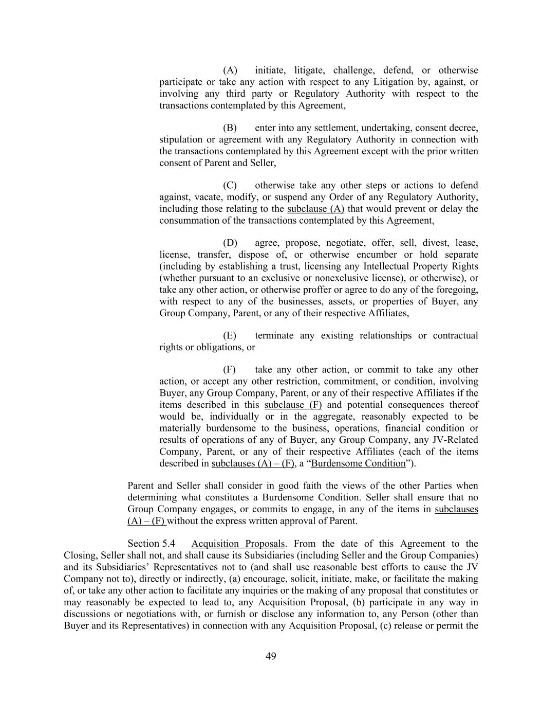 49 (A) initiate, litigate, challenge, defend, or otherwise participate or take any action with respect to any Litigation by, against, or involving any third party or Regulatory Authority with respect to the transactions contemplated by this Agreement, (B) enter into any settlement, undertaking, consent decree, stipulation or agreement with any Regulatory Authority in connection with the transactions contemplated by this Agreement except with the prior written consent of Parent and Seller, (C) otherwise take any other steps or actions to defend against, vacate, modify, or suspend any Order of any Regulatory Authority, including those relating to the subclause (A) that would prevent or delay the consummation of the transactions contemplated by this Agreement, (D) agree, propose, negotiate, offer, sell, divest, lease, license, transfer, dispose of, or otherwise encumber or hold separate (including by establishing a trust, licensing any Intellectual Property Rights (whether pursuant to an exclusive or nonexclusive license), or otherwise), or take any other action, or otherwise proffer or agree to do any of the foregoing, with respect to any of the businesses, assets, or properties of Buyer, any Group Company, Parent, or any of their respective Affiliates, (E) terminate any existing relationships or contractual rights or obligations, or (F) take any other action, or commit to take any other action, or accept any other restriction, commitment, or condition, involving Buyer, any Group Company, Parent, or any of their respective Affiliates if the items described in this subclause (F) and potential consequences thereof would be, individually or in the aggregate, reasonably expected to be materially burdensome to the business, operations, financial condition or results of operations of any of Buyer, any Group Company, any JV-Related Company, Parent, or any of their respective Affiliates (each of the items described in subclauses (A) – (F), a “Burdensome Condition”). Parent and Seller shall consider in good faith the views of the other Parties when determining what constitutes a Burdensome Condition. Seller shall ensure that no Group Company engages, or commits to engage, in any of the items in subclauses (A) – (F) without the express written approval of Parent. Section 5.4 Acquisition Proposals. From the date of this Agreement to the Closing, Seller shall not, and shall cause its Subsidiaries (including Seller and the Group Companies) and its Subsidiaries’ Representatives not to (and shall use reasonable best efforts to cause the JV Company not to), directly or indirectly, (a) encourage, solicit, initiate, make, or facilitate the making of, or take any other action to facilitate any inquiries or the making of any proposal that constitutes or may reasonably be expected to lead to, any Acquisition Proposal, (b) participate in any way in discussions or negotiations with, or furnish or disclose any information to, any Person (other than Buyer and its Representatives) in connection with any Acquisition Proposal, (c) release or permit the
