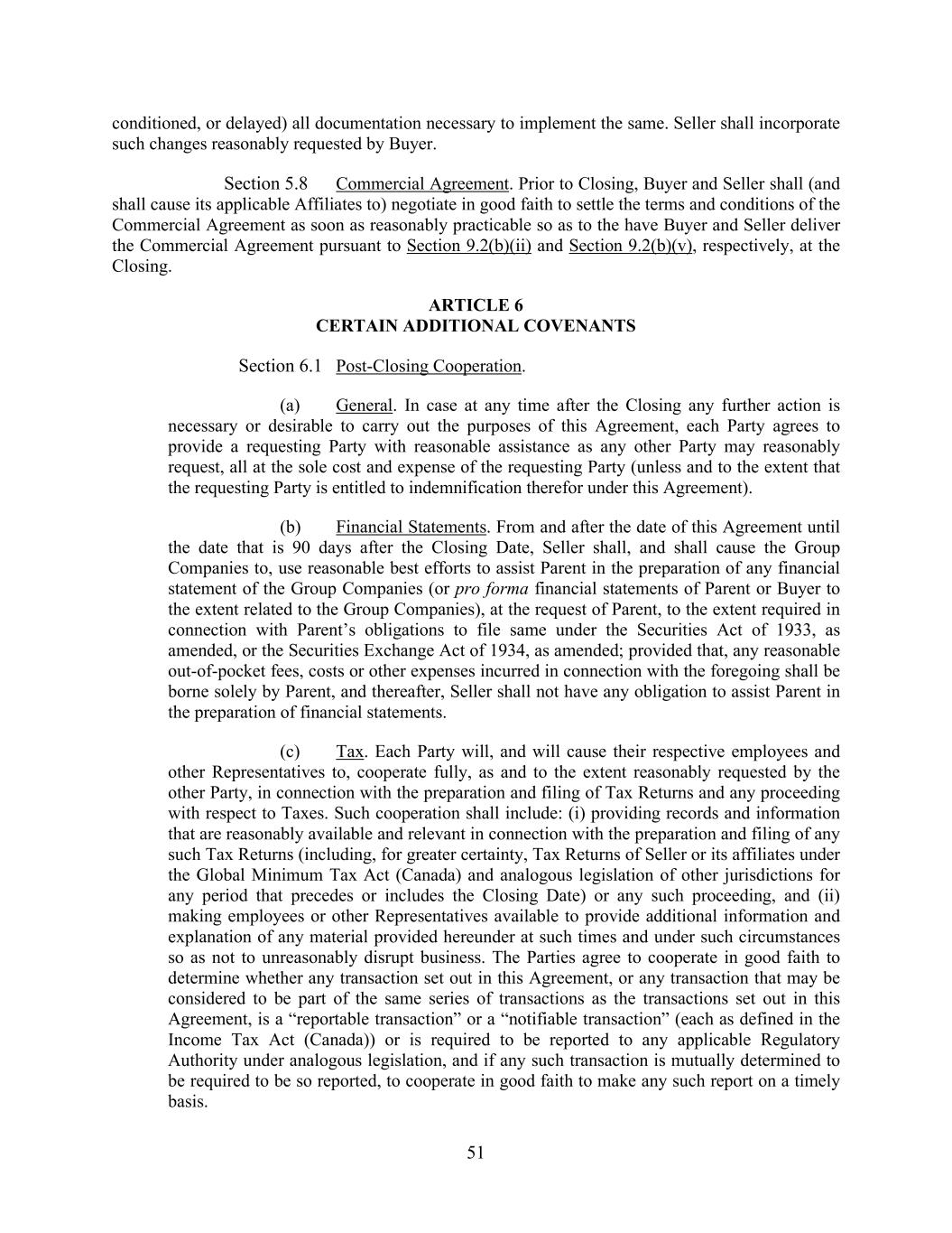51 conditioned, or delayed) all documentation necessary to implement the same. Seller shall incorporate such changes reasonably requested by Buyer. Section 5.8 Commercial Agreement. Prior to Closing, Buyer and Seller shall (and shall cause its applicable Affiliates to) negotiate in good faith to settle the terms and conditions of the Commercial Agreement as soon as reasonably practicable so as to the have Buyer and Seller deliver the Commercial Agreement pursuant to Section 9.2(b)(ii) and Section 9.2(b)(v), respectively, at the Closing. ARTICLE 6 CERTAIN ADDITIONAL COVENANTS Section 6.1 Post-Closing Cooperation. (a) General. In case at any time after the Closing any further action is necessary or desirable to carry out the purposes of this Agreement, each Party agrees to provide a requesting Party with reasonable assistance as any other Party may reasonably request, all at the sole cost and expense of the requesting Party (unless and to the extent that the requesting Party is entitled to indemnification therefor under this Agreement). (b) Financial Statements. From and after the date of this Agreement until the date that is 90 days after the Closing Date, Seller shall, and shall cause the Group Companies to, use reasonable best efforts to assist Parent in the preparation of any financial statement of the Group Companies (or pro forma financial statements of Parent or Buyer to the extent related to the Group Companies), at the request of Parent, to the extent required in connection with Parent’s obligations to file same under the Securities Act of 1933, as amended, or the Securities Exchange Act of 1934, as amended; provided that, any reasonable out-of-pocket fees, costs or other expenses incurred in connection with the foregoing shall be borne solely by Parent, and thereafter, Seller shall not have any obligation to assist Parent in the preparation of financial statements. (c) Tax. Each Party will, and will cause their respective employees and other Representatives to, cooperate fully, as and to the extent reasonably requested by the other Party, in connection with the preparation and filing of Tax Returns and any proceeding with respect to Taxes. Such cooperation shall include: (i) providing records and information that are reasonably available and relevant in connection with the preparation and filing of any such Tax Returns (including, for greater certainty, Tax Returns of Seller or its affiliates under the Global Minimum Tax Act (Canada) and analogous legislation of other jurisdictions for any period that precedes or includes the Closing Date) or any such proceeding, and (ii) making employees or other Representatives available to provide additional information and explanation of any material provided hereunder at such times and under such circumstances so as not to unreasonably disrupt business. The Parties agree to cooperate in good faith to determine whether any transaction set out in this Agreement, or any transaction that may be considered to be part of the same series of transactions as the transactions set out in this Agreement, is a “reportable transaction” or a “notifiable transaction” (each as defined in the Income Tax Act (Canada)) or is required to be reported to any applicable Regulatory Authority under analogous legislation, and if any such transaction is mutually determined to be required to be so reported, to cooperate in good faith to make any such report on a timely basis.