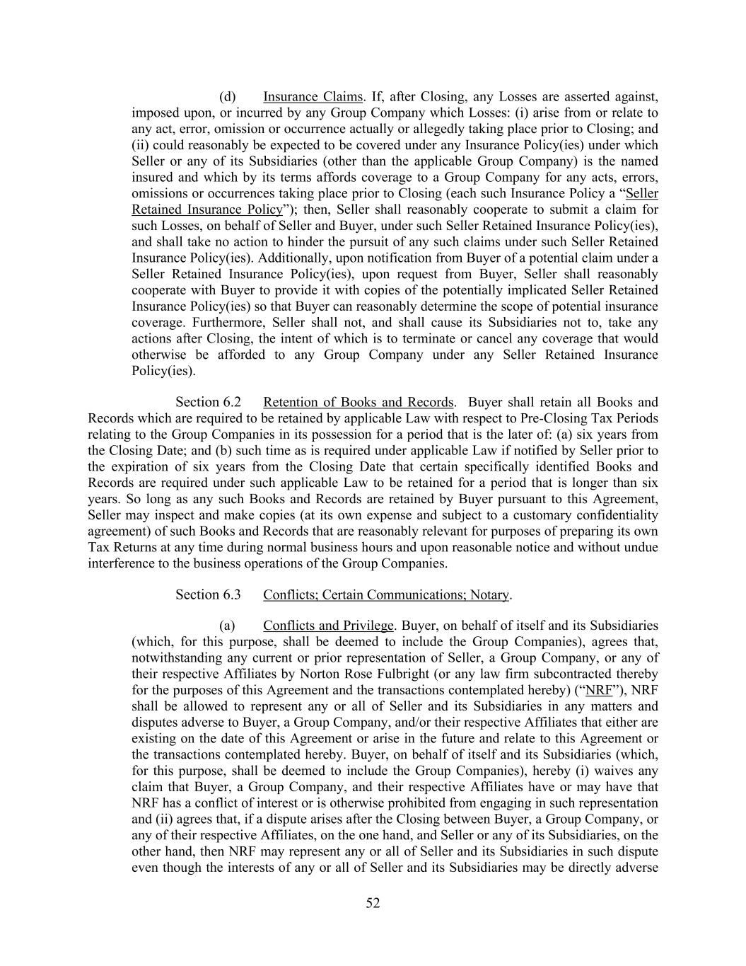 52 (d) Insurance Claims. If, after Closing, any Losses are asserted against, imposed upon, or incurred by any Group Company which Losses: (i) arise from or relate to any act, error, omission or occurrence actually or allegedly taking place prior to Closing; and (ii) could reasonably be expected to be covered under any Insurance Policy(ies) under which Seller or any of its Subsidiaries (other than the applicable Group Company) is the named insured and which by its terms affords coverage to a Group Company for any acts, errors, omissions or occurrences taking place prior to Closing (each such Insurance Policy a “Seller Retained Insurance Policy”); then, Seller shall reasonably cooperate to submit a claim for such Losses, on behalf of Seller and Buyer, under such Seller Retained Insurance Policy(ies), and shall take no action to hinder the pursuit of any such claims under such Seller Retained Insurance Policy(ies). Additionally, upon notification from Buyer of a potential claim under a Seller Retained Insurance Policy(ies), upon request from Buyer, Seller shall reasonably cooperate with Buyer to provide it with copies of the potentially implicated Seller Retained Insurance Policy(ies) so that Buyer can reasonably determine the scope of potential insurance coverage. Furthermore, Seller shall not, and shall cause its Subsidiaries not to, take any actions after Closing, the intent of which is to terminate or cancel any coverage that would otherwise be afforded to any Group Company under any Seller Retained Insurance Policy(ies). Section 6.2 Retention of Books and Records. Buyer shall retain all Books and Records which are required to be retained by applicable Law with respect to Pre-Closing Tax Periods relating to the Group Companies in its possession for a period that is the later of: (a) six years from the Closing Date; and (b) such time as is required under applicable Law if notified by Seller prior to the expiration of six years from the Closing Date that certain specifically identified Books and Records are required under such applicable Law to be retained for a period that is longer than six years. So long as any such Books and Records are retained by Buyer pursuant to this Agreement, Seller may inspect and make copies (at its own expense and subject to a customary confidentiality agreement) of such Books and Records that are reasonably relevant for purposes of preparing its own Tax Returns at any time during normal business hours and upon reasonable notice and without undue interference to the business operations of the Group Companies. Section 6.3 Conflicts; Certain Communications; Notary. (a) Conflicts and Privilege. Buyer, on behalf of itself and its Subsidiaries (which, for this purpose, shall be deemed to include the Group Companies), agrees that, notwithstanding any current or prior representation of Seller, a Group Company, or any of their respective Affiliates by Norton Rose Fulbright (or any law firm subcontracted thereby for the purposes of this Agreement and the transactions contemplated hereby) (“NRF”), NRF shall be allowed to represent any or all of Seller and its Subsidiaries in any matters and disputes adverse to Buyer, a Group Company, and/or their respective Affiliates that either are existing on the date of this Agreement or arise in the future and relate to this Agreement or the transactions contemplated hereby. Buyer, on behalf of itself and its Subsidiaries (which, for this purpose, shall be deemed to include the Group Companies), hereby (i) waives any claim that Buyer, a Group Company, and their respective Affiliates have or may have that NRF has a conflict of interest or is otherwise prohibited from engaging in such representation and (ii) agrees that, if a dispute arises after the Closing between Buyer, a Group Company, or any of their respective Affiliates, on the one hand, and Seller or any of its Subsidiaries, on the other hand, then NRF may represent any or all of Seller and its Subsidiaries in such dispute even though the interests of any or all of Seller and its Subsidiaries may be directly adverse
