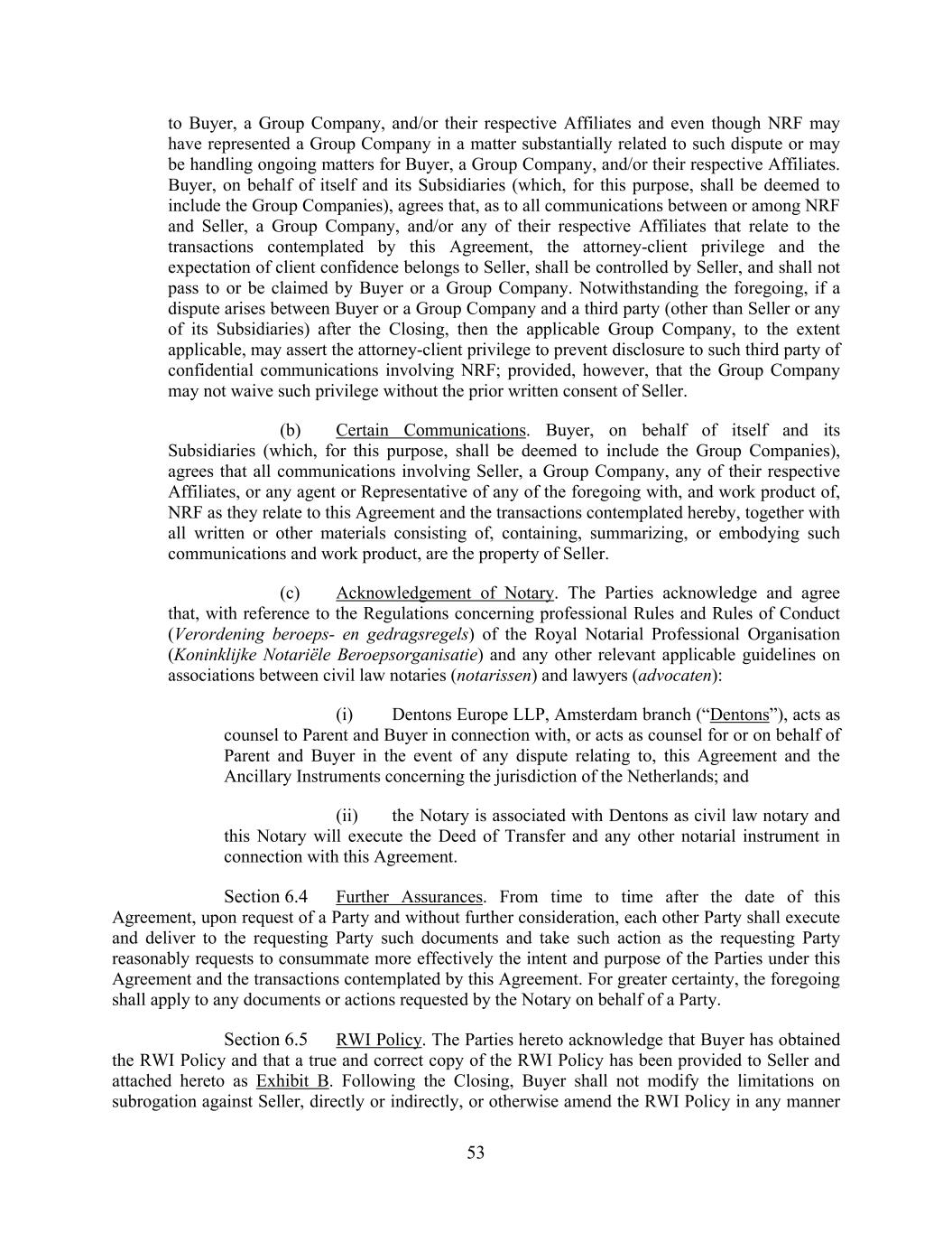 53 to Buyer, a Group Company, and/or their respective Affiliates and even though NRF may have represented a Group Company in a matter substantially related to such dispute or may be handling ongoing matters for Buyer, a Group Company, and/or their respective Affiliates. Buyer, on behalf of itself and its Subsidiaries (which, for this purpose, shall be deemed to include the Group Companies), agrees that, as to all communications between or among NRF and Seller, a Group Company, and/or any of their respective Affiliates that relate to the transactions contemplated by this Agreement, the attorney-client privilege and the expectation of client confidence belongs to Seller, shall be controlled by Seller, and shall not pass to or be claimed by Buyer or a Group Company. Notwithstanding the foregoing, if a dispute arises between Buyer or a Group Company and a third party (other than Seller or any of its Subsidiaries) after the Closing, then the applicable Group Company, to the extent applicable, may assert the attorney-client privilege to prevent disclosure to such third party of confidential communications involving NRF; provided, however, that the Group Company may not waive such privilege without the prior written consent of Seller. (b) Certain Communications. Buyer, on behalf of itself and its Subsidiaries (which, for this purpose, shall be deemed to include the Group Companies), agrees that all communications involving Seller, a Group Company, any of their respective Affiliates, or any agent or Representative of any of the foregoing with, and work product of, NRF as they relate to this Agreement and the transactions contemplated hereby, together with all written or other materials consisting of, containing, summarizing, or embodying such communications and work product, are the property of Seller. (c) Acknowledgement of Notary. The Parties acknowledge and agree that, with reference to the Regulations concerning professional Rules and Rules of Conduct (Verordening beroeps- en gedragsregels) of the Royal Notarial Professional Organisation (Koninklijke Notariële Beroepsorganisatie) and any other relevant applicable guidelines on associations between civil law notaries (notarissen) and lawyers (advocaten): (i) Dentons Europe LLP, Amsterdam branch (“Dentons”), acts as counsel to Parent and Buyer in connection with, or acts as counsel for or on behalf of Parent and Buyer in the event of any dispute relating to, this Agreement and the Ancillary Instruments concerning the jurisdiction of the Netherlands; and (ii) the Notary is associated with Dentons as civil law notary and this Notary will execute the Deed of Transfer and any other notarial instrument in connection with this Agreement. Section 6.4 Further Assurances. From time to time after the date of this Agreement, upon request of a Party and without further consideration, each other Party shall execute and deliver to the requesting Party such documents and take such action as the requesting Party reasonably requests to consummate more effectively the intent and purpose of the Parties under this Agreement and the transactions contemplated by this Agreement. For greater certainty, the foregoing shall apply to any documents or actions requested by the Notary on behalf of a Party. Section 6.5 RWI Policy. The Parties hereto acknowledge that Buyer has obtained the RWI Policy and that a true and correct copy of the RWI Policy has been provided to Seller and attached hereto as Exhibit B. Following the Closing, Buyer shall not modify the limitations on subrogation against Seller, directly or indirectly, or otherwise amend the RWI Policy in any manner
