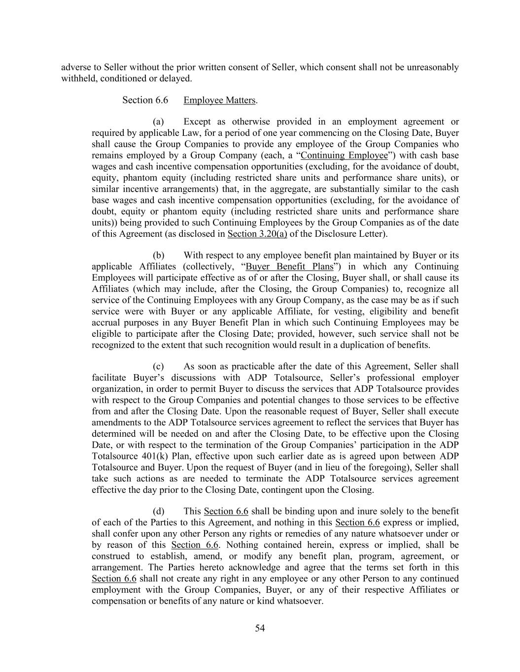 54 adverse to Seller without the prior written consent of Seller, which consent shall not be unreasonably withheld, conditioned or delayed. Section 6.6 Employee Matters. (a) Except as otherwise provided in an employment agreement or required by applicable Law, for a period of one year commencing on the Closing Date, Buyer shall cause the Group Companies to provide any employee of the Group Companies who remains employed by a Group Company (each, a “Continuing Employee”) with cash base wages and cash incentive compensation opportunities (excluding, for the avoidance of doubt, equity, phantom equity (including restricted share units and performance share units), or similar incentive arrangements) that, in the aggregate, are substantially similar to the cash base wages and cash incentive compensation opportunities (excluding, for the avoidance of doubt, equity or phantom equity (including restricted share units and performance share units)) being provided to such Continuing Employees by the Group Companies as of the date of this Agreement (as disclosed in Section 3.20(a) of the Disclosure Letter). (b) With respect to any employee benefit plan maintained by Buyer or its applicable Affiliates (collectively, “Buyer Benefit Plans”) in which any Continuing Employees will participate effective as of or after the Closing, Buyer shall, or shall cause its Affiliates (which may include, after the Closing, the Group Companies) to, recognize all service of the Continuing Employees with any Group Company, as the case may be as if such service were with Buyer or any applicable Affiliate, for vesting, eligibility and benefit accrual purposes in any Buyer Benefit Plan in which such Continuing Employees may be eligible to participate after the Closing Date; provided, however, such service shall not be recognized to the extent that such recognition would result in a duplication of benefits. (c) As soon as practicable after the date of this Agreement, Seller shall facilitate Buyer’s discussions with ADP Totalsource, Seller’s professional employer organization, in order to permit Buyer to discuss the services that ADP Totalsource provides with respect to the Group Companies and potential changes to those services to be effective from and after the Closing Date. Upon the reasonable request of Buyer, Seller shall execute amendments to the ADP Totalsource services agreement to reflect the services that Buyer has determined will be needed on and after the Closing Date, to be effective upon the Closing Date, or with respect to the termination of the Group Companies’ participation in the ADP Totalsource 401(k) Plan, effective upon such earlier date as is agreed upon between ADP Totalsource and Buyer. Upon the request of Buyer (and in lieu of the foregoing), Seller shall take such actions as are needed to terminate the ADP Totalsource services agreement effective the day prior to the Closing Date, contingent upon the Closing. (d) This Section 6.6 shall be binding upon and inure solely to the benefit of each of the Parties to this Agreement, and nothing in this Section 6.6 express or implied, shall confer upon any other Person any rights or remedies of any nature whatsoever under or by reason of this Section 6.6. Nothing contained herein, express or implied, shall be construed to establish, amend, or modify any benefit plan, program, agreement, or arrangement. The Parties hereto acknowledge and agree that the terms set forth in this Section 6.6 shall not create any right in any employee or any other Person to any continued employment with the Group Companies, Buyer, or any of their respective Affiliates or compensation or benefits of any nature or kind whatsoever.