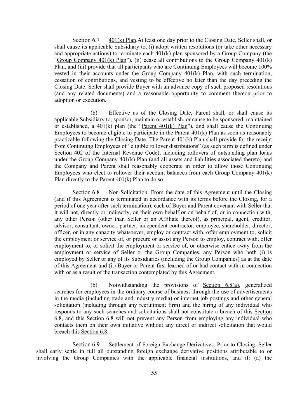 55 Section 6.7 401(k) Plan.At least one day prior to the Closing Date, Seller shall, or shall cause its applicable Subsidiary to, (i) adopt written resolutions (or take other necessary and appropriate actions) to terminate each 401(k) plan sponsored by a Group Company (the “Group Company 401(k) Plan”), (ii) cease all contributions to the Group Company 401(k) Plan, and (iii) provide that all participants who are Continuing Employees will become 100% vested in their accounts under the Group Company 401(k) Plan, with such termination, cessation of contributions, and vesting to be effective no later than the day preceding the Closing Date. Seller shall provide Buyer with an advance copy of such proposed resolutions (and any related documents) and a reasonable opportunity to comment thereon prior to adoption or execution. (b) Effective as of the Closing Date, Parent shall, or shall cause its applicable Subsidiary to, sponsor, maintain or establish, or cause to be sponsored, maintained or established, a 401(k) plan (the “Parent 401(k) Plan”), and shall cause the Continuing Employees to become eligible to participate in the Parent 401(k) Plan as soon as reasonably practicable following the Closing Date. The Parent 401(k) Plan shall provide for the receipt from Continuing Employees of “eligible rollover distributions” (as such term is defined under Section 402 of the Internal Revenue Code), including rollovers of outstanding plan loans under the Group Company 401(k) Plan (and all assets and liabilities associated thereto) and the Company and Parent shall reasonably cooperate in order to allow those Continuing Employees who elect to rollover their account balances from each Group Company 401(k) Plan directly to the Parent 401(k) Plan to do so. Section 6.8 Non-Solicitation. From the date of this Agreement until the Closing (and if this Agreement is terminated in accordance with its terms before the Closing, for a period of one year after such termination), each of Buyer and Parent covenant with Seller that it will not, directly or indirectly, on their own behalf or on behalf of, or in connection with, any other Person (other than Seller or an Affiliate thereof), as principal, agent, creditor, advisor, consultant, owner, partner, independent contractor, employee, shareholder, director, officer, or in any capacity whatsoever, employ or contract with, offer employment to, solicit the employment or service of, or procure or assist any Person to employ, contract with, offer employment to, or solicit the employment or service of, or otherwise entice away from the employment or service of Seller or the Group Companies, any Person who both (i) is employed by Seller or any of its Subsidiaries (including the Group Companies) as at the date of this Agreement and (ii) Buyer or Parent first learned of or had contact with in connection with or as a result of the transaction contemplated by this Agreement. (b) Notwithstanding the provisions of Section 6.8(a), generalized searches for employees in the ordinary course of business through the use of advertisements in the media (including trade and industry media) or internet job postings and other general solicitation (including through any recruitment firm) and the hiring of any individual who responds to any such searches and solicitations shall not constitute a breach of this Section 6.8, and this Section 6.8 will not prevent any Person from employing any individual who contacts them on their own initiative without any direct or indirect solicitation that would breach this Section 6.8. Section 6.9 Settlement of Foreign Exchange Derivatives. Prior to Closing, Seller shall early settle in full all outstanding foreign exchange derivative positions attributable to or involving the Group Companies with the applicable financial institutions, and if: (a) the