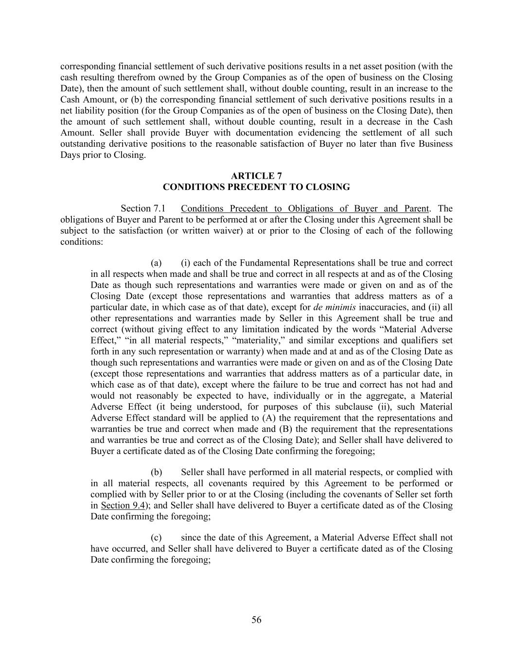 56 corresponding financial settlement of such derivative positions results in a net asset position (with the cash resulting therefrom owned by the Group Companies as of the open of business on the Closing Date), then the amount of such settlement shall, without double counting, result in an increase to the Cash Amount, or (b) the corresponding financial settlement of such derivative positions results in a net liability position (for the Group Companies as of the open of business on the Closing Date), then the amount of such settlement shall, without double counting, result in a decrease in the Cash Amount. Seller shall provide Buyer with documentation evidencing the settlement of all such outstanding derivative positions to the reasonable satisfaction of Buyer no later than five Business Days prior to Closing. ARTICLE 7 CONDITIONS PRECEDENT TO CLOSING Section 7.1 Conditions Precedent to Obligations of Buyer and Parent. The obligations of Buyer and Parent to be performed at or after the Closing under this Agreement shall be subject to the satisfaction (or written waiver) at or prior to the Closing of each of the following conditions: (a) (i) each of the Fundamental Representations shall be true and correct in all respects when made and shall be true and correct in all respects at and as of the Closing Date as though such representations and warranties were made or given on and as of the Closing Date (except those representations and warranties that address matters as of a particular date, in which case as of that date), except for de minimis inaccuracies, and (ii) all other representations and warranties made by Seller in this Agreement shall be true and correct (without giving effect to any limitation indicated by the words “Material Adverse Effect,” “in all material respects,” “materiality,” and similar exceptions and qualifiers set forth in any such representation or warranty) when made and at and as of the Closing Date as though such representations and warranties were made or given on and as of the Closing Date (except those representations and warranties that address matters as of a particular date, in which case as of that date), except where the failure to be true and correct has not had and would not reasonably be expected to have, individually or in the aggregate, a Material Adverse Effect (it being understood, for purposes of this subclause (ii), such Material Adverse Effect standard will be applied to (A) the requirement that the representations and warranties be true and correct when made and (B) the requirement that the representations and warranties be true and correct as of the Closing Date); and Seller shall have delivered to Buyer a certificate dated as of the Closing Date confirming the foregoing; (b) Seller shall have performed in all material respects, or complied with in all material respects, all covenants required by this Agreement to be performed or complied with by Seller prior to or at the Closing (including the covenants of Seller set forth in Section 9.4); and Seller shall have delivered to Buyer a certificate dated as of the Closing Date confirming the foregoing; (c) since the date of this Agreement, a Material Adverse Effect shall not have occurred, and Seller shall have delivered to Buyer a certificate dated as of the Closing Date confirming the foregoing;