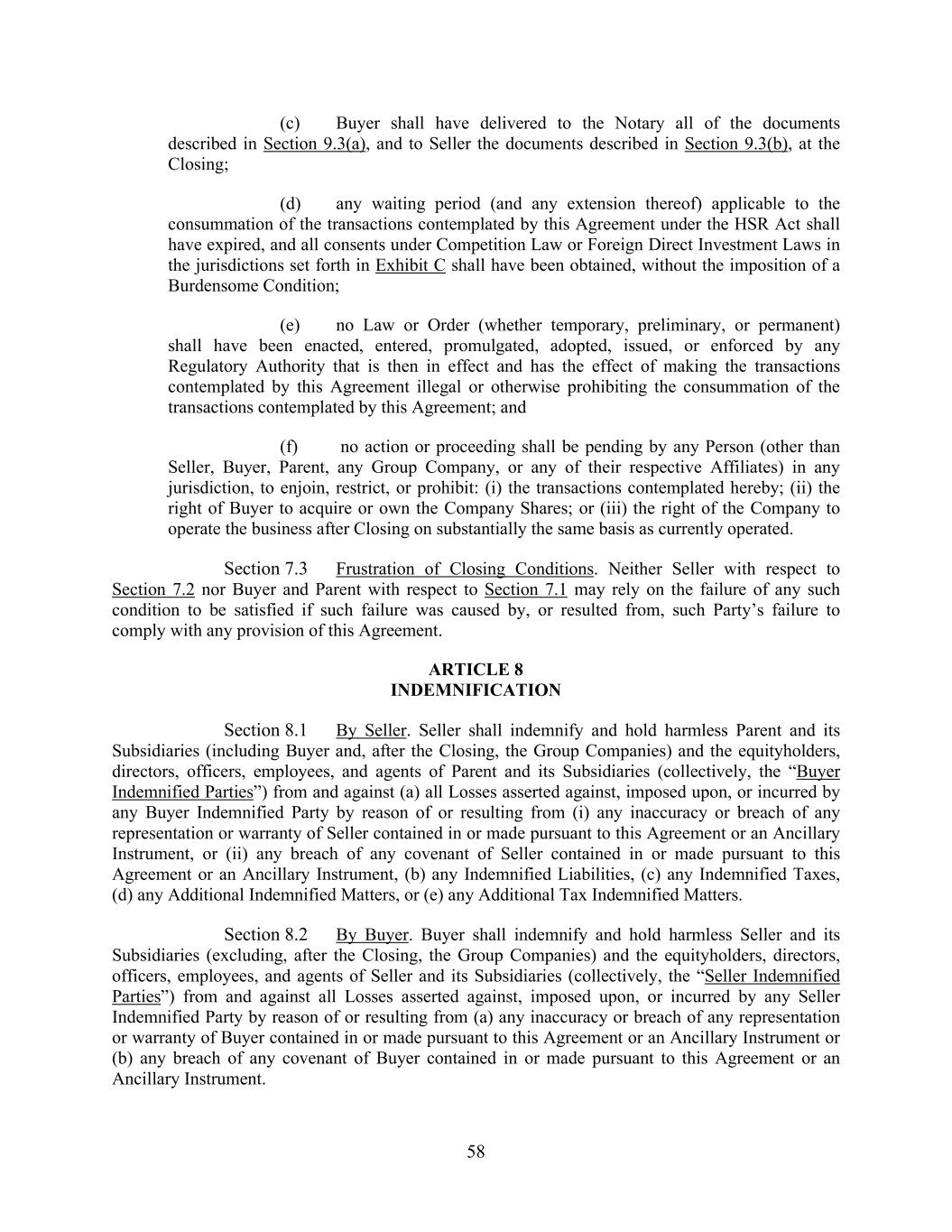58 (c) Buyer shall have delivered to the Notary all of the documents described in Section 9.3(a), and to Seller the documents described in Section 9.3(b), at the Closing; (d) any waiting period (and any extension thereof) applicable to the consummation of the transactions contemplated by this Agreement under the HSR Act shall have expired, and all consents under Competition Law or Foreign Direct Investment Laws in the jurisdictions set forth in Exhibit C shall have been obtained, without the imposition of a Burdensome Condition; (e) no Law or Order (whether temporary, preliminary, or permanent) shall have been enacted, entered, promulgated, adopted, issued, or enforced by any Regulatory Authority that is then in effect and has the effect of making the transactions contemplated by this Agreement illegal or otherwise prohibiting the consummation of the transactions contemplated by this Agreement; and (f) no action or proceeding shall be pending by any Person (other than Seller, Buyer, Parent, any Group Company, or any of their respective Affiliates) in any jurisdiction, to enjoin, restrict, or prohibit: (i) the transactions contemplated hereby; (ii) the right of Buyer to acquire or own the Company Shares; or (iii) the right of the Company to operate the business after Closing on substantially the same basis as currently operated. Section 7.3 Frustration of Closing Conditions. Neither Seller with respect to Section 7.2 nor Buyer and Parent with respect to Section 7.1 may rely on the failure of any such condition to be satisfied if such failure was caused by, or resulted from, such Party’s failure to comply with any provision of this Agreement. ARTICLE 8 INDEMNIFICATION Section 8.1 By Seller. Seller shall indemnify and hold harmless Parent and its Subsidiaries (including Buyer and, after the Closing, the Group Companies) and the equityholders, directors, officers, employees, and agents of Parent and its Subsidiaries (collectively, the “Buyer Indemnified Parties”) from and against (a) all Losses asserted against, imposed upon, or incurred by any Buyer Indemnified Party by reason of or resulting from (i) any inaccuracy or breach of any representation or warranty of Seller contained in or made pursuant to this Agreement or an Ancillary Instrument, or (ii) any breach of any covenant of Seller contained in or made pursuant to this Agreement or an Ancillary Instrument, (b) any Indemnified Liabilities, (c) any Indemnified Taxes, (d) any Additional Indemnified Matters, or (e) any Additional Tax Indemnified Matters. Section 8.2 By Buyer. Buyer shall indemnify and hold harmless Seller and its Subsidiaries (excluding, after the Closing, the Group Companies) and the equityholders, directors, officers, employees, and agents of Seller and its Subsidiaries (collectively, the “Seller Indemnified Parties”) from and against all Losses asserted against, imposed upon, or incurred by any Seller Indemnified Party by reason of or resulting from (a) any inaccuracy or breach of any representation or warranty of Buyer contained in or made pursuant to this Agreement or an Ancillary Instrument or (b) any breach of any covenant of Buyer contained in or made pursuant to this Agreement or an Ancillary Instrument.