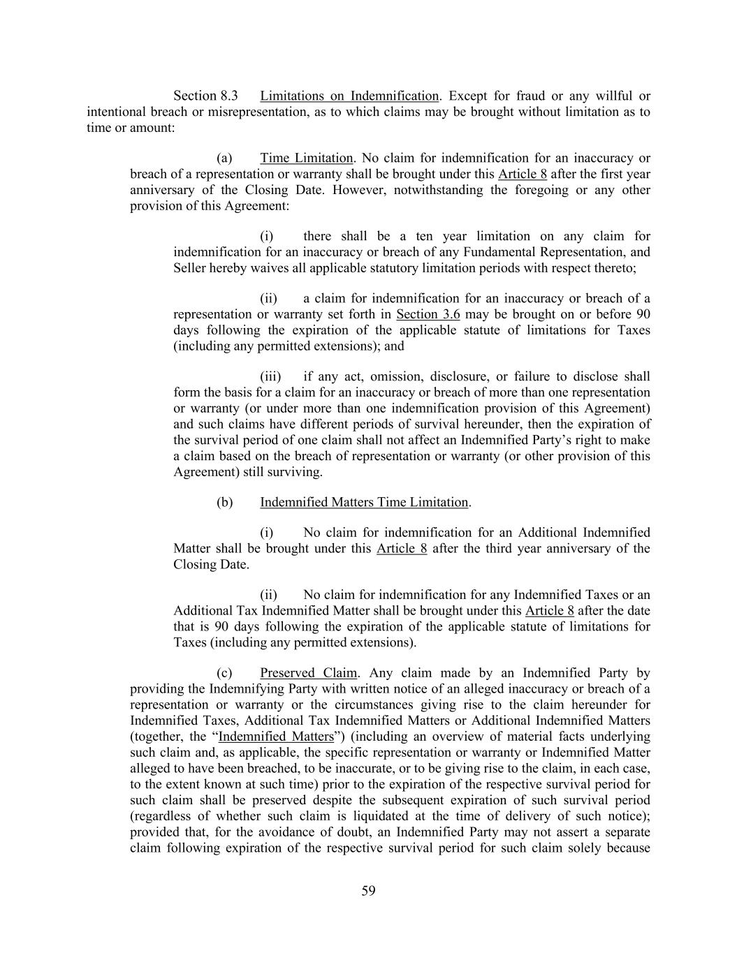 59 Section 8.3 Limitations on Indemnification. Except for fraud or any willful or intentional breach or misrepresentation, as to which claims may be brought without limitation as to time or amount: (a) Time Limitation. No claim for indemnification for an inaccuracy or breach of a representation or warranty shall be brought under this Article 8 after the first year anniversary of the Closing Date. However, notwithstanding the foregoing or any other provision of this Agreement: (i) there shall be a ten year limitation on any claim for indemnification for an inaccuracy or breach of any Fundamental Representation, and Seller hereby waives all applicable statutory limitation periods with respect thereto; (ii) a claim for indemnification for an inaccuracy or breach of a representation or warranty set forth in Section 3.6 may be brought on or before 90 days following the expiration of the applicable statute of limitations for Taxes (including any permitted extensions); and (iii) if any act, omission, disclosure, or failure to disclose shall form the basis for a claim for an inaccuracy or breach of more than one representation or warranty (or under more than one indemnification provision of this Agreement) and such claims have different periods of survival hereunder, then the expiration of the survival period of one claim shall not affect an Indemnified Party’s right to make a claim based on the breach of representation or warranty (or other provision of this Agreement) still surviving. (b) Indemnified Matters Time Limitation. (i) No claim for indemnification for an Additional Indemnified Matter shall be brought under this Article 8 after the third year anniversary of the Closing Date. (ii) No claim for indemnification for any Indemnified Taxes or an Additional Tax Indemnified Matter shall be brought under this Article 8 after the date that is 90 days following the expiration of the applicable statute of limitations for Taxes (including any permitted extensions). (c) Preserved Claim. Any claim made by an Indemnified Party by providing the Indemnifying Party with written notice of an alleged inaccuracy or breach of a representation or warranty or the circumstances giving rise to the claim hereunder for Indemnified Taxes, Additional Tax Indemnified Matters or Additional Indemnified Matters (together, the “Indemnified Matters”) (including an overview of material facts underlying such claim and, as applicable, the specific representation or warranty or Indemnified Matter alleged to have been breached, to be inaccurate, or to be giving rise to the claim, in each case, to the extent known at such time) prior to the expiration of the respective survival period for such claim shall be preserved despite the subsequent expiration of such survival period (regardless of whether such claim is liquidated at the time of delivery of such notice); provided that, for the avoidance of doubt, an Indemnified Party may not assert a separate claim following expiration of the respective survival period for such claim solely because
