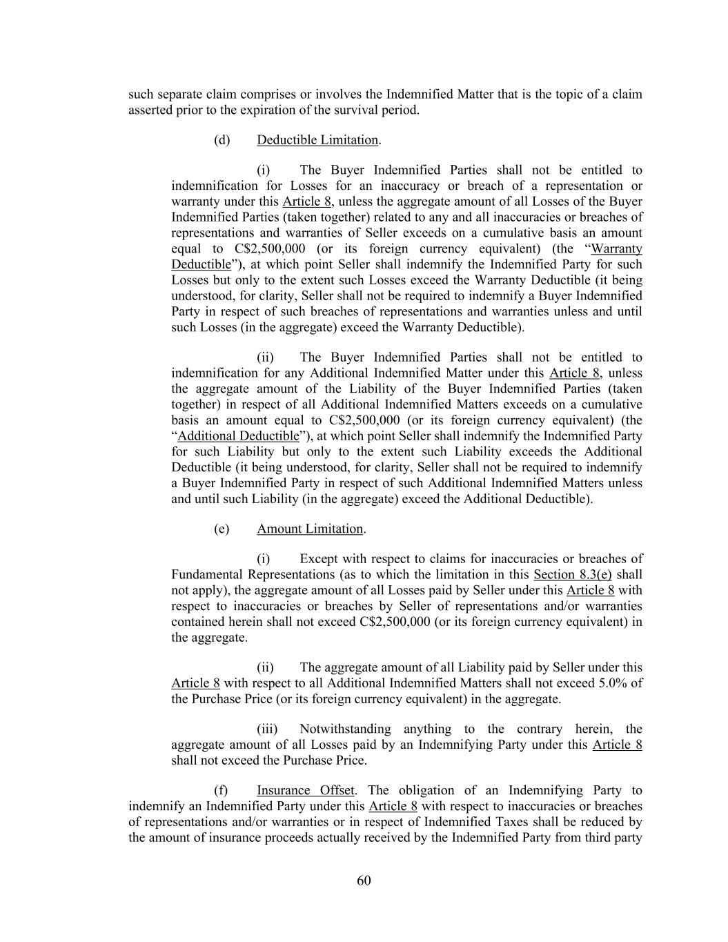 60 such separate claim comprises or involves the Indemnified Matter that is the topic of a claim asserted prior to the expiration of the survival period. (d) Deductible Limitation. (i) The Buyer Indemnified Parties shall not be entitled to indemnification for Losses for an inaccuracy or breach of a representation or warranty under this Article 8, unless the aggregate amount of all Losses of the Buyer Indemnified Parties (taken together) related to any and all inaccuracies or breaches of representations and warranties of Seller exceeds on a cumulative basis an amount equal to C$2,500,000 (or its foreign currency equivalent) (the “Warranty Deductible”), at which point Seller shall indemnify the Indemnified Party for such Losses but only to the extent such Losses exceed the Warranty Deductible (it being understood, for clarity, Seller shall not be required to indemnify a Buyer Indemnified Party in respect of such breaches of representations and warranties unless and until such Losses (in the aggregate) exceed the Warranty Deductible). (ii) The Buyer Indemnified Parties shall not be entitled to indemnification for any Additional Indemnified Matter under this Article 8, unless the aggregate amount of the Liability of the Buyer Indemnified Parties (taken together) in respect of all Additional Indemnified Matters exceeds on a cumulative basis an amount equal to C$2,500,000 (or its foreign currency equivalent) (the “Additional Deductible”), at which point Seller shall indemnify the Indemnified Party for such Liability but only to the extent such Liability exceeds the Additional Deductible (it being understood, for clarity, Seller shall not be required to indemnify a Buyer Indemnified Party in respect of such Additional Indemnified Matters unless and until such Liability (in the aggregate) exceed the Additional Deductible). (e) Amount Limitation. (i) Except with respect to claims for inaccuracies or breaches of Fundamental Representations (as to which the limitation in this Section 8.3(e) shall not apply), the aggregate amount of all Losses paid by Seller under this Article 8 with respect to inaccuracies or breaches by Seller of representations and/or warranties contained herein shall not exceed C$2,500,000 (or its foreign currency equivalent) in the aggregate. (ii) The aggregate amount of all Liability paid by Seller under this Article 8 with respect to all Additional Indemnified Matters shall not exceed 5.0% of the Purchase Price (or its foreign currency equivalent) in the aggregate. (iii) Notwithstanding anything to the contrary herein, the aggregate amount of all Losses paid by an Indemnifying Party under this Article 8 shall not exceed the Purchase Price. (f) Insurance Offset. The obligation of an Indemnifying Party to indemnify an Indemnified Party under this Article 8 with respect to inaccuracies or breaches of representations and/or warranties or in respect of Indemnified Taxes shall be reduced by the amount of insurance proceeds actually received by the Indemnified Party from third party