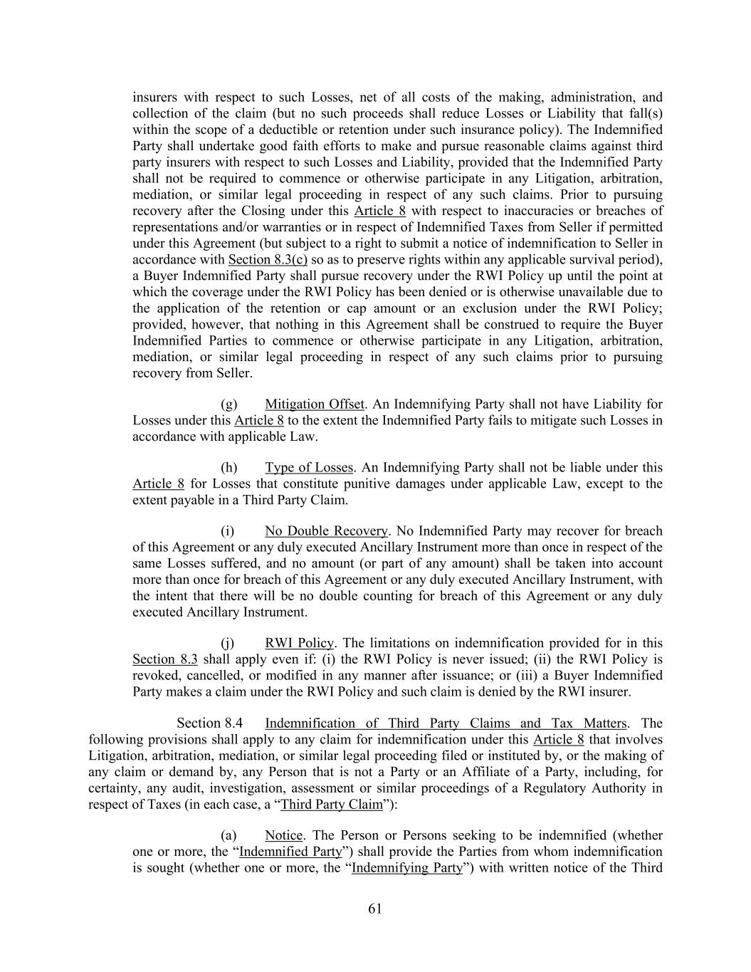 61 insurers with respect to such Losses, net of all costs of the making, administration, and collection of the claim (but no such proceeds shall reduce Losses or Liability that fall(s) within the scope of a deductible or retention under such insurance policy). The Indemnified Party shall undertake good faith efforts to make and pursue reasonable claims against third party insurers with respect to such Losses and Liability, provided that the Indemnified Party shall not be required to commence or otherwise participate in any Litigation, arbitration, mediation, or similar legal proceeding in respect of any such claims. Prior to pursuing recovery after the Closing under this Article 8 with respect to inaccuracies or breaches of representations and/or warranties or in respect of Indemnified Taxes from Seller if permitted under this Agreement (but subject to a right to submit a notice of indemnification to Seller in accordance with Section 8.3(c) so as to preserve rights within any applicable survival period), a Buyer Indemnified Party shall pursue recovery under the RWI Policy up until the point at which the coverage under the RWI Policy has been denied or is otherwise unavailable due to the application of the retention or cap amount or an exclusion under the RWI Policy; provided, however, that nothing in this Agreement shall be construed to require the Buyer Indemnified Parties to commence or otherwise participate in any Litigation, arbitration, mediation, or similar legal proceeding in respect of any such claims prior to pursuing recovery from Seller. (g) Mitigation Offset. An Indemnifying Party shall not have Liability for Losses under this Article 8 to the extent the Indemnified Party fails to mitigate such Losses in accordance with applicable Law. (h) Type of Losses. An Indemnifying Party shall not be liable under this Article 8 for Losses that constitute punitive damages under applicable Law, except to the extent payable in a Third Party Claim. (i) No Double Recovery. No Indemnified Party may recover for breach of this Agreement or any duly executed Ancillary Instrument more than once in respect of the same Losses suffered, and no amount (or part of any amount) shall be taken into account more than once for breach of this Agreement or any duly executed Ancillary Instrument, with the intent that there will be no double counting for breach of this Agreement or any duly executed Ancillary Instrument. (j) RWI Policy. The limitations on indemnification provided for in this Section 8.3 shall apply even if: (i) the RWI Policy is never issued; (ii) the RWI Policy is revoked, cancelled, or modified in any manner after issuance; or (iii) a Buyer Indemnified Party makes a claim under the RWI Policy and such claim is denied by the RWI insurer. Section 8.4 Indemnification of Third Party Claims and Tax Matters. The following provisions shall apply to any claim for indemnification under this Article 8 that involves Litigation, arbitration, mediation, or similar legal proceeding filed or instituted by, or the making of any claim or demand by, any Person that is not a Party or an Affiliate of a Party, including, for certainty, any audit, investigation, assessment or similar proceedings of a Regulatory Authority in respect of Taxes (in each case, a “Third Party Claim”): (a) Notice. The Person or Persons seeking to be indemnified (whether one or more, the “Indemnified Party”) shall provide the Parties from whom indemnification is sought (whether one or more, the “Indemnifying Party”) with written notice of the Third