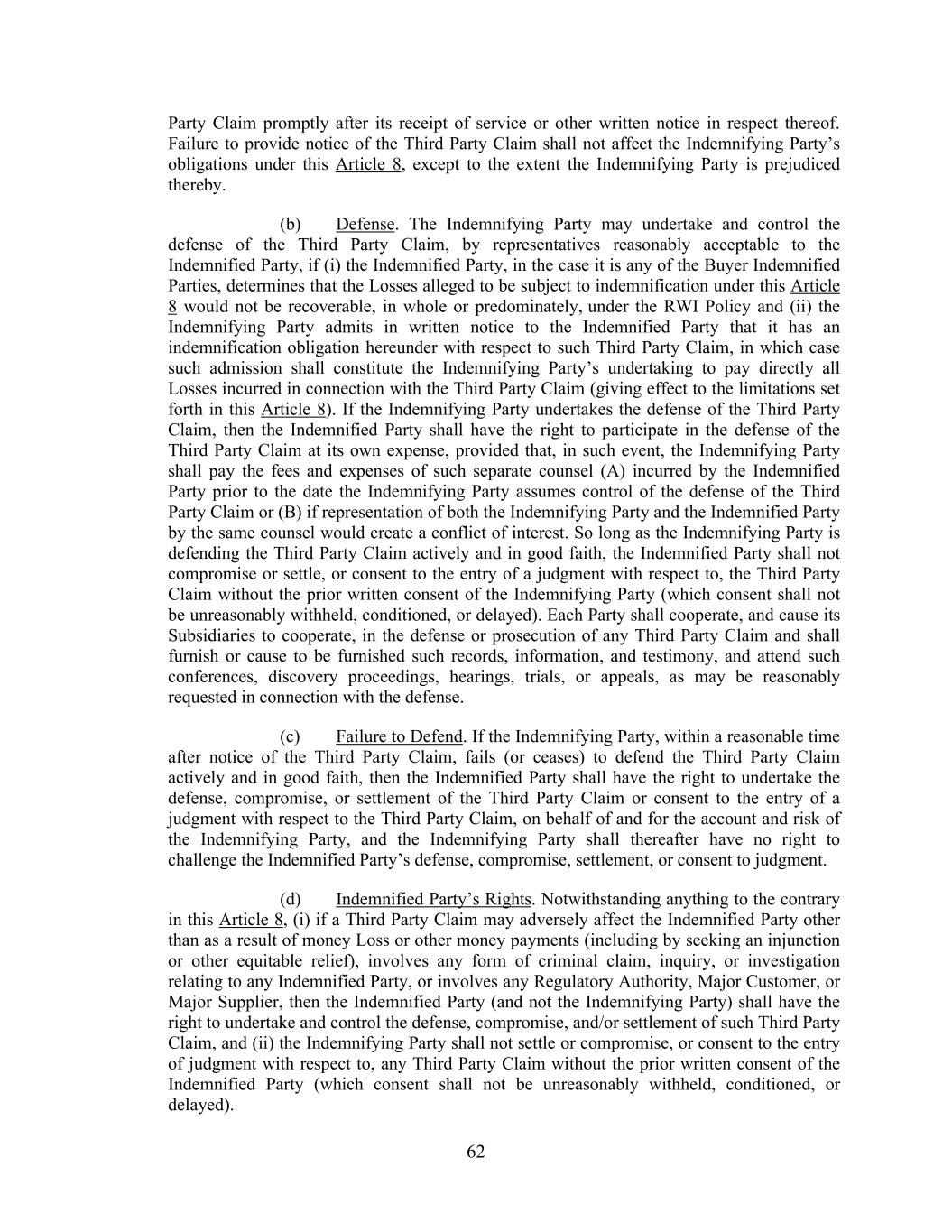 62 Party Claim promptly after its receipt of service or other written notice in respect thereof. Failure to provide notice of the Third Party Claim shall not affect the Indemnifying Party’s obligations under this Article 8, except to the extent the Indemnifying Party is prejudiced thereby. (b) Defense. The Indemnifying Party may undertake and control the defense of the Third Party Claim, by representatives reasonably acceptable to the Indemnified Party, if (i) the Indemnified Party, in the case it is any of the Buyer Indemnified Parties, determines that the Losses alleged to be subject to indemnification under this Article 8 would not be recoverable, in whole or predominately, under the RWI Policy and (ii) the Indemnifying Party admits in written notice to the Indemnified Party that it has an indemnification obligation hereunder with respect to such Third Party Claim, in which case such admission shall constitute the Indemnifying Party’s undertaking to pay directly all Losses incurred in connection with the Third Party Claim (giving effect to the limitations set forth in this Article 8). If the Indemnifying Party undertakes the defense of the Third Party Claim, then the Indemnified Party shall have the right to participate in the defense of the Third Party Claim at its own expense, provided that, in such event, the Indemnifying Party shall pay the fees and expenses of such separate counsel (A) incurred by the Indemnified Party prior to the date the Indemnifying Party assumes control of the defense of the Third Party Claim or (B) if representation of both the Indemnifying Party and the Indemnified Party by the same counsel would create a conflict of interest. So long as the Indemnifying Party is defending the Third Party Claim actively and in good faith, the Indemnified Party shall not compromise or settle, or consent to the entry of a judgment with respect to, the Third Party Claim without the prior written consent of the Indemnifying Party (which consent shall not be unreasonably withheld, conditioned, or delayed). Each Party shall cooperate, and cause its Subsidiaries to cooperate, in the defense or prosecution of any Third Party Claim and shall furnish or cause to be furnished such records, information, and testimony, and attend such conferences, discovery proceedings, hearings, trials, or appeals, as may be reasonably requested in connection with the defense. (c) Failure to Defend. If the Indemnifying Party, within a reasonable time after notice of the Third Party Claim, fails (or ceases) to defend the Third Party Claim actively and in good faith, then the Indemnified Party shall have the right to undertake the defense, compromise, or settlement of the Third Party Claim or consent to the entry of a judgment with respect to the Third Party Claim, on behalf of and for the account and risk of the Indemnifying Party, and the Indemnifying Party shall thereafter have no right to challenge the Indemnified Party’s defense, compromise, settlement, or consent to judgment. (d) Indemnified Party’s Rights. Notwithstanding anything to the contrary in this Article 8, (i) if a Third Party Claim may adversely affect the Indemnified Party other than as a result of money Loss or other money payments (including by seeking an injunction or other equitable relief), involves any form of criminal claim, inquiry, or investigation relating to any Indemnified Party, or involves any Regulatory Authority, Major Customer, or Major Supplier, then the Indemnified Party (and not the Indemnifying Party) shall have the right to undertake and control the defense, compromise, and/or settlement of such Third Party Claim, and (ii) the Indemnifying Party shall not settle or compromise, or consent to the entry of judgment with respect to, any Third Party Claim without the prior written consent of the Indemnified Party (which consent shall not be unreasonably withheld, conditioned, or delayed).