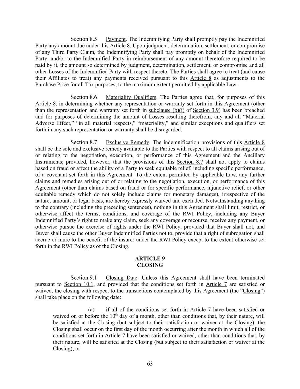 63 Section 8.5 Payment. The Indemnifying Party shall promptly pay the Indemnified Party any amount due under this Article 8. Upon judgment, determination, settlement, or compromise of any Third Party Claim, the Indemnifying Party shall pay promptly on behalf of the Indemnified Party, and/or to the Indemnified Party in reimbursement of any amount theretofore required to be paid by it, the amount so determined by judgment, determination, settlement, or compromise and all other Losses of the Indemnified Party with respect thereto. The Parties shall agree to treat (and cause their Affiliates to treat) any payments received pursuant to this Article 8 as adjustments to the Purchase Price for all Tax purposes, to the maximum extent permitted by applicable Law. Section 8.6 Materiality Qualifiers. The Parties agree that, for purposes of this Article 8, in determining whether any representation or warranty set forth in this Agreement (other than the representation and warranty set forth in subclause (b)(i) of Section 3.9) has been breached and for purposes of determining the amount of Losses resulting therefrom, any and all “Material Adverse Effect,” “in all material respects,” “materiality,” and similar exceptions and qualifiers set forth in any such representation or warranty shall be disregarded. Section 8.7 Exclusive Remedy. The indemnification provisions of this Article 8 shall be the sole and exclusive remedy available to the Parties with respect to all claims arising out of or relating to the negotiation, execution, or performance of this Agreement and the Ancillary Instruments; provided, however, that the provisions of this Section 8.7 shall not apply to claims based on fraud or affect the ability of a Party to seek equitable relief, including specific performance, of a covenant set forth in this Agreement. To the extent permitted by applicable Law, any further claims and remedies arising out of or relating to the negotiation, execution, or performance of this Agreement (other than claims based on fraud or for specific performance, injunctive relief, or other equitable remedy which do not solely include claims for monetary damages), irrespective of the nature, amount, or legal basis, are hereby expressly waived and excluded. Notwithstanding anything to the contrary (including the preceding sentences), nothing in this Agreement shall limit, restrict, or otherwise affect the terms, conditions, and coverage of the RWI Policy, including any Buyer Indemnified Party’s right to make any claim, seek any coverage or recourse, receive any payment, or otherwise pursue the exercise of rights under the RWI Policy, provided that Buyer shall not, and Buyer shall cause the other Buyer Indemnified Parties not to, provide that a right of subrogation shall accrue or inure to the benefit of the insurer under the RWI Policy except to the extent otherwise set forth in the RWI Policy as of the Closing. ARTICLE 9 CLOSING Section 9.1 Closing Date. Unless this Agreement shall have been terminated pursuant to Section 10.1, and provided that the conditions set forth in Article 7 are satisfied or waived, the closing with respect to the transactions contemplated by this Agreement (the “Closing”) shall take place on the following date: (a) if all of the conditions set forth in Article 7 have been satisfied or waived on or before the 10th day of a month, other than conditions that, by their nature, will be satisfied at the Closing (but subject to their satisfaction or waiver at the Closing), the Closing shall occur on the first day of the month occurring after the month in which all of the conditions set forth in Article 7 have been satisfied or waived, other than conditions that, by their nature, will be satisfied at the Closing (but subject to their satisfaction or waiver at the Closing); or