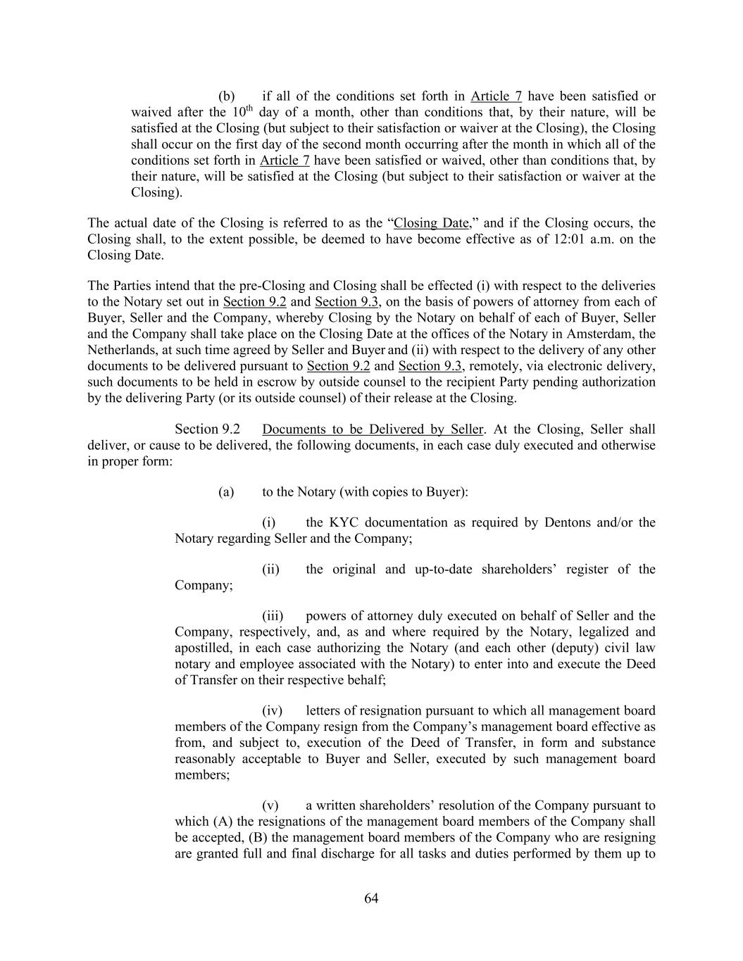 64 (b) if all of the conditions set forth in Article 7 have been satisfied or waived after the 10th day of a month, other than conditions that, by their nature, will be satisfied at the Closing (but subject to their satisfaction or waiver at the Closing), the Closing shall occur on the first day of the second month occurring after the month in which all of the conditions set forth in Article 7 have been satisfied or waived, other than conditions that, by their nature, will be satisfied at the Closing (but subject to their satisfaction or waiver at the Closing). The actual date of the Closing is referred to as the “Closing Date,” and if the Closing occurs, the Closing shall, to the extent possible, be deemed to have become effective as of 12:01 a.m. on the Closing Date. The Parties intend that the pre-Closing and Closing shall be effected (i) with respect to the deliveries to the Notary set out in Section 9.2 and Section 9.3, on the basis of powers of attorney from each of Buyer, Seller and the Company, whereby Closing by the Notary on behalf of each of Buyer, Seller and the Company shall take place on the Closing Date at the offices of the Notary in Amsterdam, the Netherlands, at such time agreed by Seller and Buyer and (ii) with respect to the delivery of any other documents to be delivered pursuant to Section 9.2 and Section 9.3, remotely, via electronic delivery, such documents to be held in escrow by outside counsel to the recipient Party pending authorization by the delivering Party (or its outside counsel) of their release at the Closing. Section 9.2 Documents to be Delivered by Seller. At the Closing, Seller shall deliver, or cause to be delivered, the following documents, in each case duly executed and otherwise in proper form: (a) to the Notary (with copies to Buyer): (i) the KYC documentation as required by Dentons and/or the Notary regarding Seller and the Company; (ii) the original and up-to-date shareholders’ register of the Company; (iii) powers of attorney duly executed on behalf of Seller and the Company, respectively, and, as and where required by the Notary, legalized and apostilled, in each case authorizing the Notary (and each other (deputy) civil law notary and employee associated with the Notary) to enter into and execute the Deed of Transfer on their respective behalf; (iv) letters of resignation pursuant to which all management board members of the Company resign from the Company’s management board effective as from, and subject to, execution of the Deed of Transfer, in form and substance reasonably acceptable to Buyer and Seller, executed by such management board members; (v) a written shareholders’ resolution of the Company pursuant to which (A) the resignations of the management board members of the Company shall be accepted, (B) the management board members of the Company who are resigning are granted full and final discharge for all tasks and duties performed by them up to