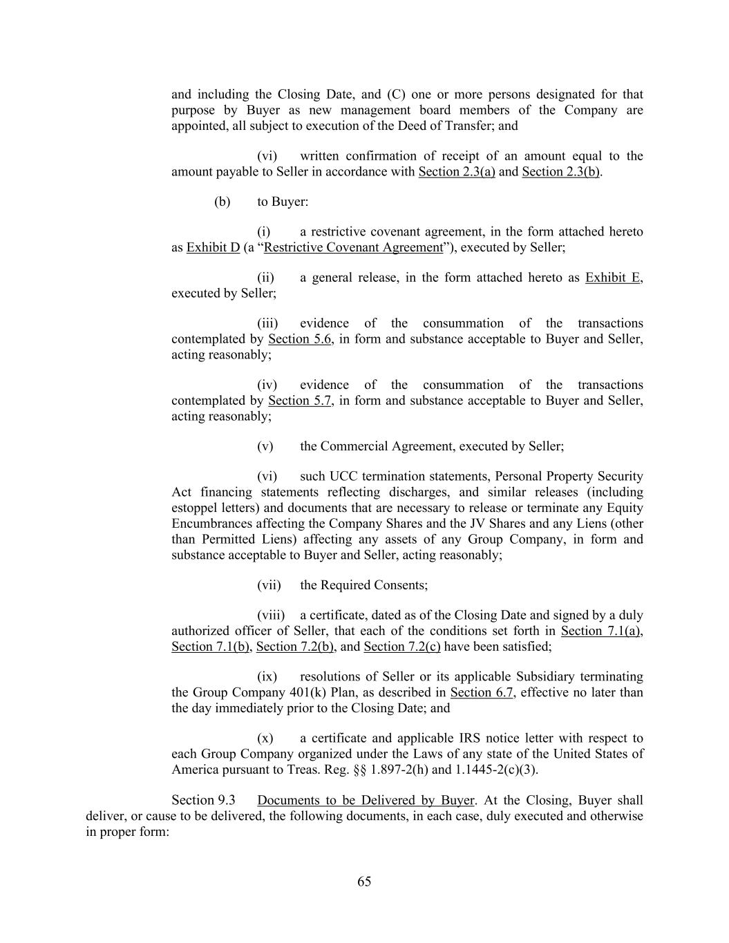 65 and including the Closing Date, and (C) one or more persons designated for that purpose by Buyer as new management board members of the Company are appointed, all subject to execution of the Deed of Transfer; and (vi) written confirmation of receipt of an amount equal to the amount payable to Seller in accordance with Section 2.3(a) and Section 2.3(b). (b) to Buyer: (i) a restrictive covenant agreement, in the form attached hereto as Exhibit D (a “Restrictive Covenant Agreement”), executed by Seller; (ii) a general release, in the form attached hereto as Exhibit E, executed by Seller; (iii) evidence of the consummation of the transactions contemplated by Section 5.6, in form and substance acceptable to Buyer and Seller, acting reasonably; (iv) evidence of the consummation of the transactions contemplated by Section 5.7, in form and substance acceptable to Buyer and Seller, acting reasonably; (v) the Commercial Agreement, executed by Seller; (vi) such UCC termination statements, Personal Property Security Act financing statements reflecting discharges, and similar releases (including estoppel letters) and documents that are necessary to release or terminate any Equity Encumbrances affecting the Company Shares and the JV Shares and any Liens (other than Permitted Liens) affecting any assets of any Group Company, in form and substance acceptable to Buyer and Seller, acting reasonably; (vii) the Required Consents; (viii) a certificate, dated as of the Closing Date and signed by a duly authorized officer of Seller, that each of the conditions set forth in Section 7.1(a), Section 7.1(b), Section 7.2(b), and Section 7.2(c) have been satisfied; (ix) resolutions of Seller or its applicable Subsidiary terminating the Group Company 401(k) Plan, as described in Section 6.7, effective no later than the day immediately prior to the Closing Date; and (x) a certificate and applicable IRS notice letter with respect to each Group Company organized under the Laws of any state of the United States of America pursuant to Treas. Reg. §§ 1.897-2(h) and 1.1445-2(c)(3). Section 9.3 Documents to be Delivered by Buyer. At the Closing, Buyer shall deliver, or cause to be delivered, the following documents, in each case, duly executed and otherwise in proper form: