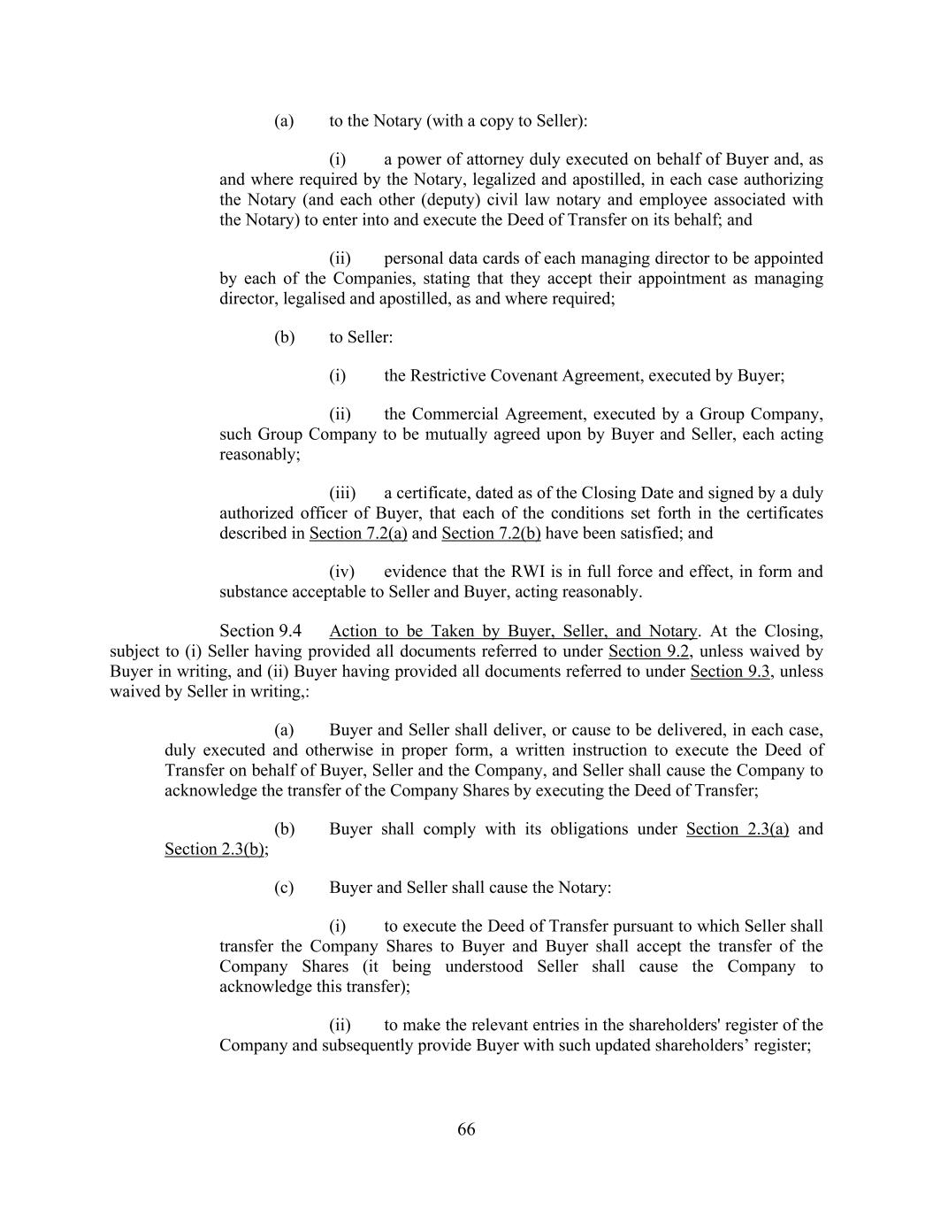 66 (a) to the Notary (with a copy to Seller): (i) a power of attorney duly executed on behalf of Buyer and, as and where required by the Notary, legalized and apostilled, in each case authorizing the Notary (and each other (deputy) civil law notary and employee associated with the Notary) to enter into and execute the Deed of Transfer on its behalf; and (ii) personal data cards of each managing director to be appointed by each of the Companies, stating that they accept their appointment as managing director, legalised and apostilled, as and where required; (b) to Seller: (i) the Restrictive Covenant Agreement, executed by Buyer; (ii) the Commercial Agreement, executed by a Group Company, such Group Company to be mutually agreed upon by Buyer and Seller, each acting reasonably; (iii) a certificate, dated as of the Closing Date and signed by a duly authorized officer of Buyer, that each of the conditions set forth in the certificates described in Section 7.2(a) and Section 7.2(b) have been satisfied; and (iv) evidence that the RWI is in full force and effect, in form and substance acceptable to Seller and Buyer, acting reasonably. Section 9.4 Action to be Taken by Buyer, Seller, and Notary. At the Closing, subject to (i) Seller having provided all documents referred to under Section 9.2, unless waived by Buyer in writing, and (ii) Buyer having provided all documents referred to under Section 9.3, unless waived by Seller in writing,: (a) Buyer and Seller shall deliver, or cause to be delivered, in each case, duly executed and otherwise in proper form, a written instruction to execute the Deed of Transfer on behalf of Buyer, Seller and the Company, and Seller shall cause the Company to acknowledge the transfer of the Company Shares by executing the Deed of Transfer; (b) Buyer shall comply with its obligations under Section 2.3(a) and Section 2.3(b); (c) Buyer and Seller shall cause the Notary: (i) to execute the Deed of Transfer pursuant to which Seller shall transfer the Company Shares to Buyer and Buyer shall accept the transfer of the Company Shares (it being understood Seller shall cause the Company to acknowledge this transfer); (ii) to make the relevant entries in the shareholders' register of the Company and subsequently provide Buyer with such updated shareholders’ register;