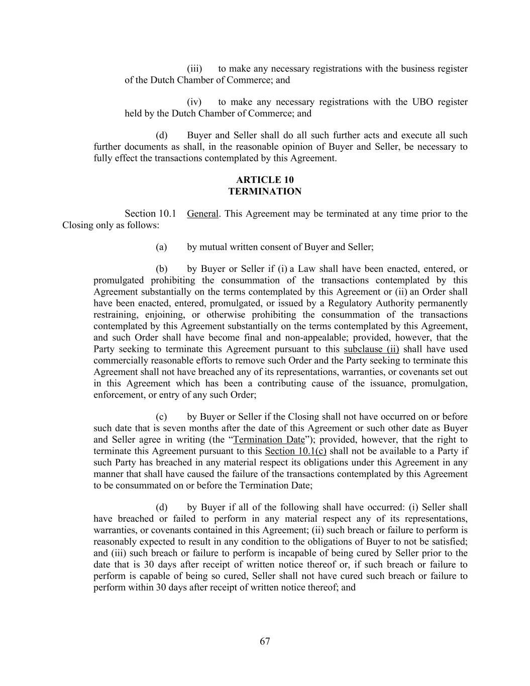 67 (iii) to make any necessary registrations with the business register of the Dutch Chamber of Commerce; and (iv) to make any necessary registrations with the UBO register held by the Dutch Chamber of Commerce; and (d) Buyer and Seller shall do all such further acts and execute all such further documents as shall, in the reasonable opinion of Buyer and Seller, be necessary to fully effect the transactions contemplated by this Agreement. ARTICLE 10 TERMINATION Section 10.1 General. This Agreement may be terminated at any time prior to the Closing only as follows: (a) by mutual written consent of Buyer and Seller; (b) by Buyer or Seller if (i) a Law shall have been enacted, entered, or promulgated prohibiting the consummation of the transactions contemplated by this Agreement substantially on the terms contemplated by this Agreement or (ii) an Order shall have been enacted, entered, promulgated, or issued by a Regulatory Authority permanently restraining, enjoining, or otherwise prohibiting the consummation of the transactions contemplated by this Agreement substantially on the terms contemplated by this Agreement, and such Order shall have become final and non-appealable; provided, however, that the Party seeking to terminate this Agreement pursuant to this subclause (ii) shall have used commercially reasonable efforts to remove such Order and the Party seeking to terminate this Agreement shall not have breached any of its representations, warranties, or covenants set out in this Agreement which has been a contributing cause of the issuance, promulgation, enforcement, or entry of any such Order; (c) by Buyer or Seller if the Closing shall not have occurred on or before such date that is seven months after the date of this Agreement or such other date as Buyer and Seller agree in writing (the “Termination Date”); provided, however, that the right to terminate this Agreement pursuant to this Section 10.1(c) shall not be available to a Party if such Party has breached in any material respect its obligations under this Agreement in any manner that shall have caused the failure of the transactions contemplated by this Agreement to be consummated on or before the Termination Date; (d) by Buyer if all of the following shall have occurred: (i) Seller shall have breached or failed to perform in any material respect any of its representations, warranties, or covenants contained in this Agreement; (ii) such breach or failure to perform is reasonably expected to result in any condition to the obligations of Buyer to not be satisfied; and (iii) such breach or failure to perform is incapable of being cured by Seller prior to the date that is 30 days after receipt of written notice thereof or, if such breach or failure to perform is capable of being so cured, Seller shall not have cured such breach or failure to perform within 30 days after receipt of written notice thereof; and