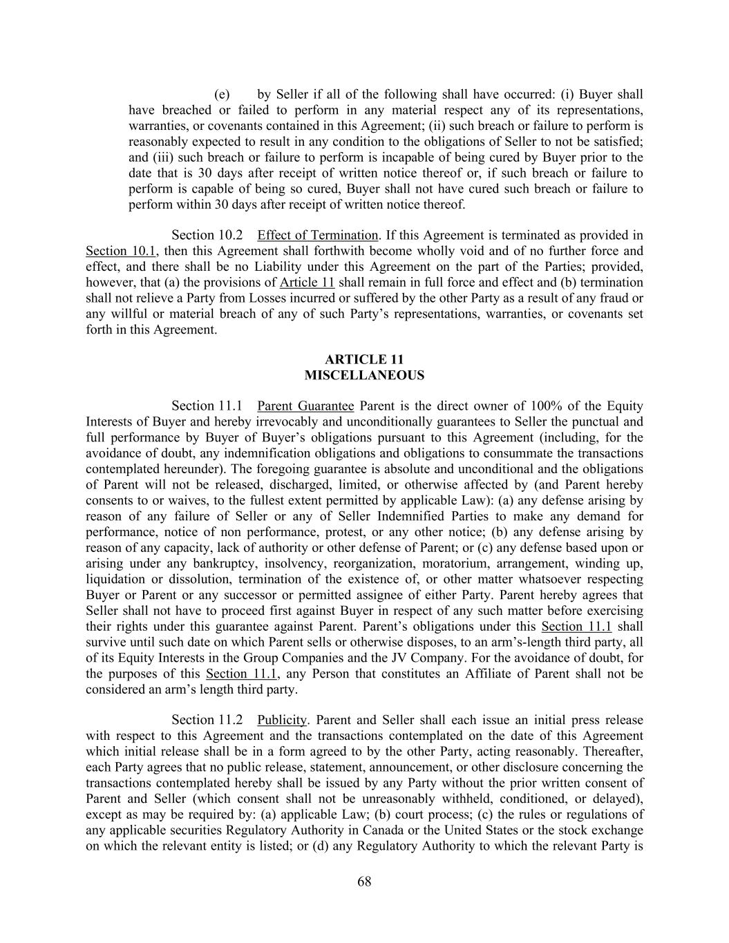 68 (e) by Seller if all of the following shall have occurred: (i) Buyer shall have breached or failed to perform in any material respect any of its representations, warranties, or covenants contained in this Agreement; (ii) such breach or failure to perform is reasonably expected to result in any condition to the obligations of Seller to not be satisfied; and (iii) such breach or failure to perform is incapable of being cured by Buyer prior to the date that is 30 days after receipt of written notice thereof or, if such breach or failure to perform is capable of being so cured, Buyer shall not have cured such breach or failure to perform within 30 days after receipt of written notice thereof. Section 10.2 Effect of Termination. If this Agreement is terminated as provided in Section 10.1, then this Agreement shall forthwith become wholly void and of no further force and effect, and there shall be no Liability under this Agreement on the part of the Parties; provided, however, that (a) the provisions of Article 11 shall remain in full force and effect and (b) termination shall not relieve a Party from Losses incurred or suffered by the other Party as a result of any fraud or any willful or material breach of any of such Party’s representations, warranties, or covenants set forth in this Agreement. ARTICLE 11 MISCELLANEOUS Section 11.1 Parent Guarantee Parent is the direct owner of 100% of the Equity Interests of Buyer and hereby irrevocably and unconditionally guarantees to Seller the punctual and full performance by Buyer of Buyer’s obligations pursuant to this Agreement (including, for the avoidance of doubt, any indemnification obligations and obligations to consummate the transactions contemplated hereunder). The foregoing guarantee is absolute and unconditional and the obligations of Parent will not be released, discharged, limited, or otherwise affected by (and Parent hereby consents to or waives, to the fullest extent permitted by applicable Law): (a) any defense arising by reason of any failure of Seller or any of Seller Indemnified Parties to make any demand for performance, notice of non performance, protest, or any other notice; (b) any defense arising by reason of any capacity, lack of authority or other defense of Parent; or (c) any defense based upon or arising under any bankruptcy, insolvency, reorganization, moratorium, arrangement, winding up, liquidation or dissolution, termination of the existence of, or other matter whatsoever respecting Buyer or Parent or any successor or permitted assignee of either Party. Parent hereby agrees that Seller shall not have to proceed first against Buyer in respect of any such matter before exercising their rights under this guarantee against Parent. Parent’s obligations under this Section 11.1 shall survive until such date on which Parent sells or otherwise disposes, to an arm’s-length third party, all of its Equity Interests in the Group Companies and the JV Company. For the avoidance of doubt, for the purposes of this Section 11.1, any Person that constitutes an Affiliate of Parent shall not be considered an arm’s length third party. Section 11.2 Publicity. Parent and Seller shall each issue an initial press release with respect to this Agreement and the transactions contemplated on the date of this Agreement which initial release shall be in a form agreed to by the other Party, acting reasonably. Thereafter, each Party agrees that no public release, statement, announcement, or other disclosure concerning the transactions contemplated hereby shall be issued by any Party without the prior written consent of Parent and Seller (which consent shall not be unreasonably withheld, conditioned, or delayed), except as may be required by: (a) applicable Law; (b) court process; (c) the rules or regulations of any applicable securities Regulatory Authority in Canada or the United States or the stock exchange on which the relevant entity is listed; or (d) any Regulatory Authority to which the relevant Party is