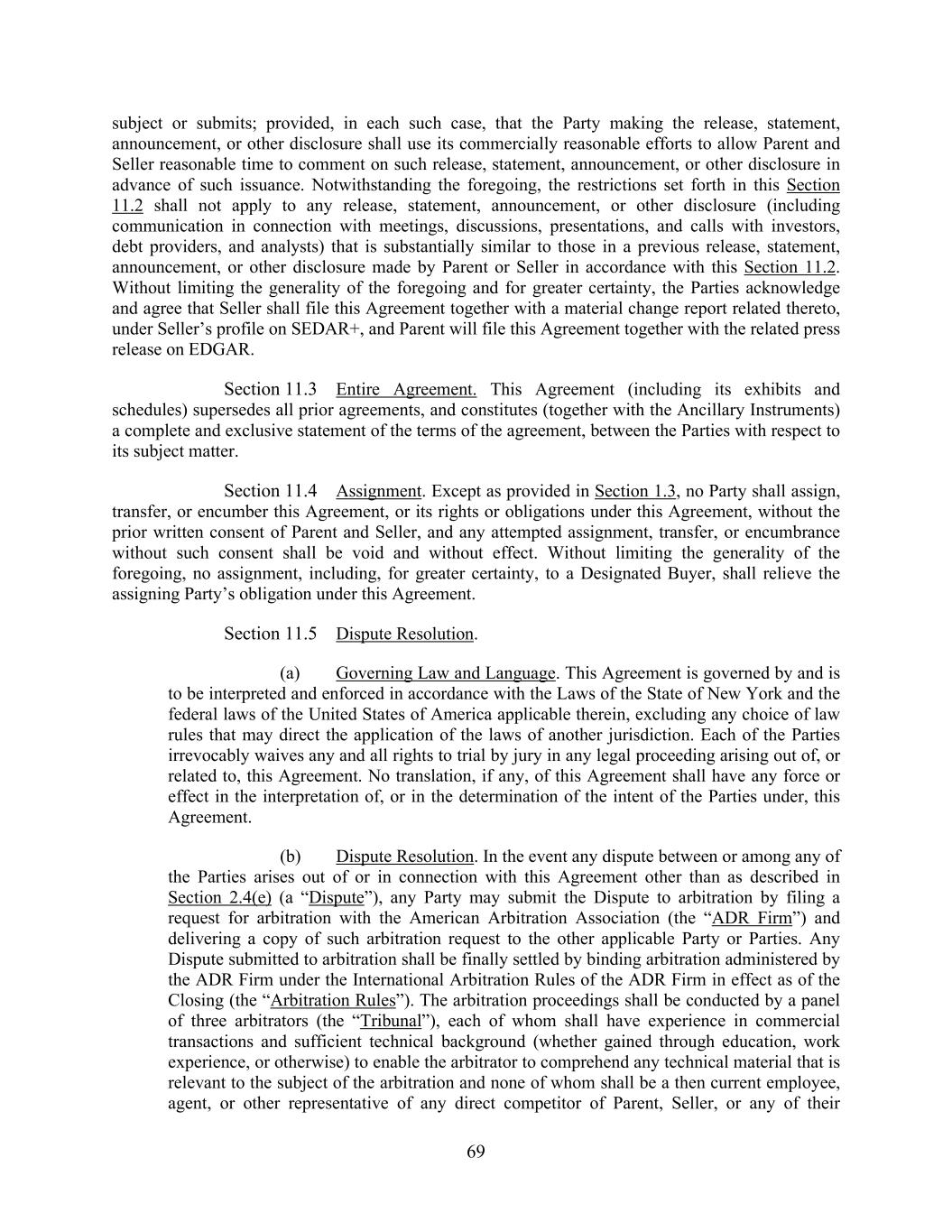 69 subject or submits; provided, in each such case, that the Party making the release, statement, announcement, or other disclosure shall use its commercially reasonable efforts to allow Parent and Seller reasonable time to comment on such release, statement, announcement, or other disclosure in advance of such issuance. Notwithstanding the foregoing, the restrictions set forth in this Section 11.2 shall not apply to any release, statement, announcement, or other disclosure (including communication in connection with meetings, discussions, presentations, and calls with investors, debt providers, and analysts) that is substantially similar to those in a previous release, statement, announcement, or other disclosure made by Parent or Seller in accordance with this Section 11.2. Without limiting the generality of the foregoing and for greater certainty, the Parties acknowledge and agree that Seller shall file this Agreement together with a material change report related thereto, under Seller’s profile on SEDAR+, and Parent will file this Agreement together with the related press release on EDGAR. Section 11.3 Entire Agreement. This Agreement (including its exhibits and schedules) supersedes all prior agreements, and constitutes (together with the Ancillary Instruments) a complete and exclusive statement of the terms of the agreement, between the Parties with respect to its subject matter. Section 11.4 Assignment. Except as provided in Section 1.3, no Party shall assign, transfer, or encumber this Agreement, or its rights or obligations under this Agreement, without the prior written consent of Parent and Seller, and any attempted assignment, transfer, or encumbrance without such consent shall be void and without effect. Without limiting the generality of the foregoing, no assignment, including, for greater certainty, to a Designated Buyer, shall relieve the assigning Party’s obligation under this Agreement. Section 11.5 Dispute Resolution. (a) Governing Law and Language. This Agreement is governed by and is to be interpreted and enforced in accordance with the Laws of the State of New York and the federal laws of the United States of America applicable therein, excluding any choice of law rules that may direct the application of the laws of another jurisdiction. Each of the Parties irrevocably waives any and all rights to trial by jury in any legal proceeding arising out of, or related to, this Agreement. No translation, if any, of this Agreement shall have any force or effect in the interpretation of, or in the determination of the intent of the Parties under, this Agreement. (b) Dispute Resolution. In the event any dispute between or among any of the Parties arises out of or in connection with this Agreement other than as described in Section 2.4(e) (a “Dispute”), any Party may submit the Dispute to arbitration by filing a request for arbitration with the American Arbitration Association (the “ADR Firm”) and delivering a copy of such arbitration request to the other applicable Party or Parties. Any Dispute submitted to arbitration shall be finally settled by binding arbitration administered by the ADR Firm under the International Arbitration Rules of the ADR Firm in effect as of the Closing (the “Arbitration Rules”). The arbitration proceedings shall be conducted by a panel of three arbitrators (the “Tribunal”), each of whom shall have experience in commercial transactions and sufficient technical background (whether gained through education, work experience, or otherwise) to enable the arbitrator to comprehend any technical material that is relevant to the subject of the arbitration and none of whom shall be a then current employee, agent, or other representative of any direct competitor of Parent, Seller, or any of their