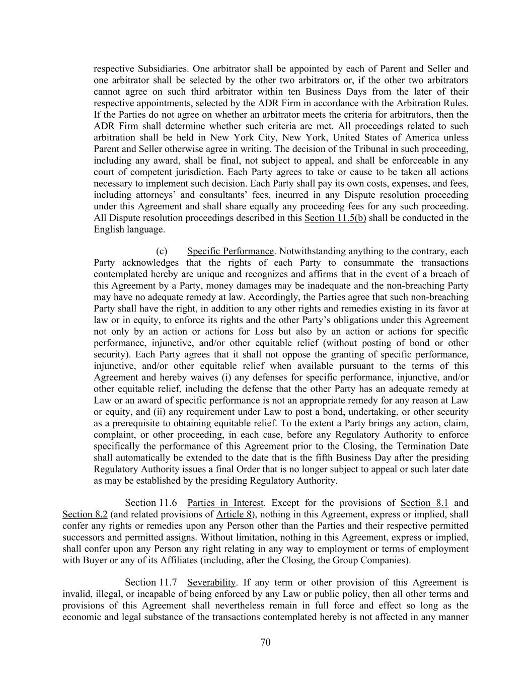 70 respective Subsidiaries. One arbitrator shall be appointed by each of Parent and Seller and one arbitrator shall be selected by the other two arbitrators or, if the other two arbitrators cannot agree on such third arbitrator within ten Business Days from the later of their respective appointments, selected by the ADR Firm in accordance with the Arbitration Rules. If the Parties do not agree on whether an arbitrator meets the criteria for arbitrators, then the ADR Firm shall determine whether such criteria are met. All proceedings related to such arbitration shall be held in New York City, New York, United States of America unless Parent and Seller otherwise agree in writing. The decision of the Tribunal in such proceeding, including any award, shall be final, not subject to appeal, and shall be enforceable in any court of competent jurisdiction. Each Party agrees to take or cause to be taken all actions necessary to implement such decision. Each Party shall pay its own costs, expenses, and fees, including attorneys’ and consultants’ fees, incurred in any Dispute resolution proceeding under this Agreement and shall share equally any proceeding fees for any such proceeding. All Dispute resolution proceedings described in this Section 11.5(b) shall be conducted in the English language. (c) Specific Performance. Notwithstanding anything to the contrary, each Party acknowledges that the rights of each Party to consummate the transactions contemplated hereby are unique and recognizes and affirms that in the event of a breach of this Agreement by a Party, money damages may be inadequate and the non-breaching Party may have no adequate remedy at law. Accordingly, the Parties agree that such non-breaching Party shall have the right, in addition to any other rights and remedies existing in its favor at law or in equity, to enforce its rights and the other Party’s obligations under this Agreement not only by an action or actions for Loss but also by an action or actions for specific performance, injunctive, and/or other equitable relief (without posting of bond or other security). Each Party agrees that it shall not oppose the granting of specific performance, injunctive, and/or other equitable relief when available pursuant to the terms of this Agreement and hereby waives (i) any defenses for specific performance, injunctive, and/or other equitable relief, including the defense that the other Party has an adequate remedy at Law or an award of specific performance is not an appropriate remedy for any reason at Law or equity, and (ii) any requirement under Law to post a bond, undertaking, or other security as a prerequisite to obtaining equitable relief. To the extent a Party brings any action, claim, complaint, or other proceeding, in each case, before any Regulatory Authority to enforce specifically the performance of this Agreement prior to the Closing, the Termination Date shall automatically be extended to the date that is the fifth Business Day after the presiding Regulatory Authority issues a final Order that is no longer subject to appeal or such later date as may be established by the presiding Regulatory Authority. Section 11.6 Parties in Interest. Except for the provisions of Section 8.1 and Section 8.2 (and related provisions of Article 8), nothing in this Agreement, express or implied, shall confer any rights or remedies upon any Person other than the Parties and their respective permitted successors and permitted assigns. Without limitation, nothing in this Agreement, express or implied, shall confer upon any Person any right relating in any way to employment or terms of employment with Buyer or any of its Affiliates (including, after the Closing, the Group Companies). Section 11.7 Severability. If any term or other provision of this Agreement is invalid, illegal, or incapable of being enforced by any Law or public policy, then all other terms and provisions of this Agreement shall nevertheless remain in full force and effect so long as the economic and legal substance of the transactions contemplated hereby is not affected in any manner