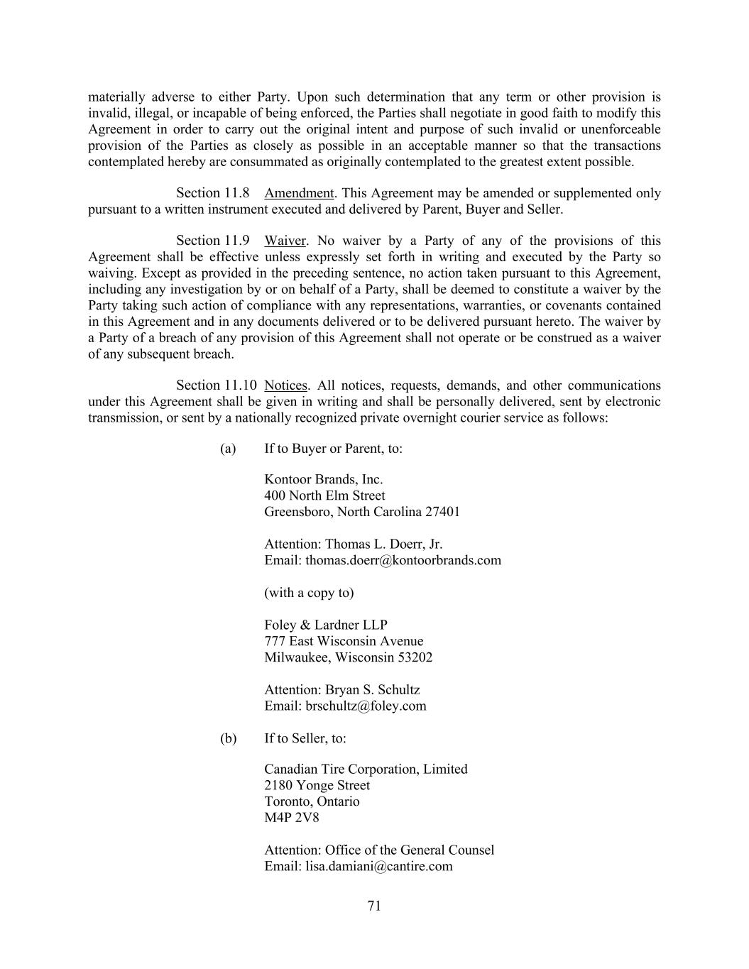 71 materially adverse to either Party. Upon such determination that any term or other provision is invalid, illegal, or incapable of being enforced, the Parties shall negotiate in good faith to modify this Agreement in order to carry out the original intent and purpose of such invalid or unenforceable provision of the Parties as closely as possible in an acceptable manner so that the transactions contemplated hereby are consummated as originally contemplated to the greatest extent possible. Section 11.8 Amendment. This Agreement may be amended or supplemented only pursuant to a written instrument executed and delivered by Parent, Buyer and Seller. Section 11.9 Waiver. No waiver by a Party of any of the provisions of this Agreement shall be effective unless expressly set forth in writing and executed by the Party so waiving. Except as provided in the preceding sentence, no action taken pursuant to this Agreement, including any investigation by or on behalf of a Party, shall be deemed to constitute a waiver by the Party taking such action of compliance with any representations, warranties, or covenants contained in this Agreement and in any documents delivered or to be delivered pursuant hereto. The waiver by a Party of a breach of any provision of this Agreement shall not operate or be construed as a waiver of any subsequent breach. Section 11.10 Notices. All notices, requests, demands, and other communications under this Agreement shall be given in writing and shall be personally delivered, sent by electronic transmission, or sent by a nationally recognized private overnight courier service as follows: (a) If to Buyer or Parent, to: Kontoor Brands, Inc. 400 North Elm Street Greensboro, North Carolina 27401 Attention: Thomas L. Doerr, Jr. Email: thomas.doerr@kontoorbrands.com (with a copy to) Foley & Lardner LLP 777 East Wisconsin Avenue Milwaukee, Wisconsin 53202 Attention: Bryan S. Schultz Email: brschultz@foley.com (b) If to Seller, to: Canadian Tire Corporation, Limited 2180 Yonge Street Toronto, Ontario M4P 2V8 Attention: Office of the General Counsel Email: lisa.damiani@cantire.com