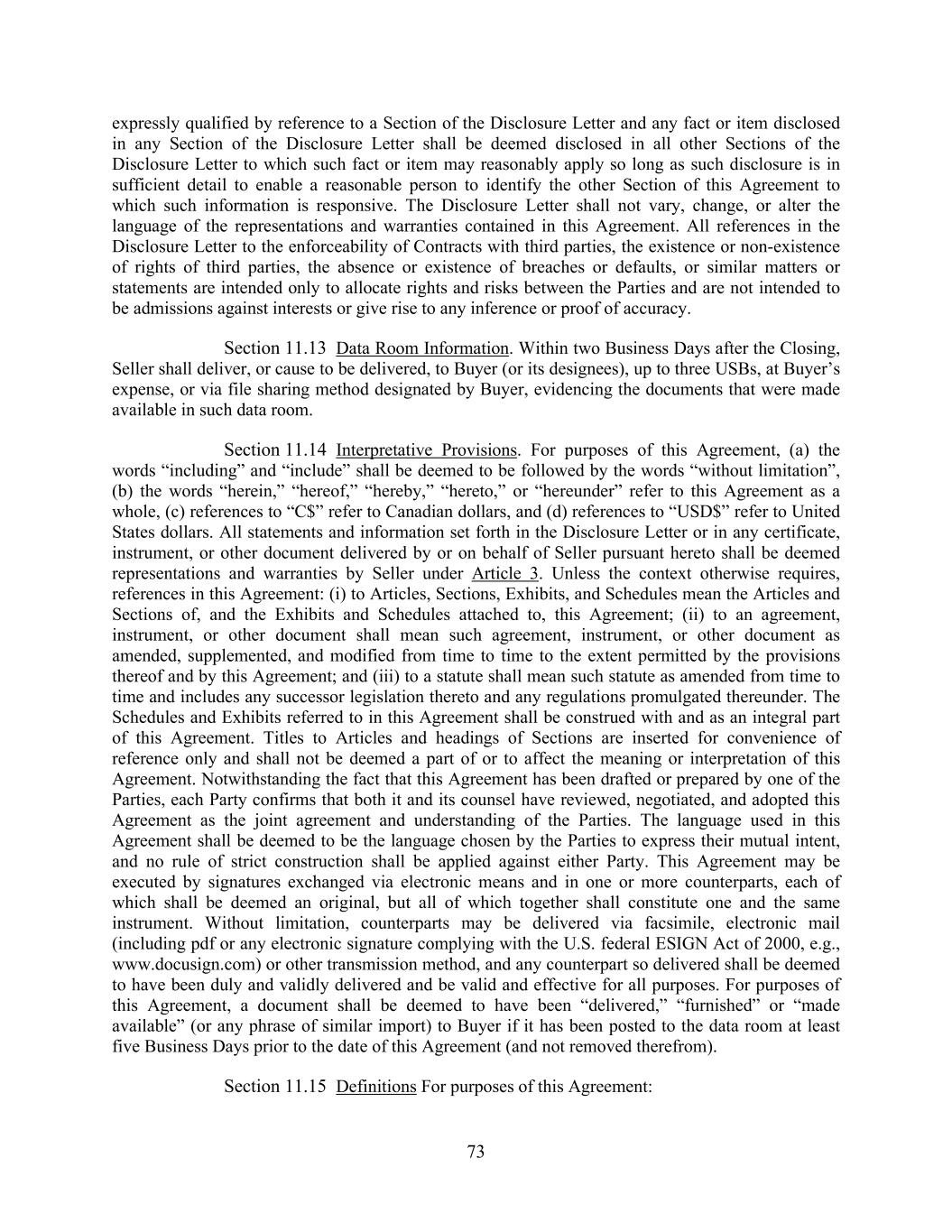 73 expressly qualified by reference to a Section of the Disclosure Letter and any fact or item disclosed in any Section of the Disclosure Letter shall be deemed disclosed in all other Sections of the Disclosure Letter to which such fact or item may reasonably apply so long as such disclosure is in sufficient detail to enable a reasonable person to identify the other Section of this Agreement to which such information is responsive. The Disclosure Letter shall not vary, change, or alter the language of the representations and warranties contained in this Agreement. All references in the Disclosure Letter to the enforceability of Contracts with third parties, the existence or non-existence of rights of third parties, the absence or existence of breaches or defaults, or similar matters or statements are intended only to allocate rights and risks between the Parties and are not intended to be admissions against interests or give rise to any inference or proof of accuracy. Section 11.13 Data Room Information. Within two Business Days after the Closing, Seller shall deliver, or cause to be delivered, to Buyer (or its designees), up to three USBs, at Buyer’s expense, or via file sharing method designated by Buyer, evidencing the documents that were made available in such data room. Section 11.14 Interpretative Provisions. For purposes of this Agreement, (a) the words “including” and “include” shall be deemed to be followed by the words “without limitation”, (b) the words “herein,” “hereof,” “hereby,” “hereto,” or “hereunder” refer to this Agreement as a whole, (c) references to “C$” refer to Canadian dollars, and (d) references to “USD$” refer to United States dollars. All statements and information set forth in the Disclosure Letter or in any certificate, instrument, or other document delivered by or on behalf of Seller pursuant hereto shall be deemed representations and warranties by Seller under Article 3. Unless the context otherwise requires, references in this Agreement: (i) to Articles, Sections, Exhibits, and Schedules mean the Articles and Sections of, and the Exhibits and Schedules attached to, this Agreement; (ii) to an agreement, instrument, or other document shall mean such agreement, instrument, or other document as amended, supplemented, and modified from time to time to the extent permitted by the provisions thereof and by this Agreement; and (iii) to a statute shall mean such statute as amended from time to time and includes any successor legislation thereto and any regulations promulgated thereunder. The Schedules and Exhibits referred to in this Agreement shall be construed with and as an integral part of this Agreement. Titles to Articles and headings of Sections are inserted for convenience of reference only and shall not be deemed a part of or to affect the meaning or interpretation of this Agreement. Notwithstanding the fact that this Agreement has been drafted or prepared by one of the Parties, each Party confirms that both it and its counsel have reviewed, negotiated, and adopted this Agreement as the joint agreement and understanding of the Parties. The language used in this Agreement shall be deemed to be the language chosen by the Parties to express their mutual intent, and no rule of strict construction shall be applied against either Party. This Agreement may be executed by signatures exchanged via electronic means and in one or more counterparts, each of which shall be deemed an original, but all of which together shall constitute one and the same instrument. Without limitation, counterparts may be delivered via facsimile, electronic mail (including pdf or any electronic signature complying with the U.S. federal ESIGN Act of 2000, e.g., www.docusign.com) or other transmission method, and any counterpart so delivered shall be deemed to have been duly and validly delivered and be valid and effective for all purposes. For purposes of this Agreement, a document shall be deemed to have been “delivered,” “furnished” or “made available” (or any phrase of similar import) to Buyer if it has been posted to the data room at least five Business Days prior to the date of this Agreement (and not removed therefrom). Section 11.15 Definitions For purposes of this Agreement: