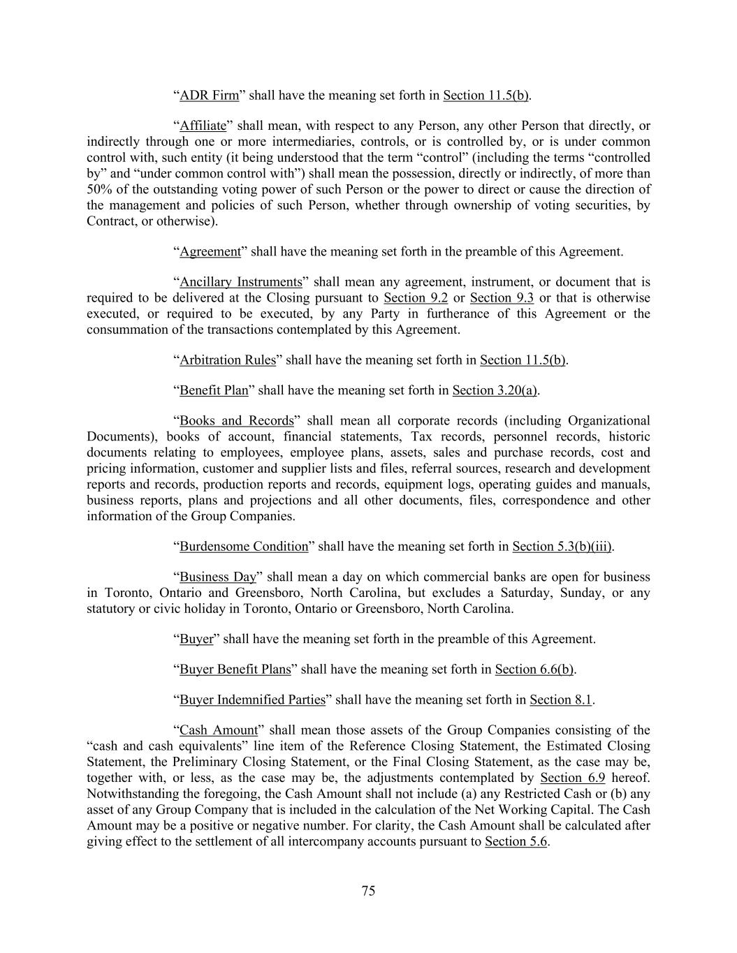 75 “ADR Firm” shall have the meaning set forth in Section 11.5(b). “Affiliate” shall mean, with respect to any Person, any other Person that directly, or indirectly through one or more intermediaries, controls, or is controlled by, or is under common control with, such entity (it being understood that the term “control” (including the terms “controlled by” and “under common control with”) shall mean the possession, directly or indirectly, of more than 50% of the outstanding voting power of such Person or the power to direct or cause the direction of the management and policies of such Person, whether through ownership of voting securities, by Contract, or otherwise). “Agreement” shall have the meaning set forth in the preamble of this Agreement. “Ancillary Instruments” shall mean any agreement, instrument, or document that is required to be delivered at the Closing pursuant to Section 9.2 or Section 9.3 or that is otherwise executed, or required to be executed, by any Party in furtherance of this Agreement or the consummation of the transactions contemplated by this Agreement. “Arbitration Rules” shall have the meaning set forth in Section 11.5(b). “Benefit Plan” shall have the meaning set forth in Section 3.20(a). “Books and Records” shall mean all corporate records (including Organizational Documents), books of account, financial statements, Tax records, personnel records, historic documents relating to employees, employee plans, assets, sales and purchase records, cost and pricing information, customer and supplier lists and files, referral sources, research and development reports and records, production reports and records, equipment logs, operating guides and manuals, business reports, plans and projections and all other documents, files, correspondence and other information of the Group Companies. “Burdensome Condition” shall have the meaning set forth in Section 5.3(b)(iii). “Business Day” shall mean a day on which commercial banks are open for business in Toronto, Ontario and Greensboro, North Carolina, but excludes a Saturday, Sunday, or any statutory or civic holiday in Toronto, Ontario or Greensboro, North Carolina. “Buyer” shall have the meaning set forth in the preamble of this Agreement. “Buyer Benefit Plans” shall have the meaning set forth in Section 6.6(b). “Buyer Indemnified Parties” shall have the meaning set forth in Section 8.1. “Cash Amount” shall mean those assets of the Group Companies consisting of the “cash and cash equivalents” line item of the Reference Closing Statement, the Estimated Closing Statement, the Preliminary Closing Statement, or the Final Closing Statement, as the case may be, together with, or less, as the case may be, the adjustments contemplated by Section 6.9 hereof. Notwithstanding the foregoing, the Cash Amount shall not include (a) any Restricted Cash or (b) any asset of any Group Company that is included in the calculation of the Net Working Capital. The Cash Amount may be a positive or negative number. For clarity, the Cash Amount shall be calculated after giving effect to the settlement of all intercompany accounts pursuant to Section 5.6.
