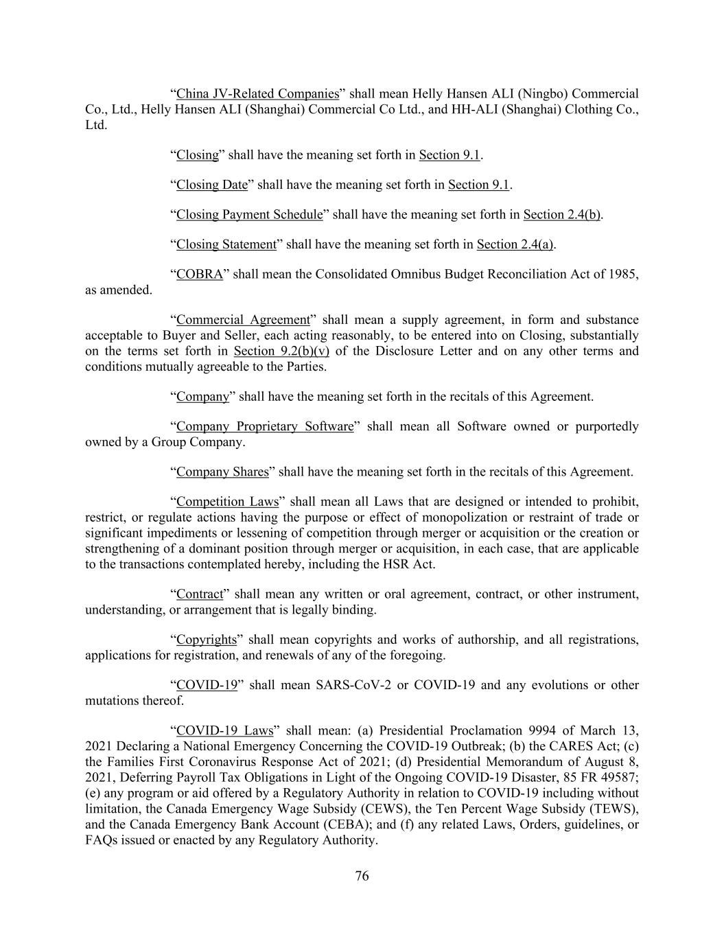 76 “China JV-Related Companies” shall mean Helly Hansen ALI (Ningbo) Commercial Co., Ltd., Helly Hansen ALI (Shanghai) Commercial Co Ltd., and HH-ALI (Shanghai) Clothing Co., Ltd. “Closing” shall have the meaning set forth in Section 9.1. “Closing Date” shall have the meaning set forth in Section 9.1. “Closing Payment Schedule” shall have the meaning set forth in Section 2.4(b). “Closing Statement” shall have the meaning set forth in Section 2.4(a). “COBRA” shall mean the Consolidated Omnibus Budget Reconciliation Act of 1985, as amended. “Commercial Agreement” shall mean a supply agreement, in form and substance acceptable to Buyer and Seller, each acting reasonably, to be entered into on Closing, substantially on the terms set forth in Section 9.2(b)(v) of the Disclosure Letter and on any other terms and conditions mutually agreeable to the Parties. “Company” shall have the meaning set forth in the recitals of this Agreement. “Company Proprietary Software” shall mean all Software owned or purportedly owned by a Group Company. “Company Shares” shall have the meaning set forth in the recitals of this Agreement. “Competition Laws” shall mean all Laws that are designed or intended to prohibit, restrict, or regulate actions having the purpose or effect of monopolization or restraint of trade or significant impediments or lessening of competition through merger or acquisition or the creation or strengthening of a dominant position through merger or acquisition, in each case, that are applicable to the transactions contemplated hereby, including the HSR Act. “Contract” shall mean any written or oral agreement, contract, or other instrument, understanding, or arrangement that is legally binding. “Copyrights” shall mean copyrights and works of authorship, and all registrations, applications for registration, and renewals of any of the foregoing. “COVID-19” shall mean SARS-CoV-2 or COVID-19 and any evolutions or other mutations thereof. “COVID-19 Laws” shall mean: (a) Presidential Proclamation 9994 of March 13, 2021 Declaring a National Emergency Concerning the COVID-19 Outbreak; (b) the CARES Act; (c) the Families First Coronavirus Response Act of 2021; (d) Presidential Memorandum of August 8, 2021, Deferring Payroll Tax Obligations in Light of the Ongoing COVID-19 Disaster, 85 FR 49587; (e) any program or aid offered by a Regulatory Authority in relation to COVID-19 including without limitation, the Canada Emergency Wage Subsidy (CEWS), the Ten Percent Wage Subsidy (TEWS), and the Canada Emergency Bank Account (CEBA); and (f) any related Laws, Orders, guidelines, or FAQs issued or enacted by any Regulatory Authority.